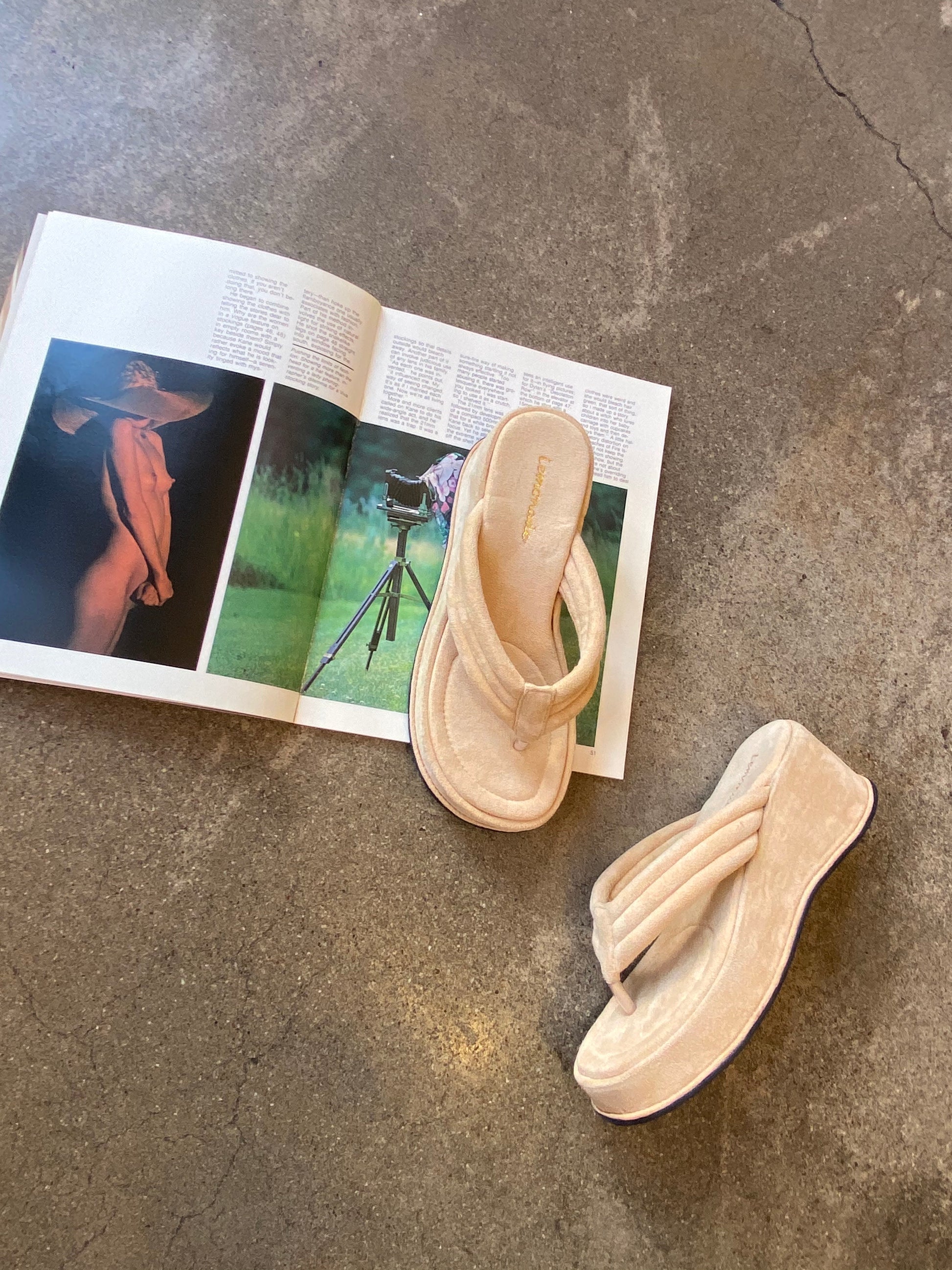 Cute & comfy ‘93 vibes faux micro suede platform flip flops with chunky ribbed straps.