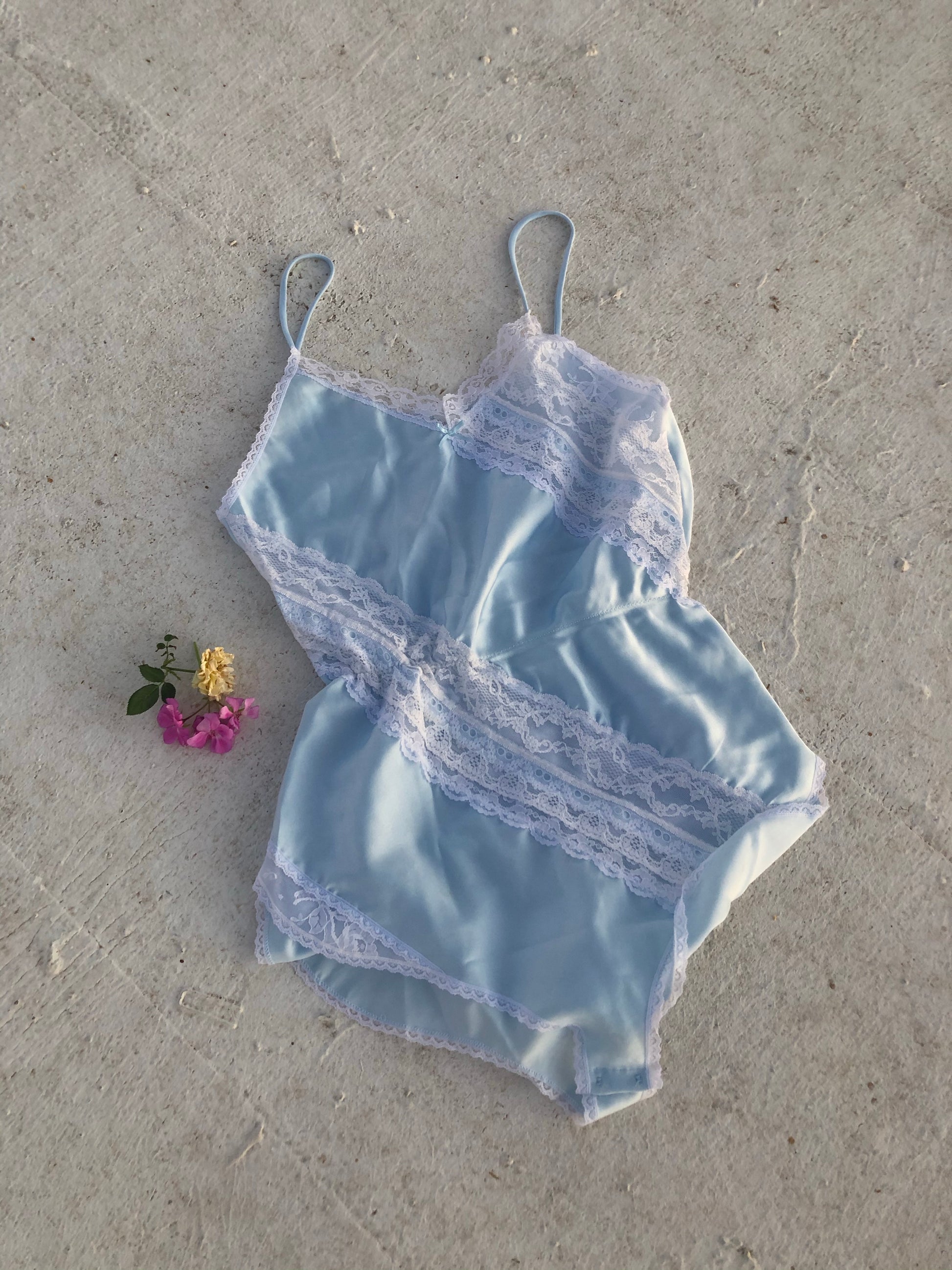 Silky baby blue with lace spaghetti strap vintage 80’s romper