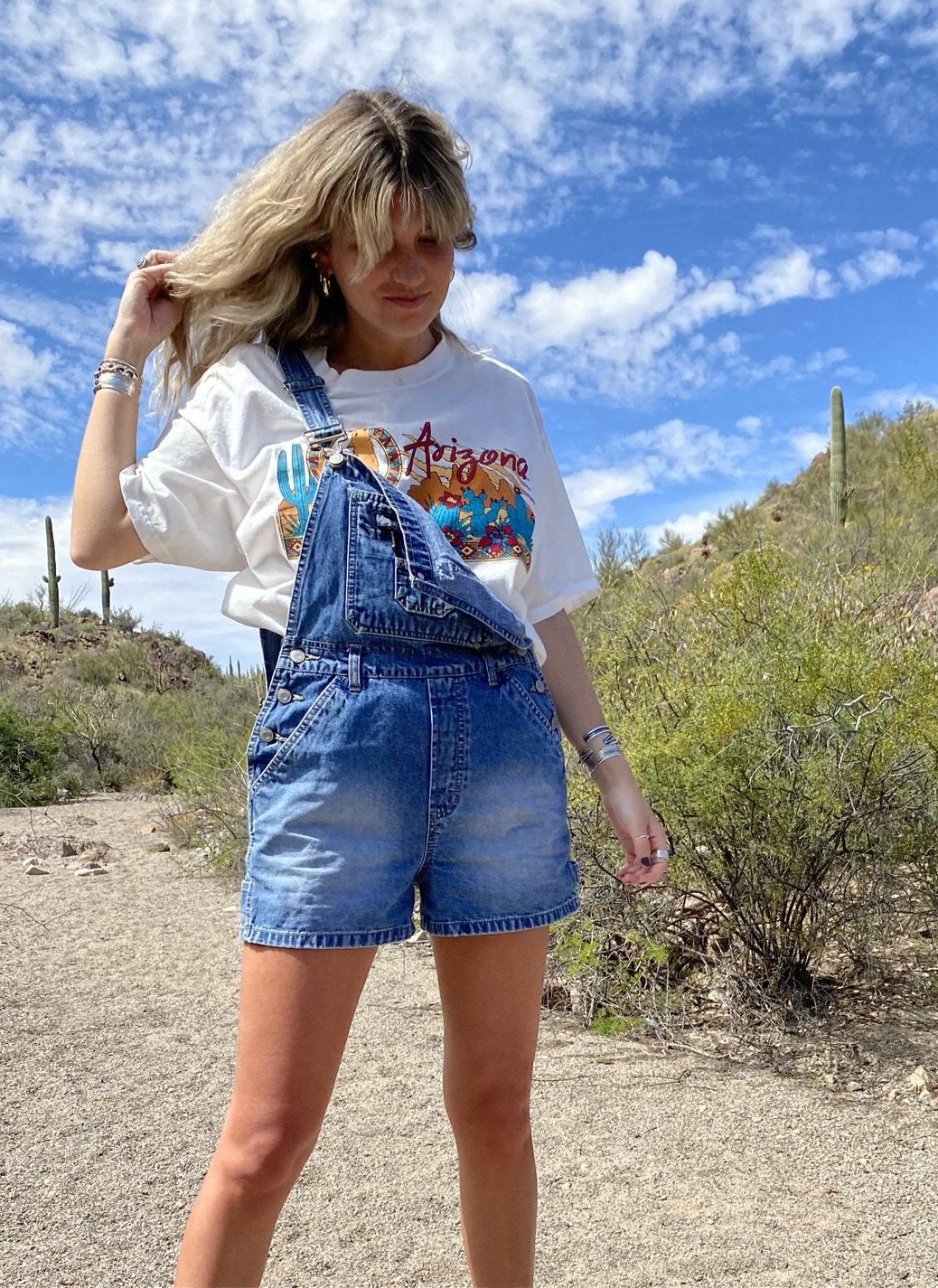 The cutest 90s girl medium wash shorts overalls. Pair with a crop top underneath and some platform sneakers for a fun and comfortable summer vibe.