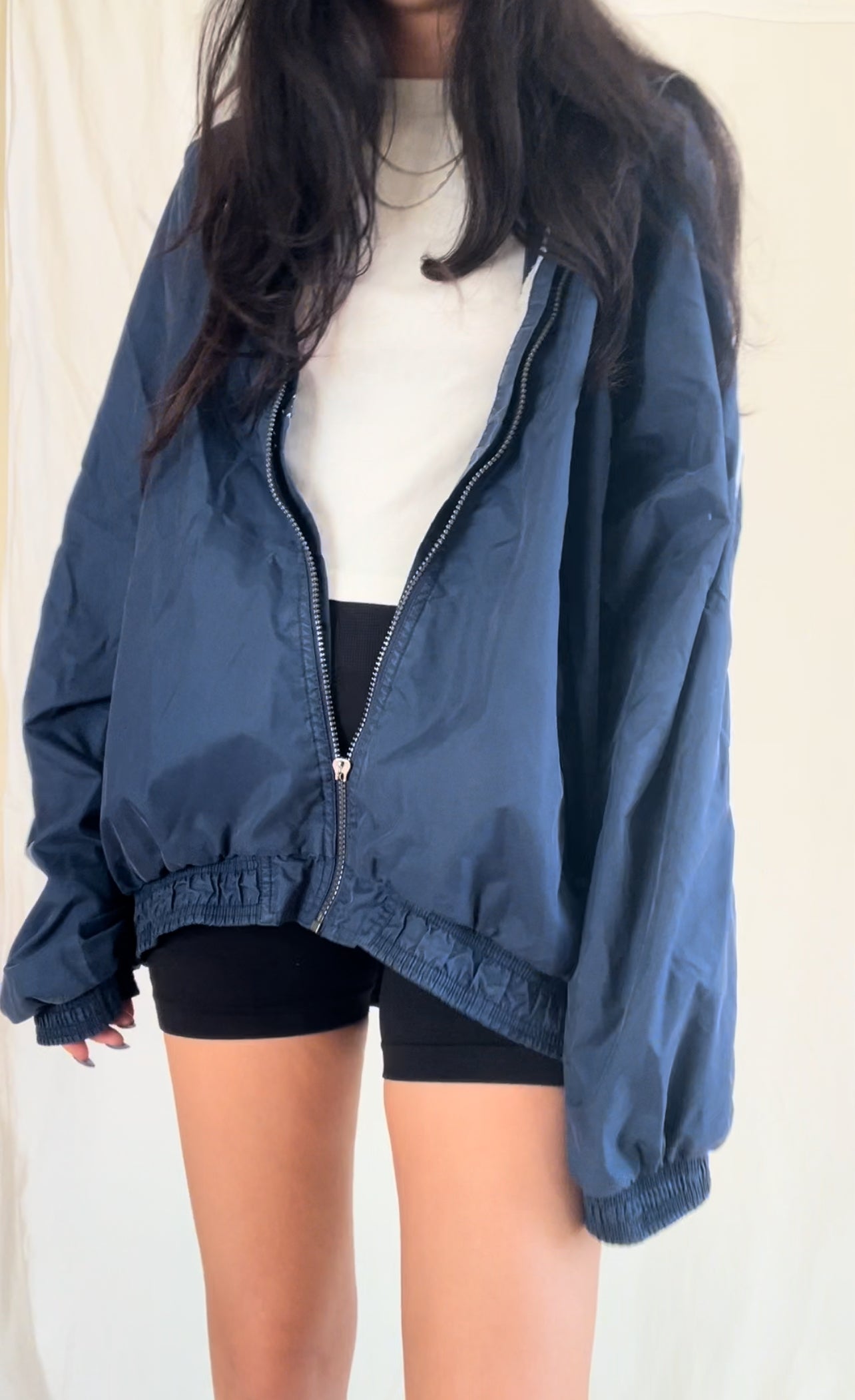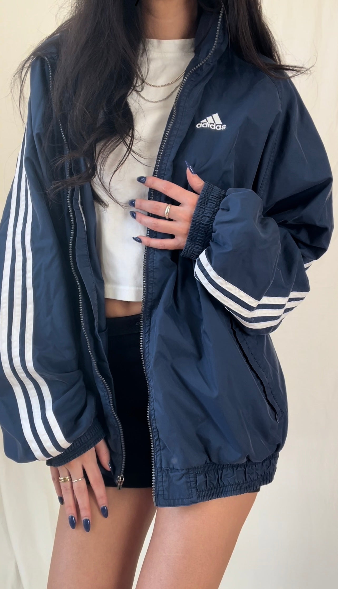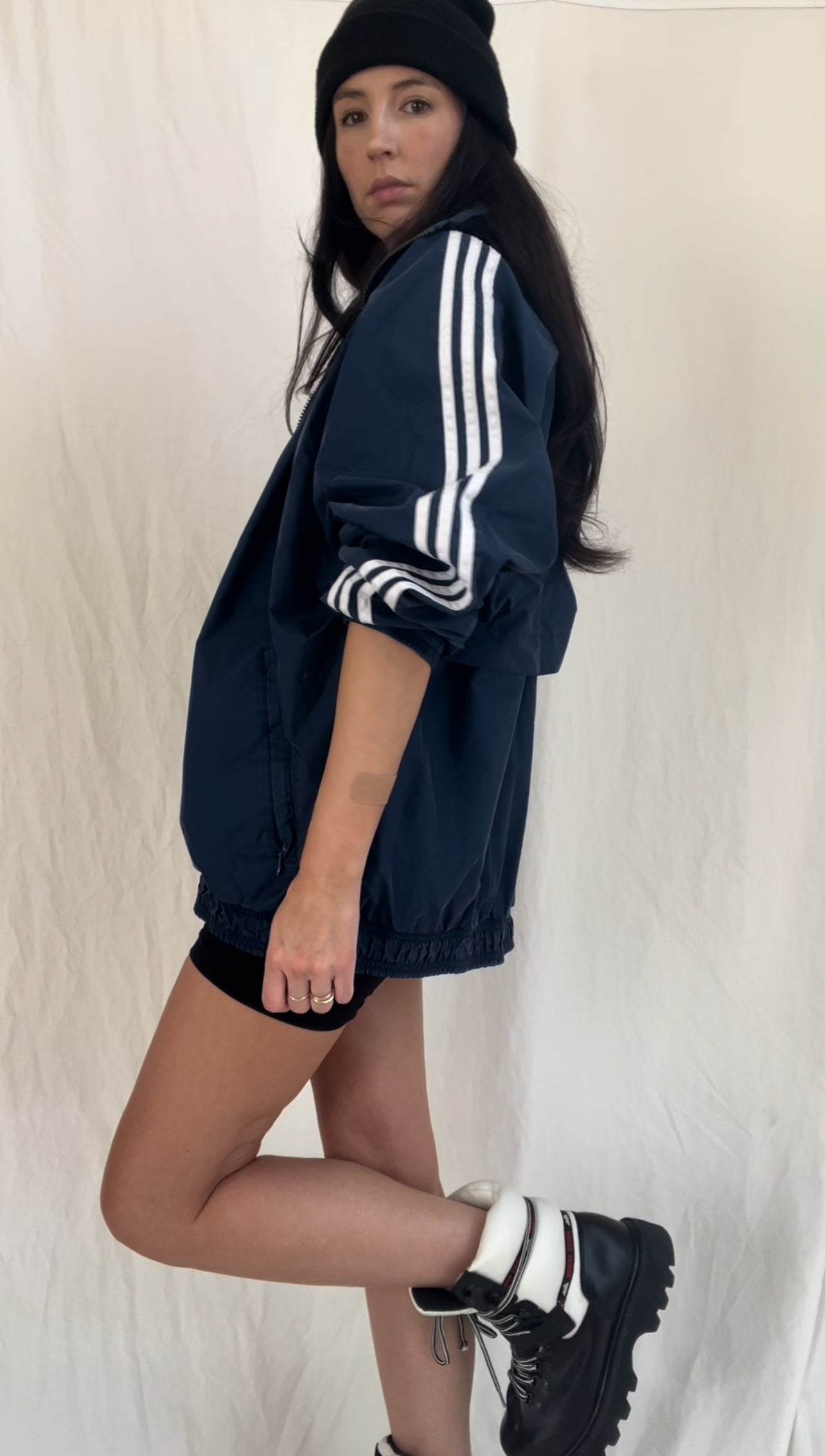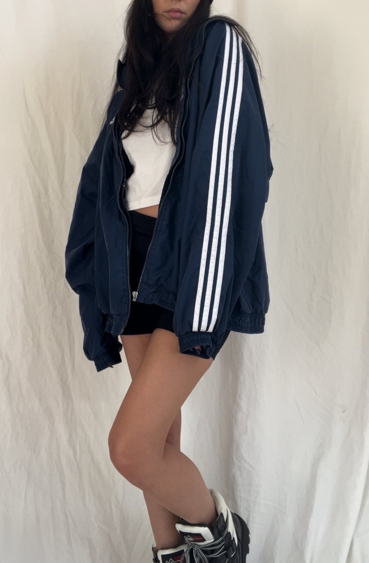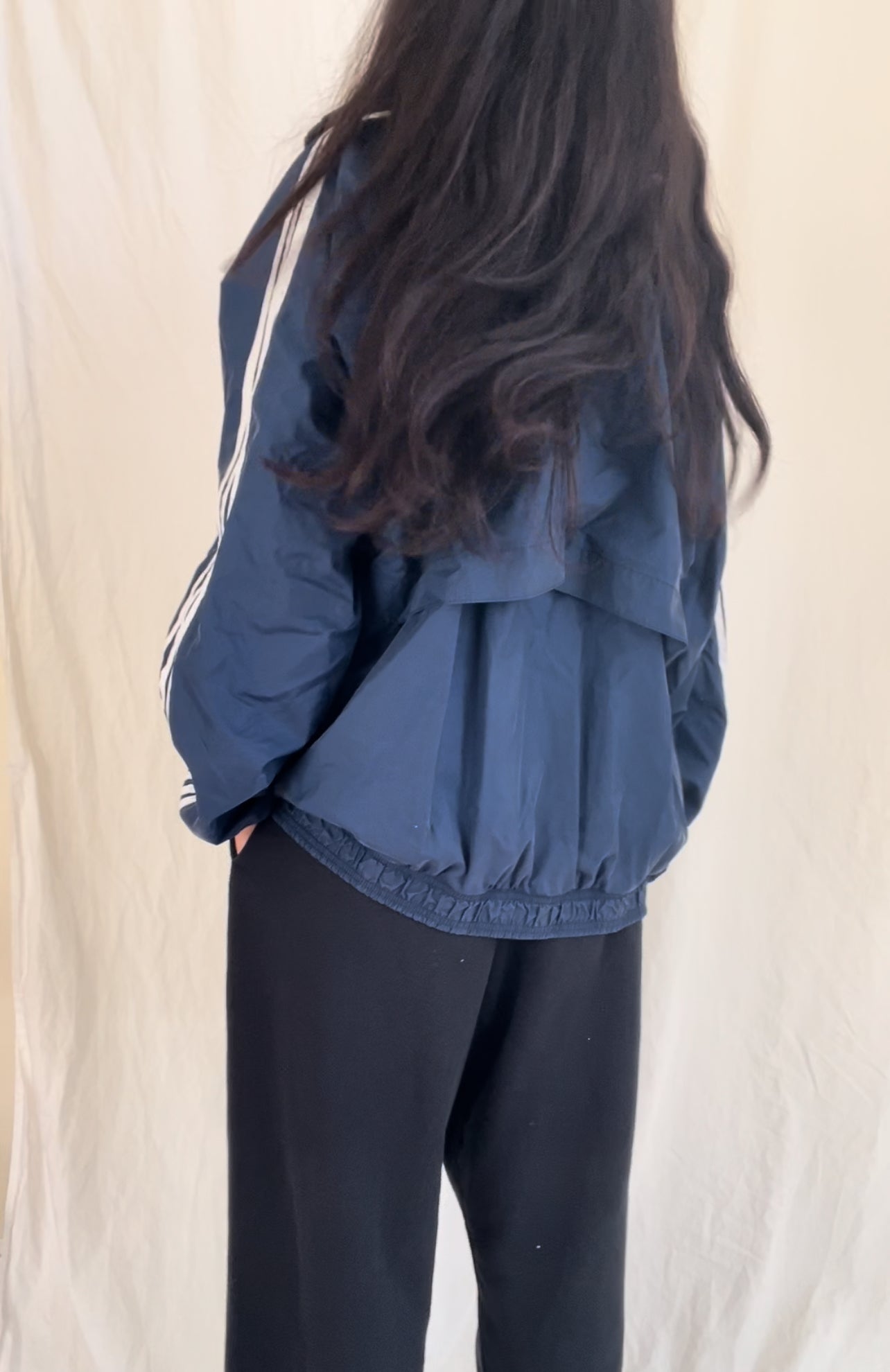 Navy blue 90’s grunge windbreaker with white racing stripes. Featuring a zip in hood, pockets and zipper front closure.