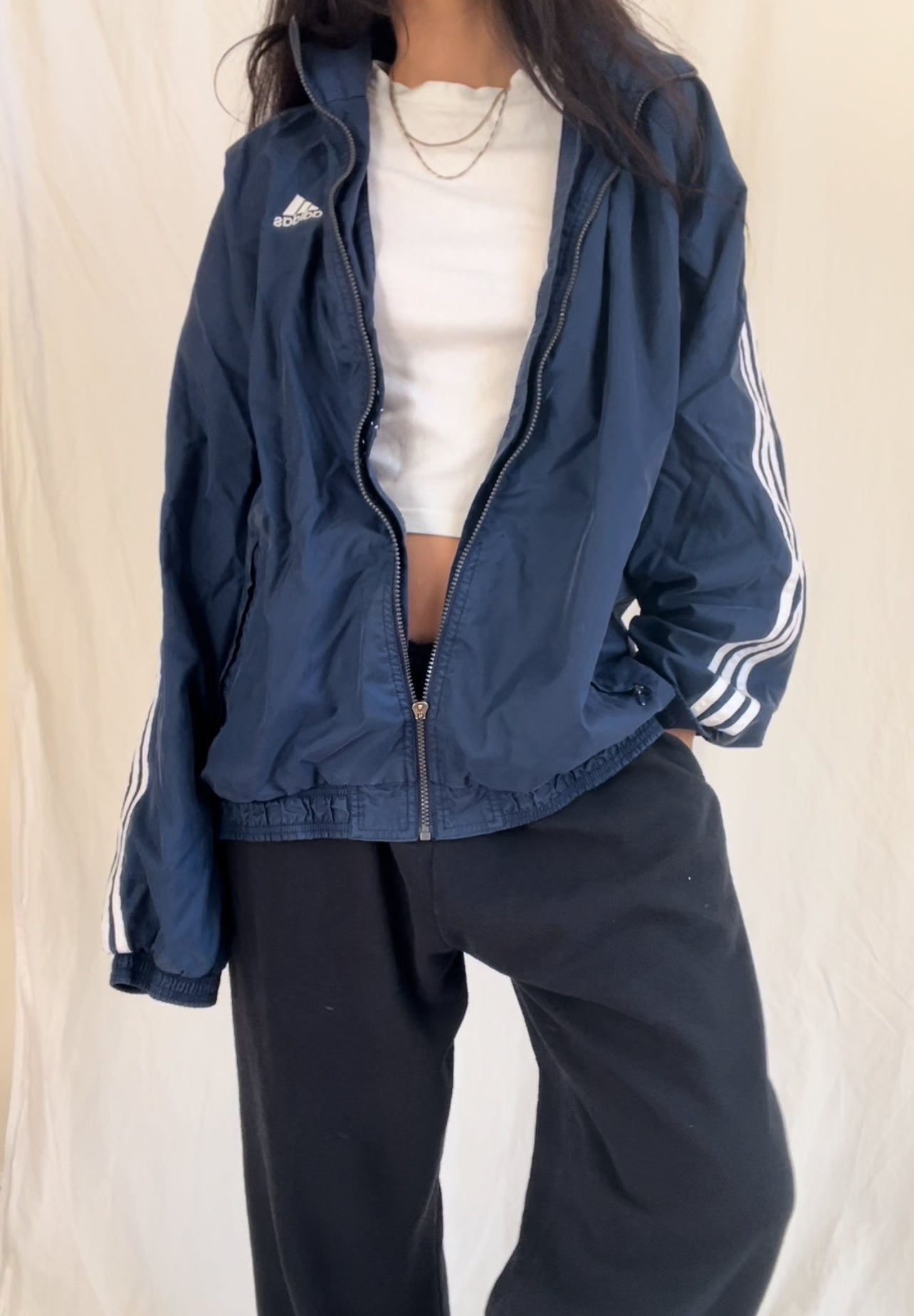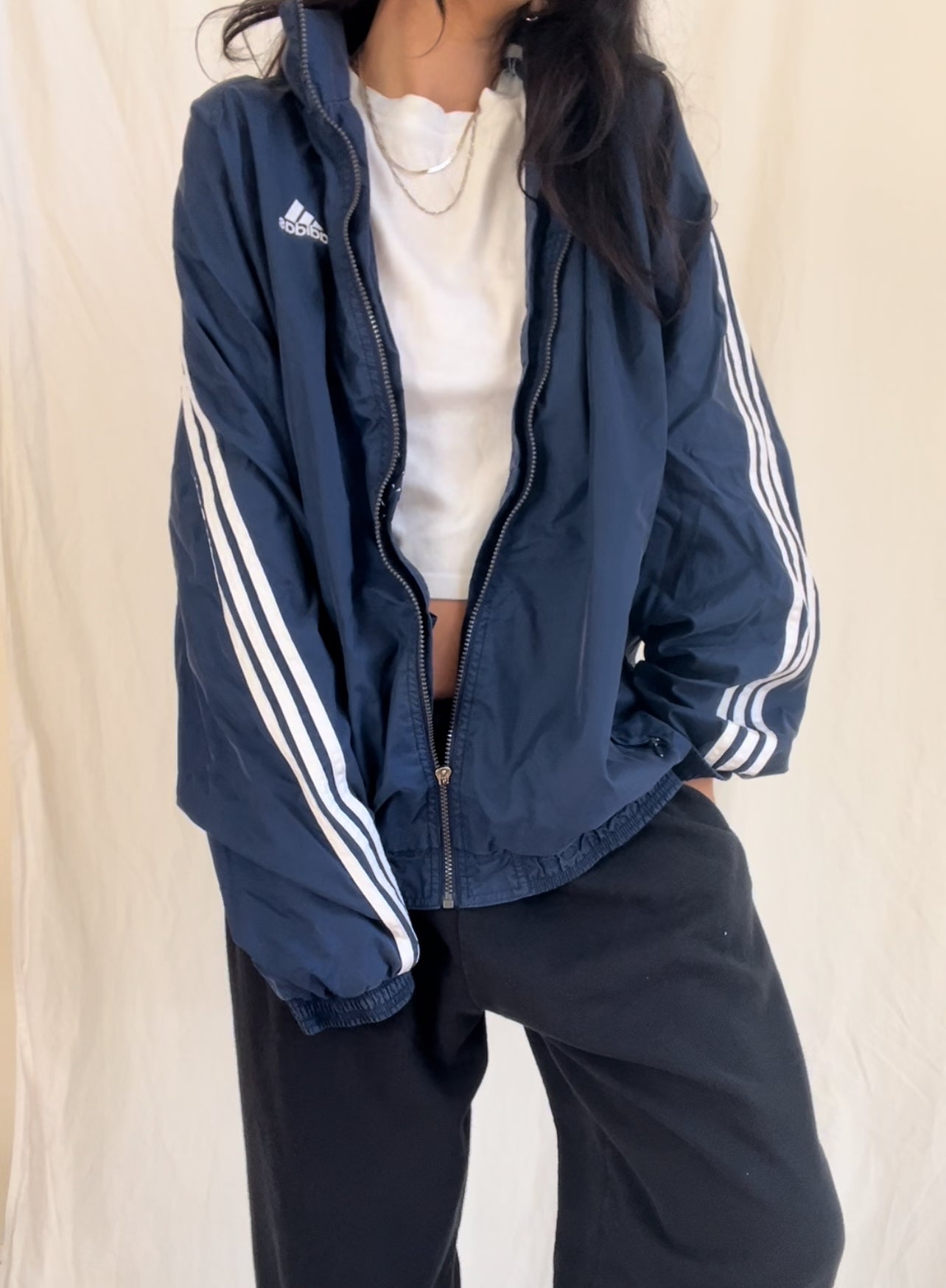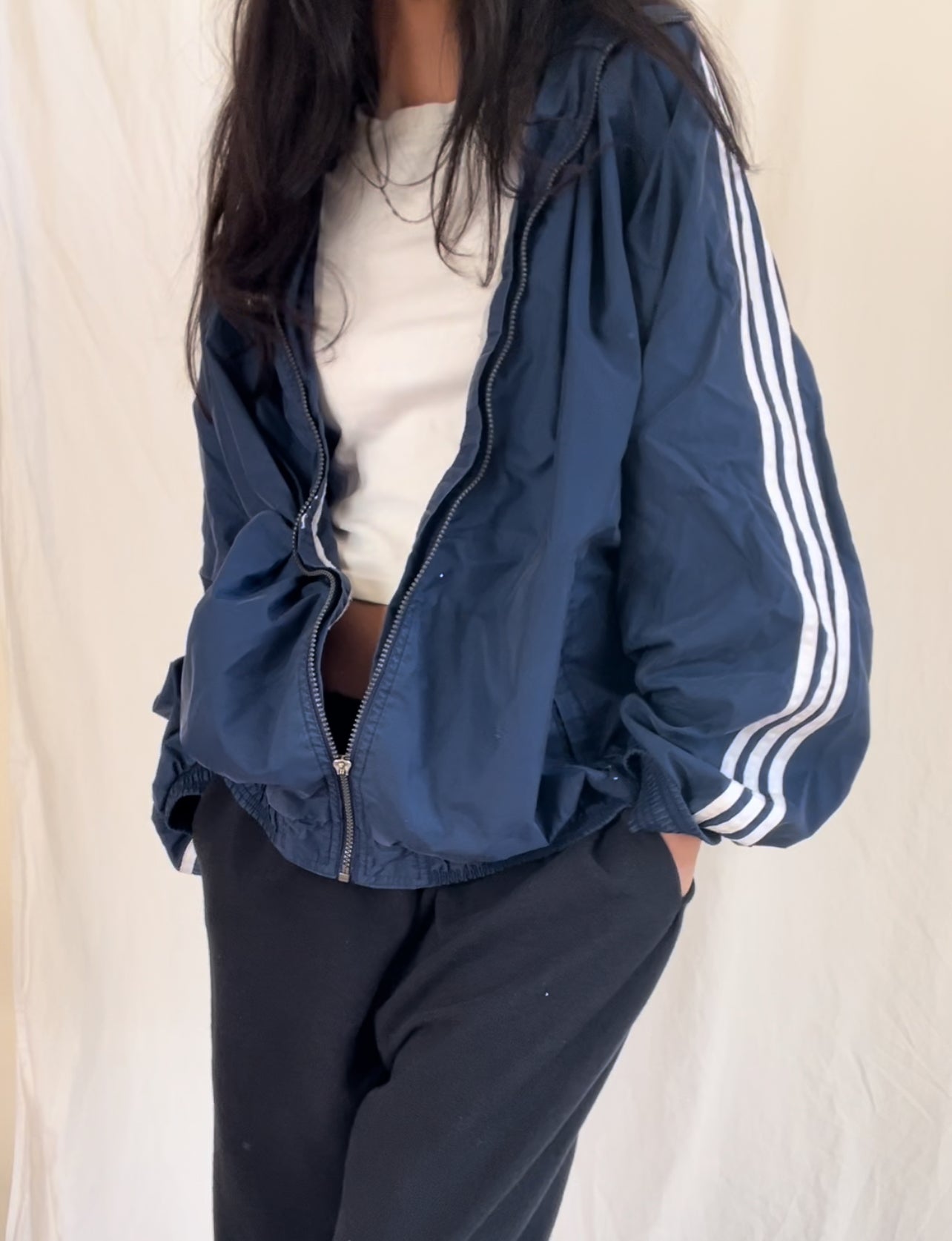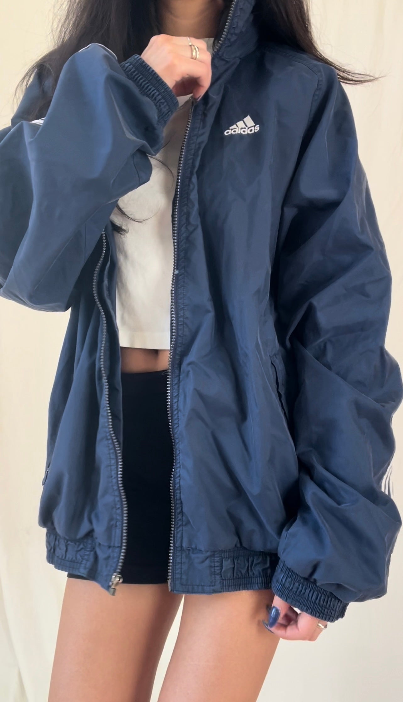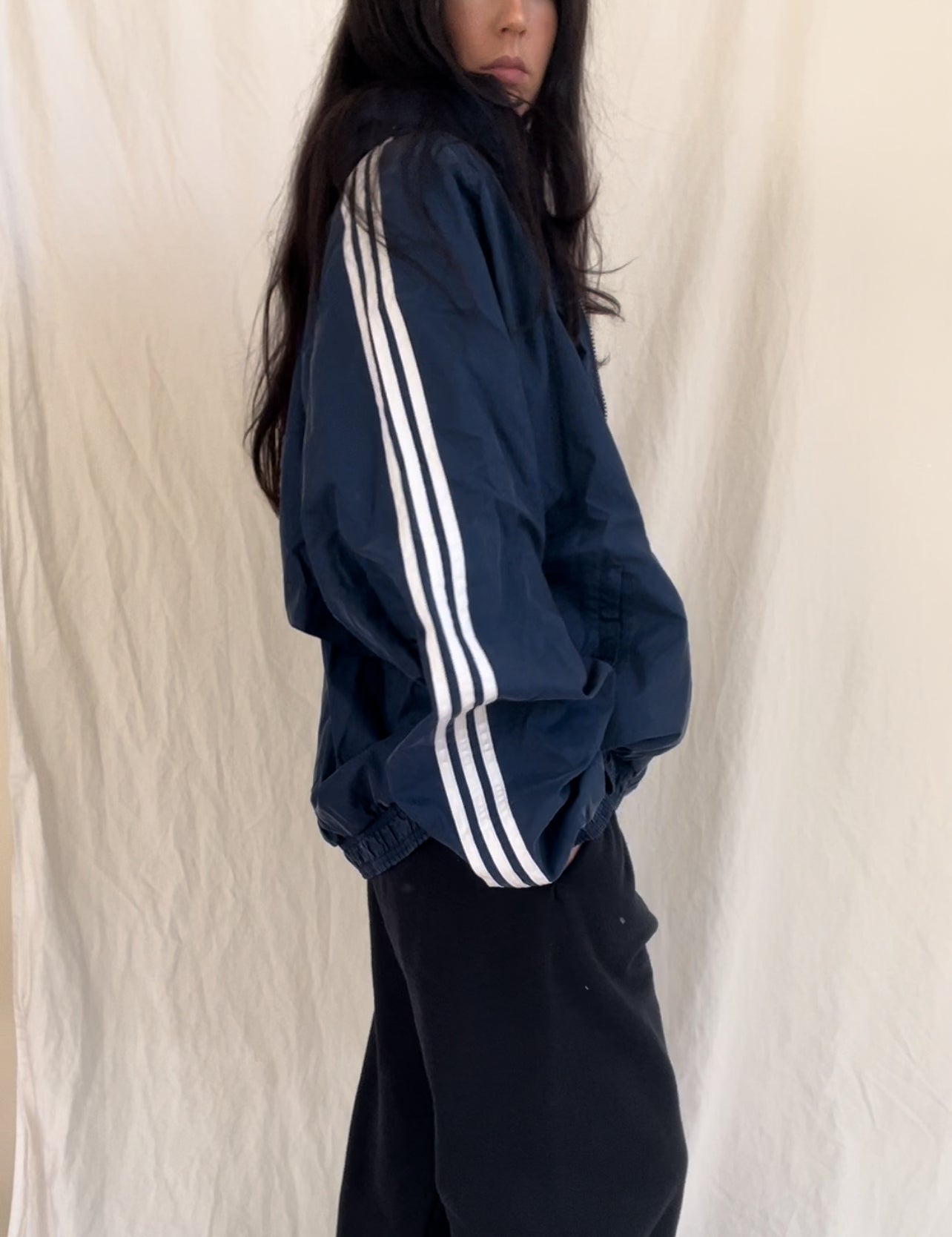 Navy blue 90’s grunge windbreaker with white racing stripes. Featuring a zip in hood, pockets and zipper front closure.