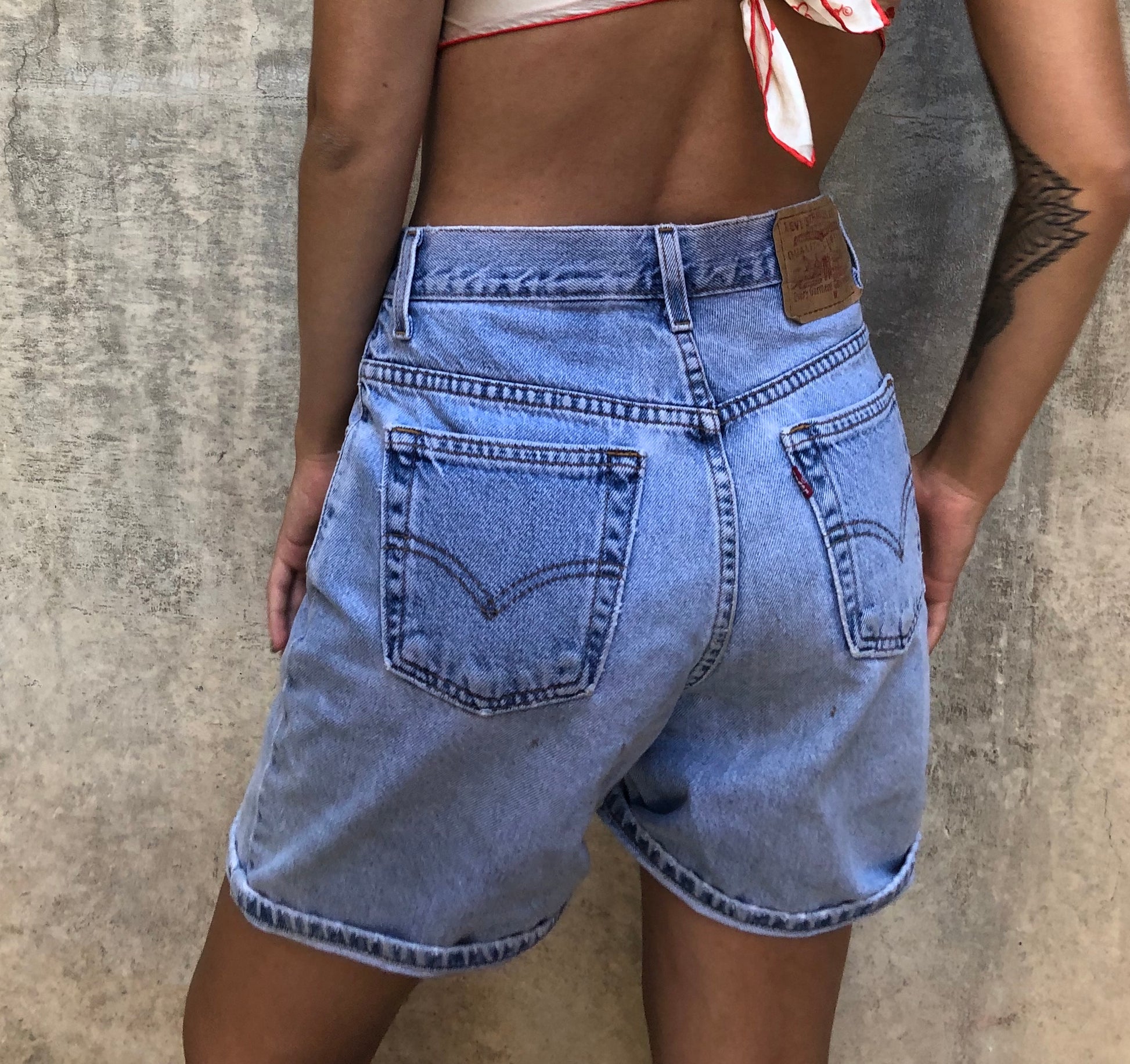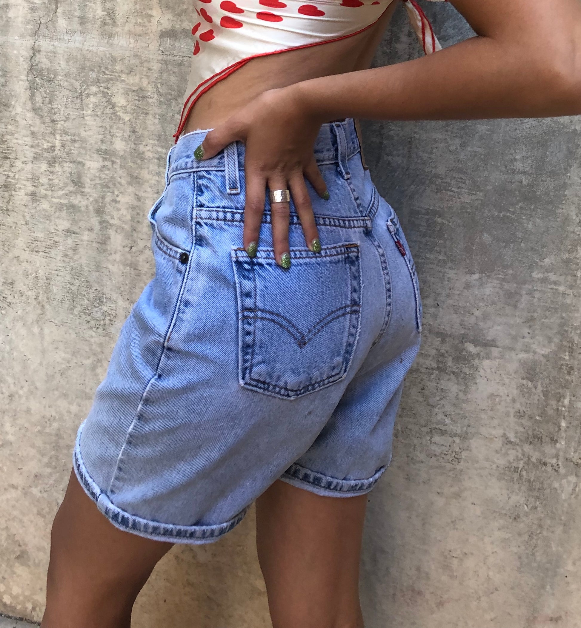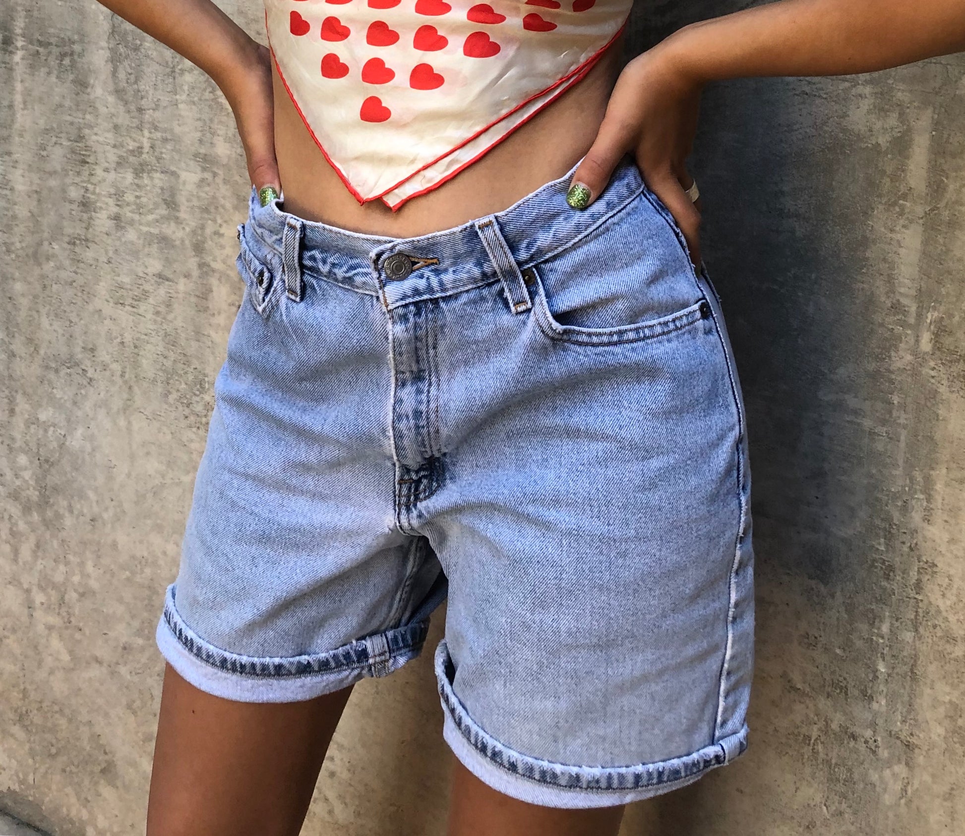 high waisted Levi's long shorts 1990's style, medium/light wash