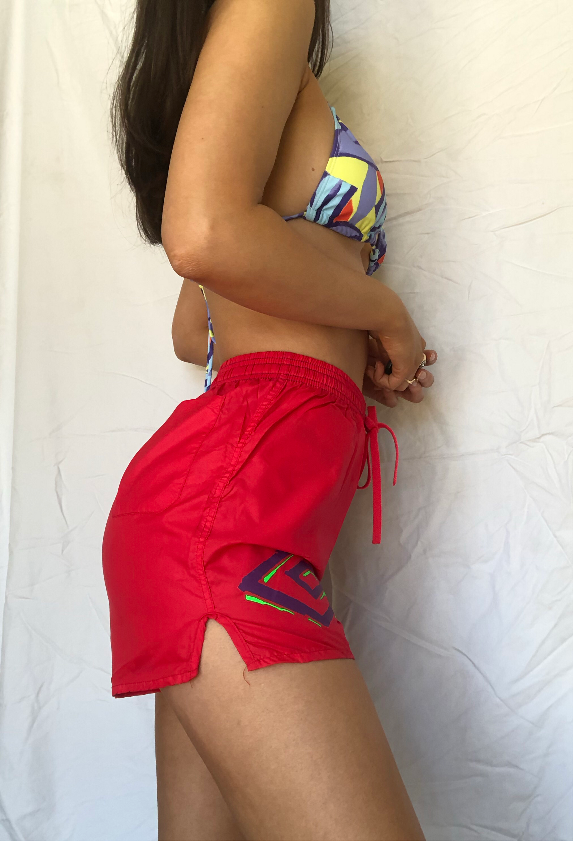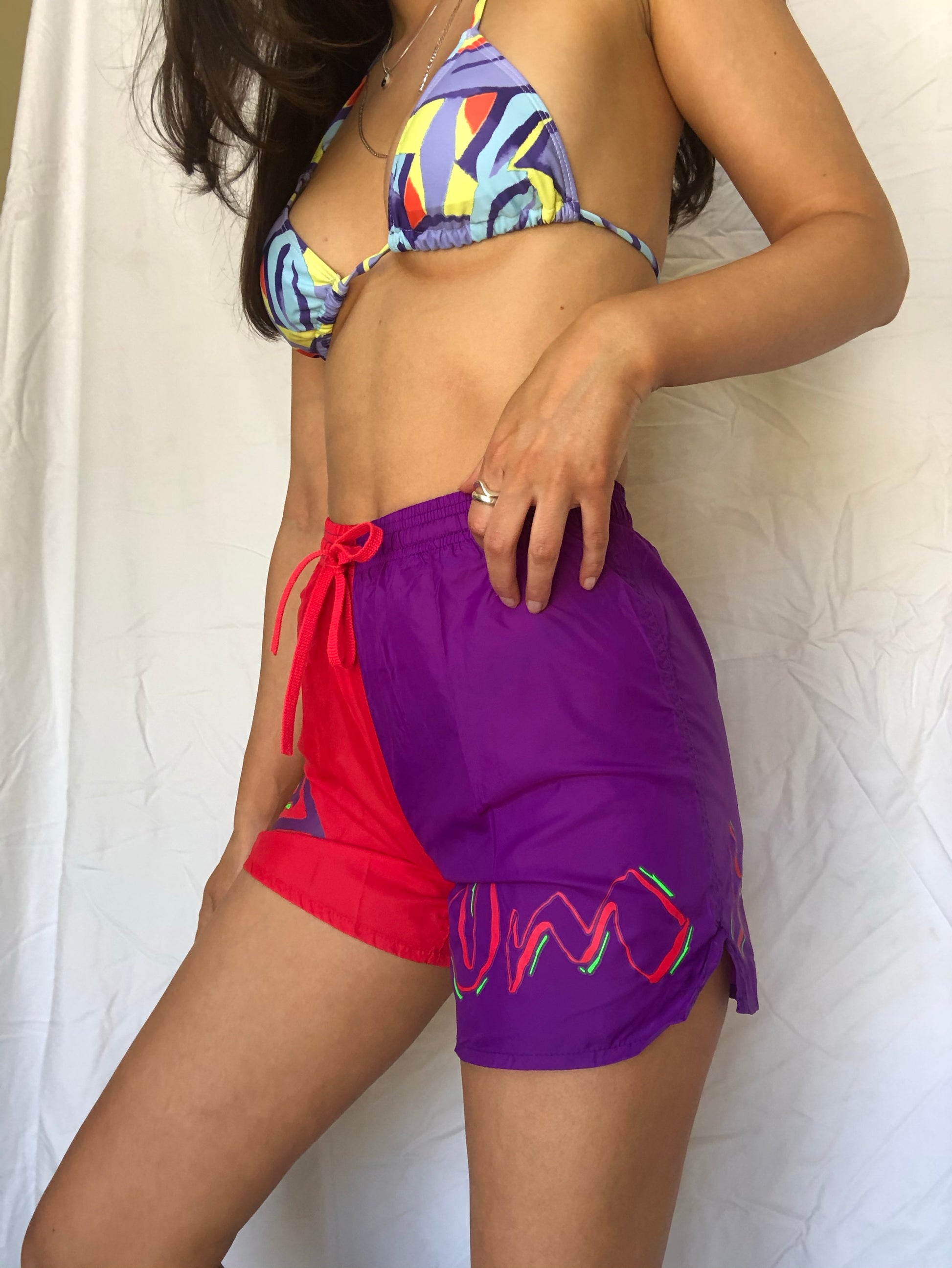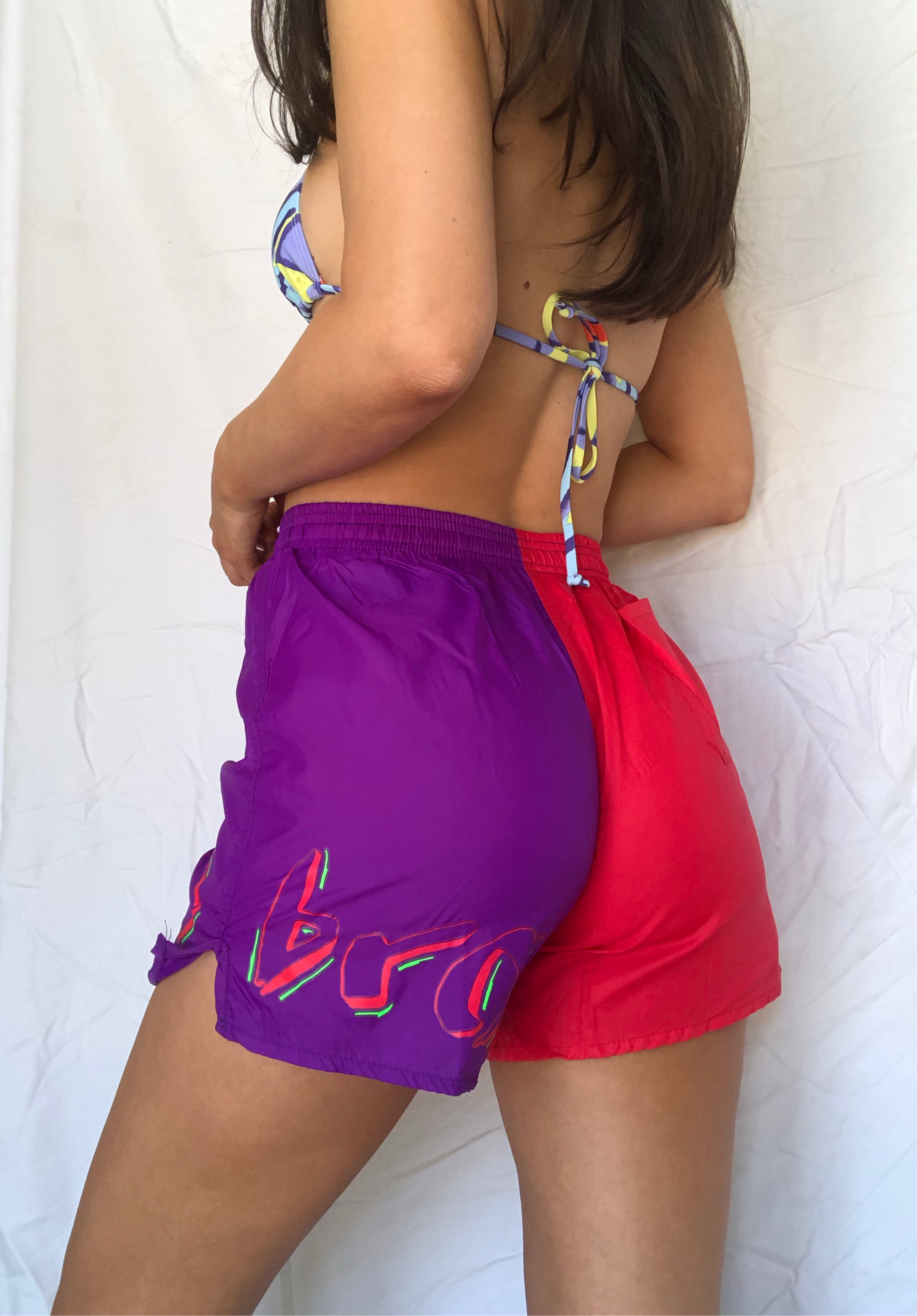 Vintage Umbro polymide two toned track shorts. Crinkley and light weight these two toned purple and reddish pink shorts are high waisted and have a drawstring and elastic waistband.