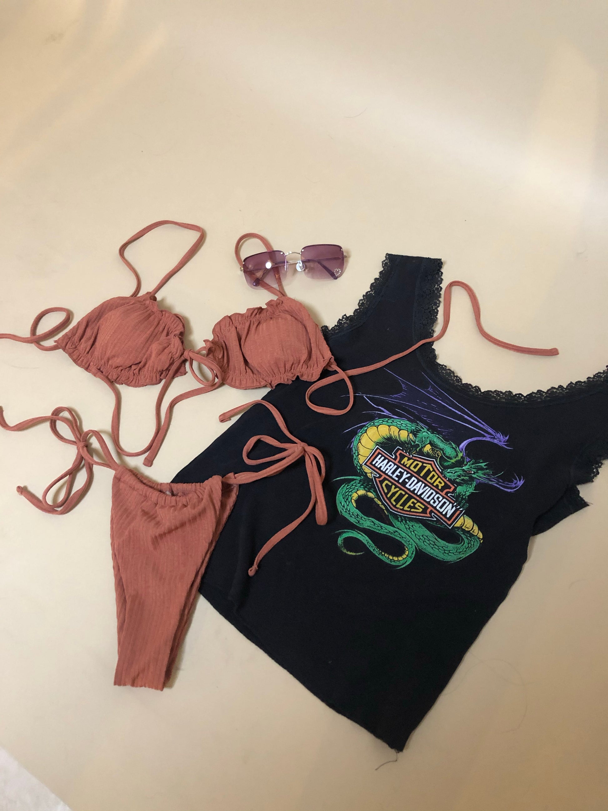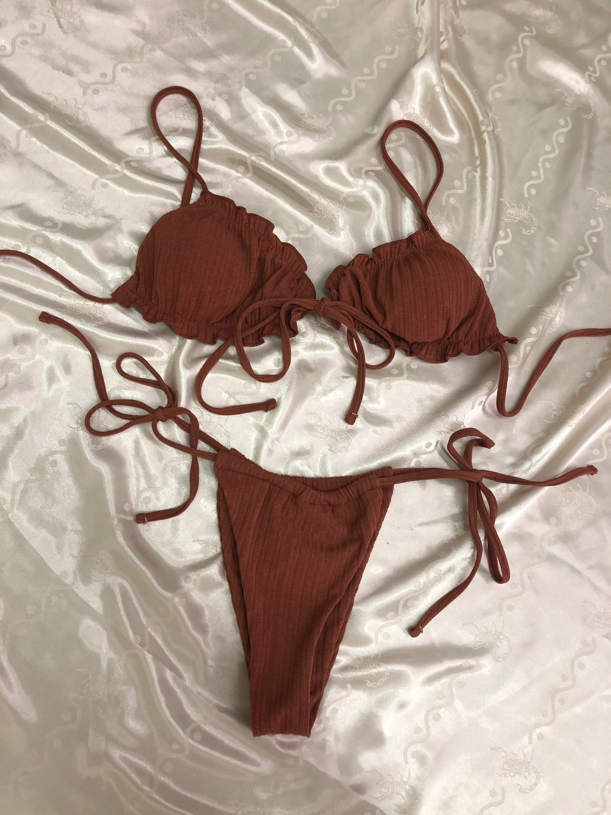 Rust colored ribbed string bikini set with lettuce edge tie front top and adjustable cheeky high leg bottoms