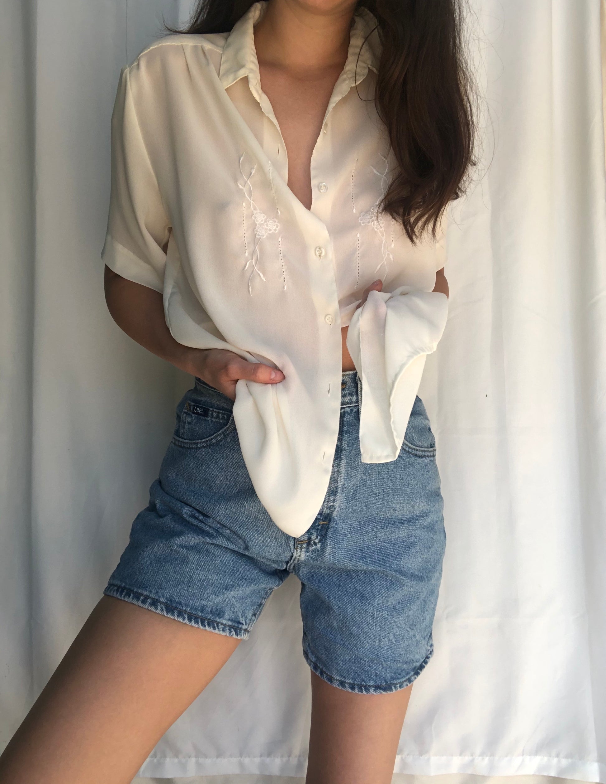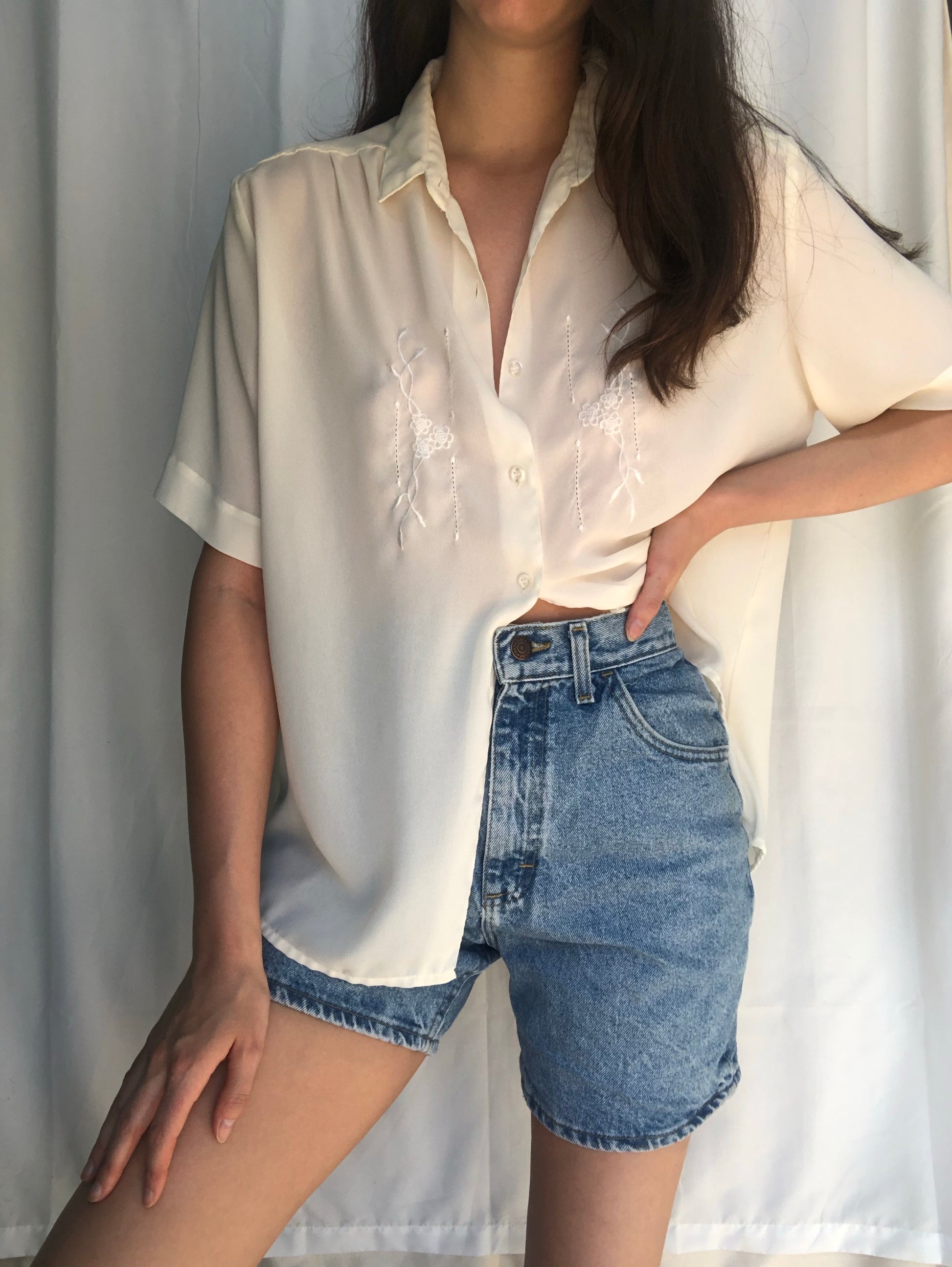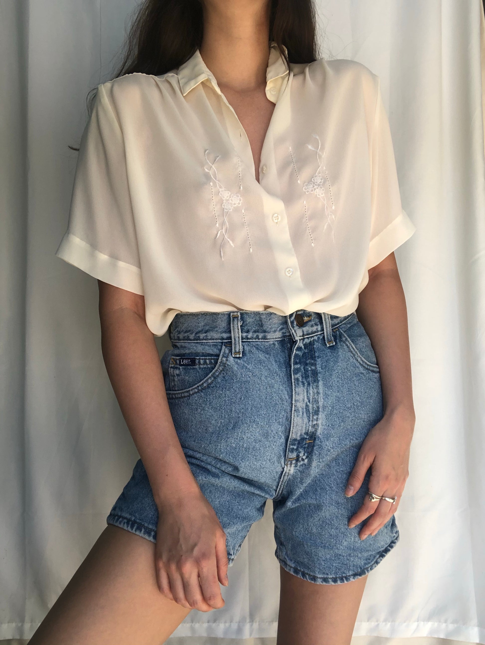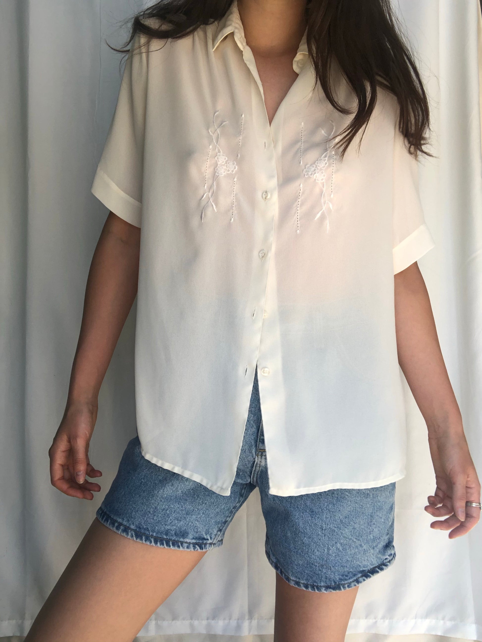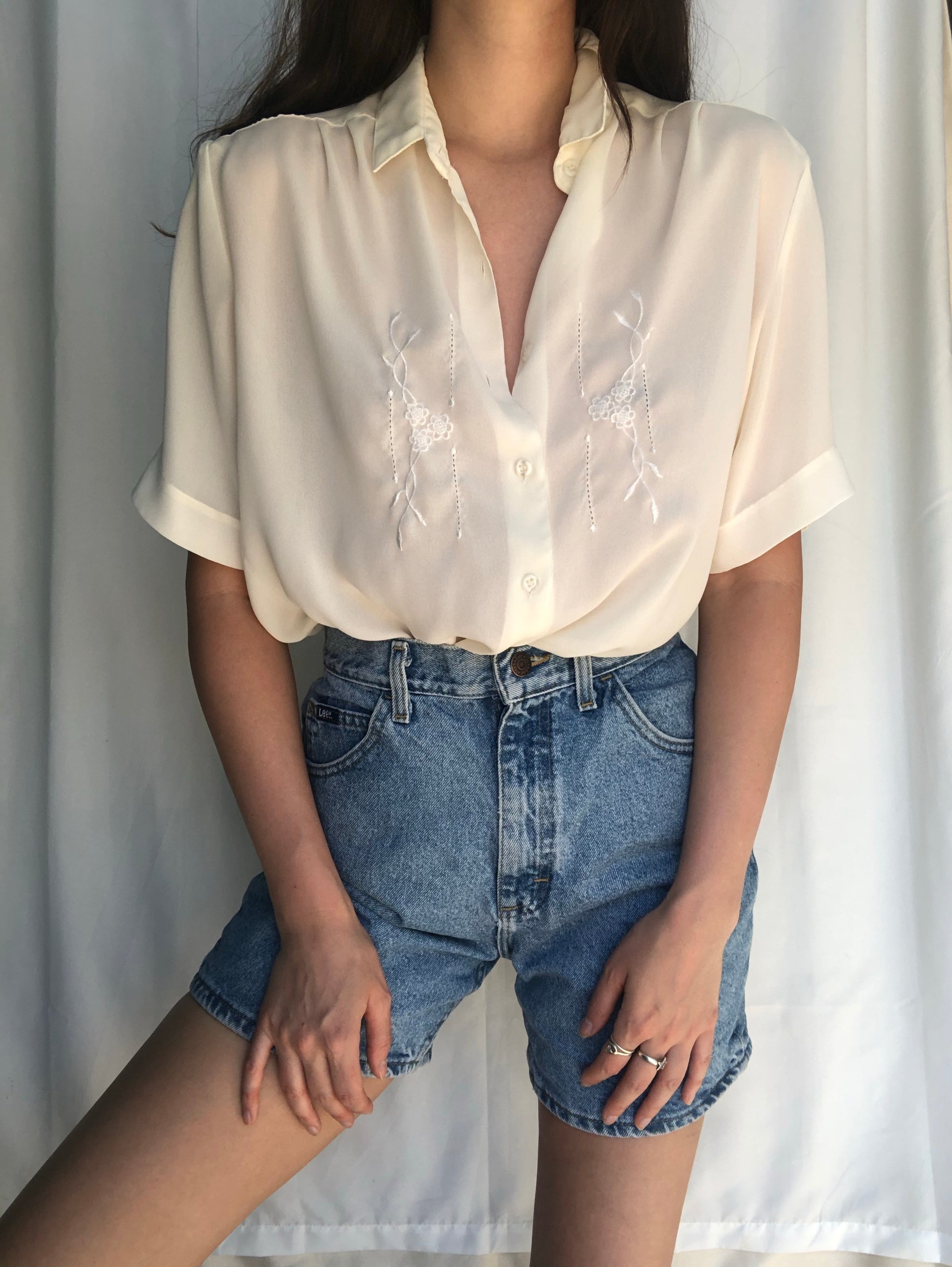 Light airy cream vintage summer blouse with embroidered flower detail and pearly buttons