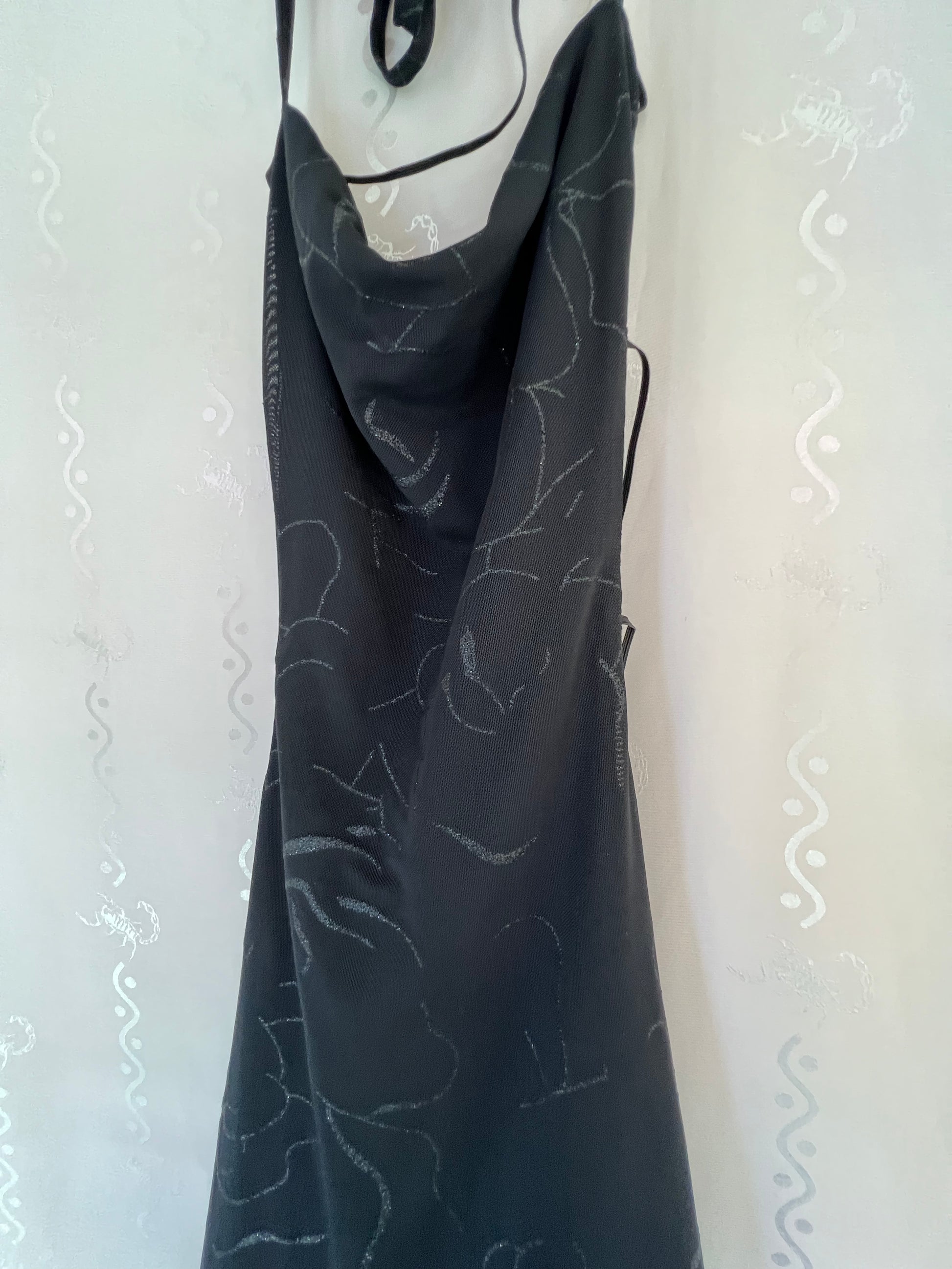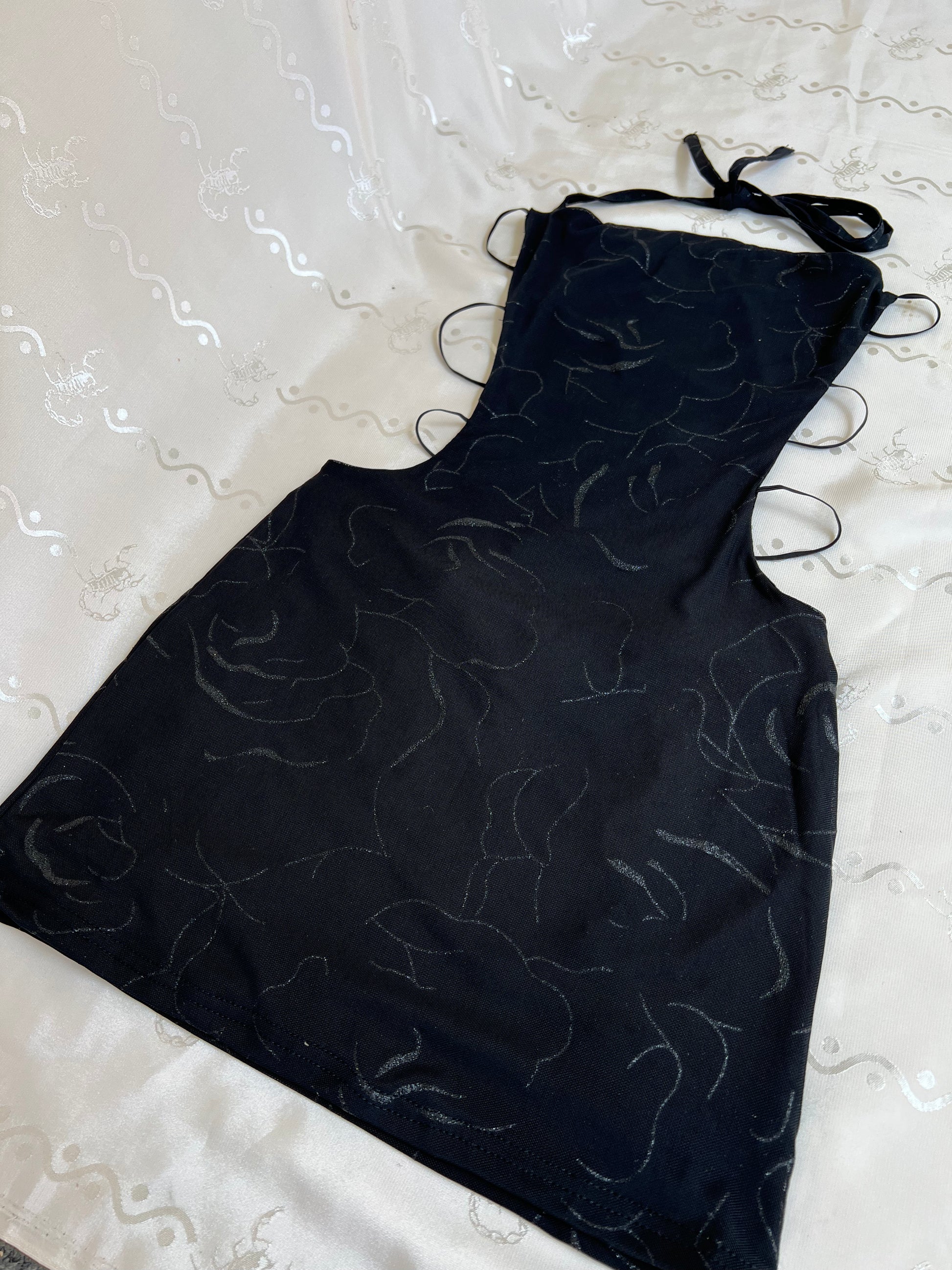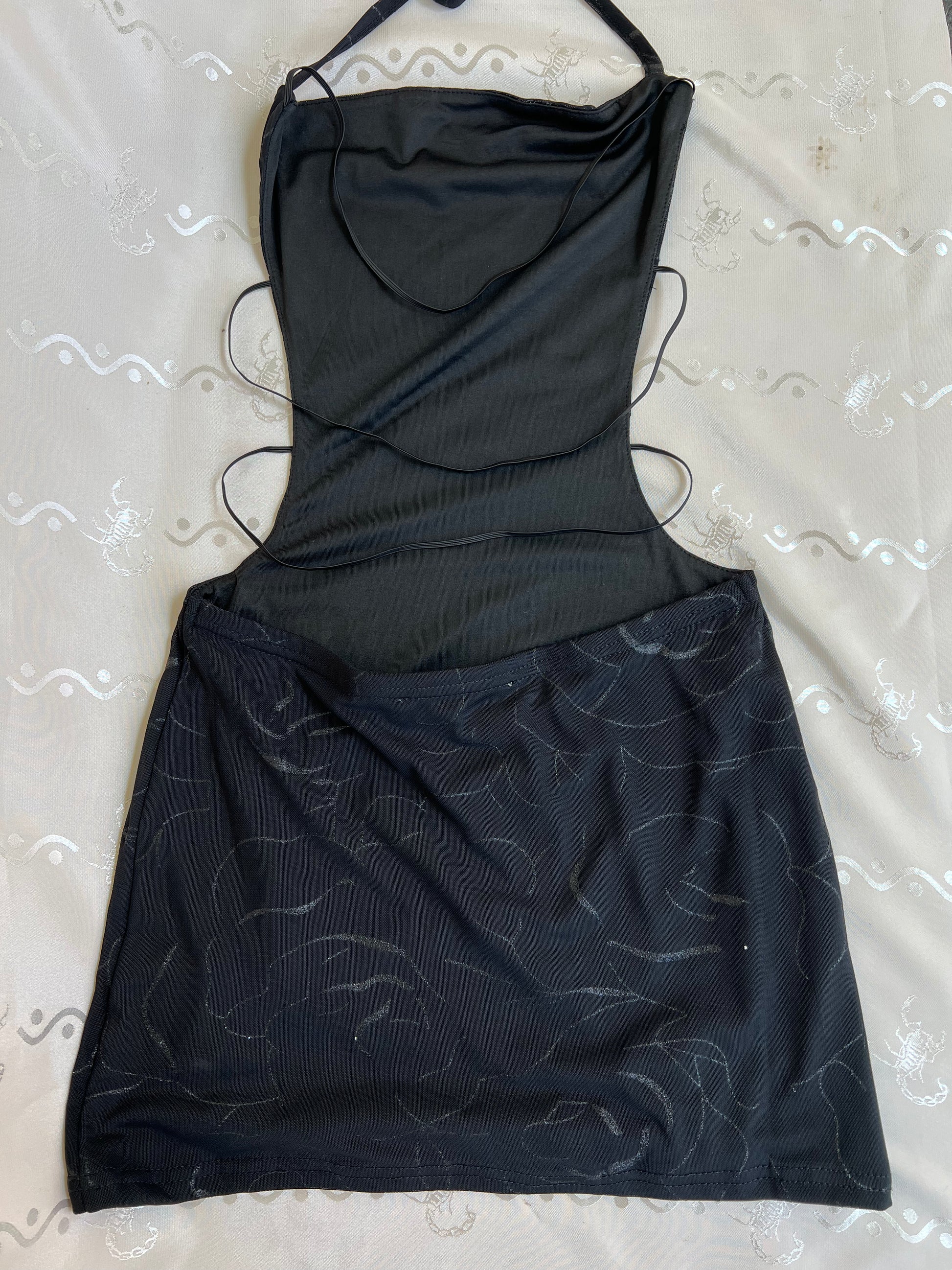 This mesh super mini bodycon dress is lined, features thin spaghetti straps along an open back & a subtle black glitter roses print. 🖤