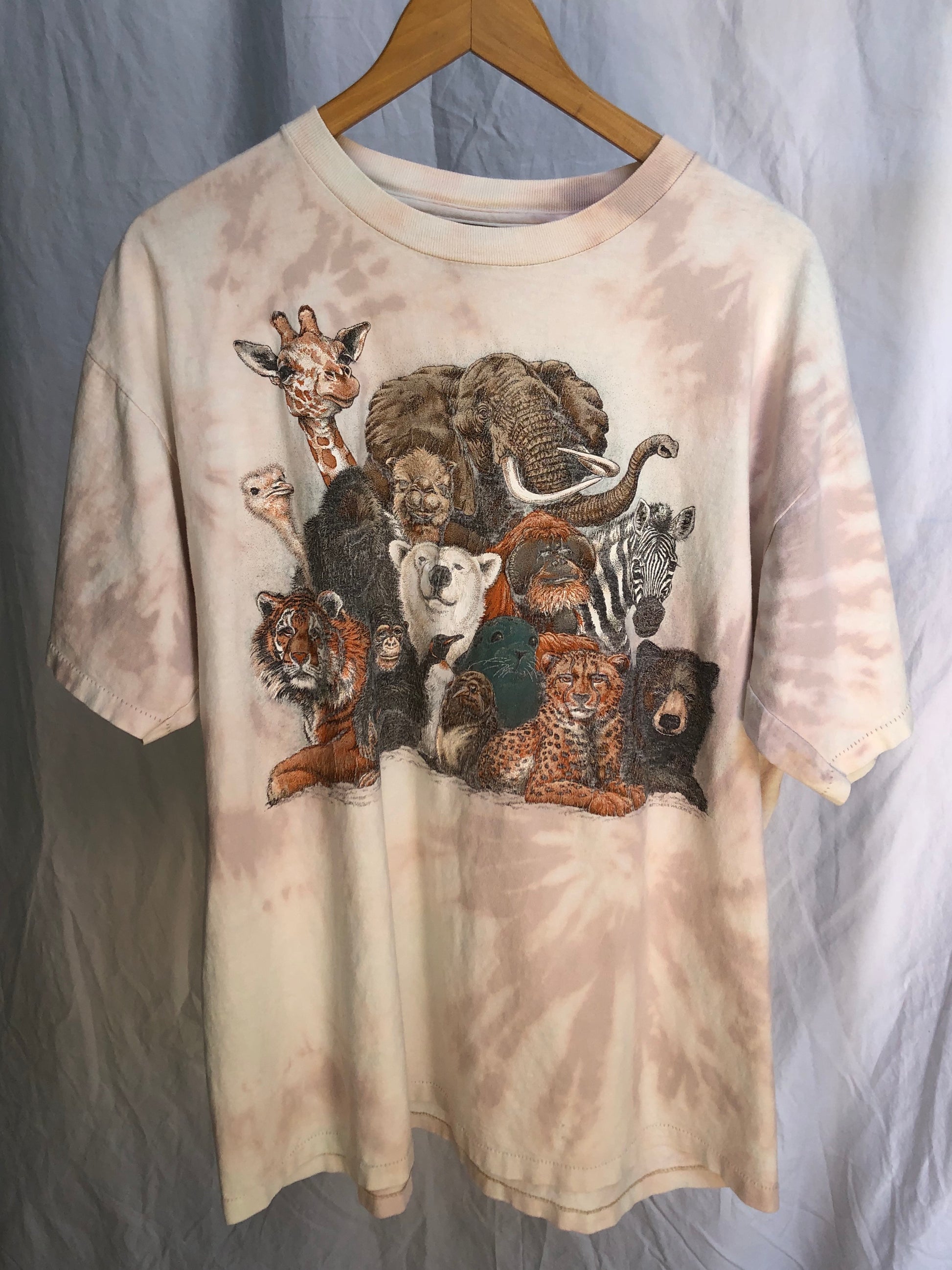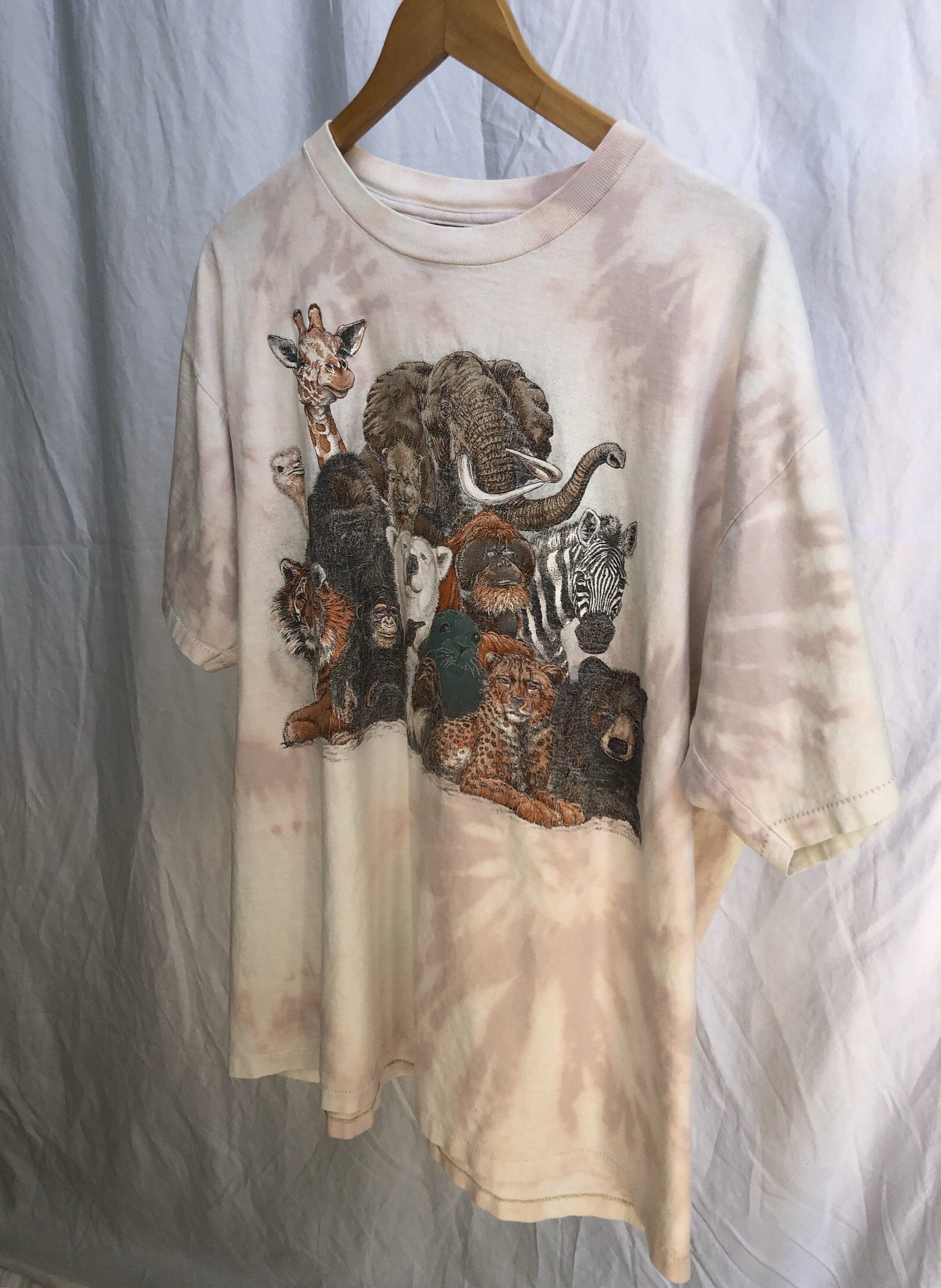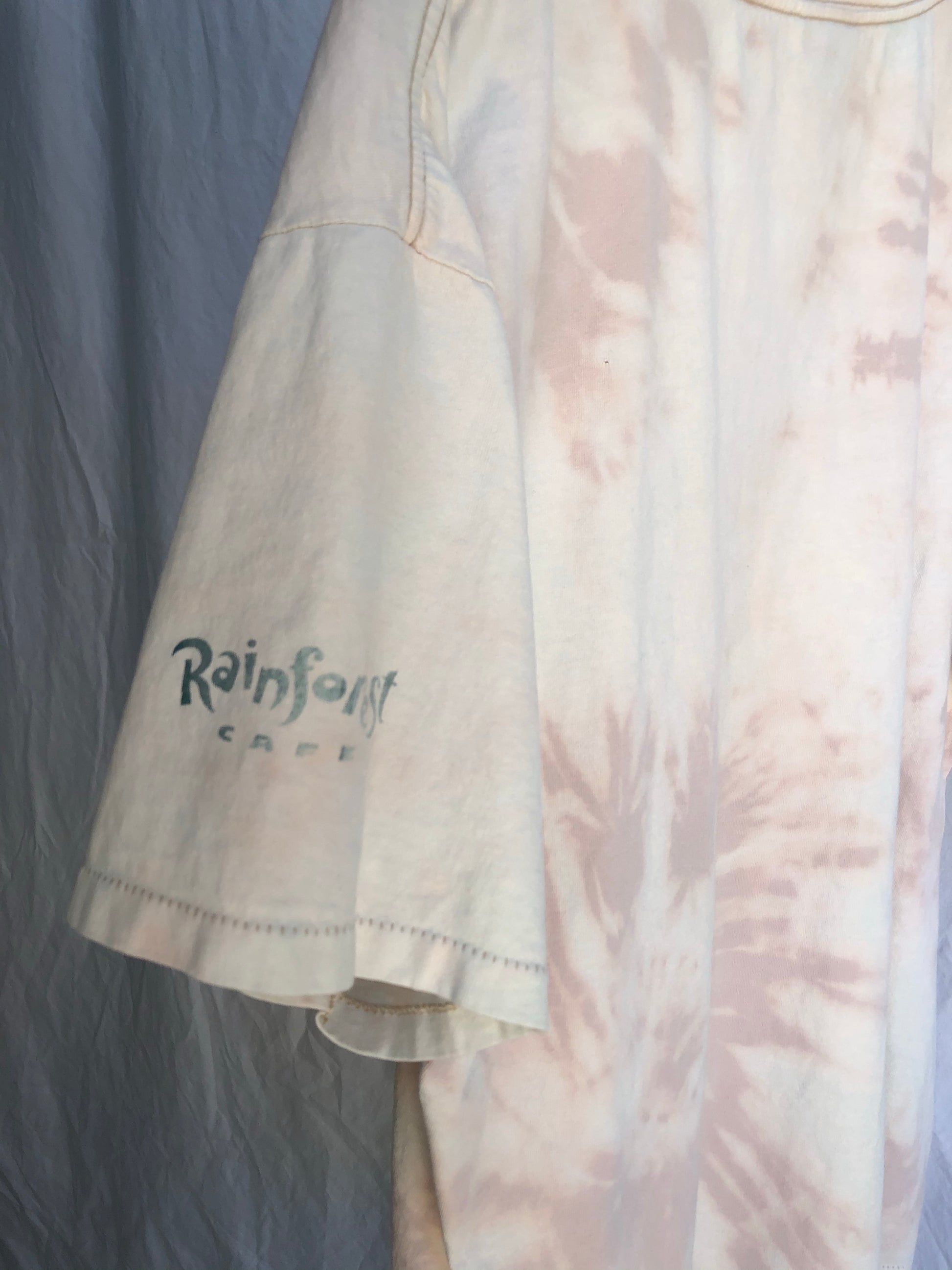 Oversized, baggy vintage Rainforest Cafe single stitch tie dye t-shirt. This tee has some distressing/ fading and cracking on the animal print.