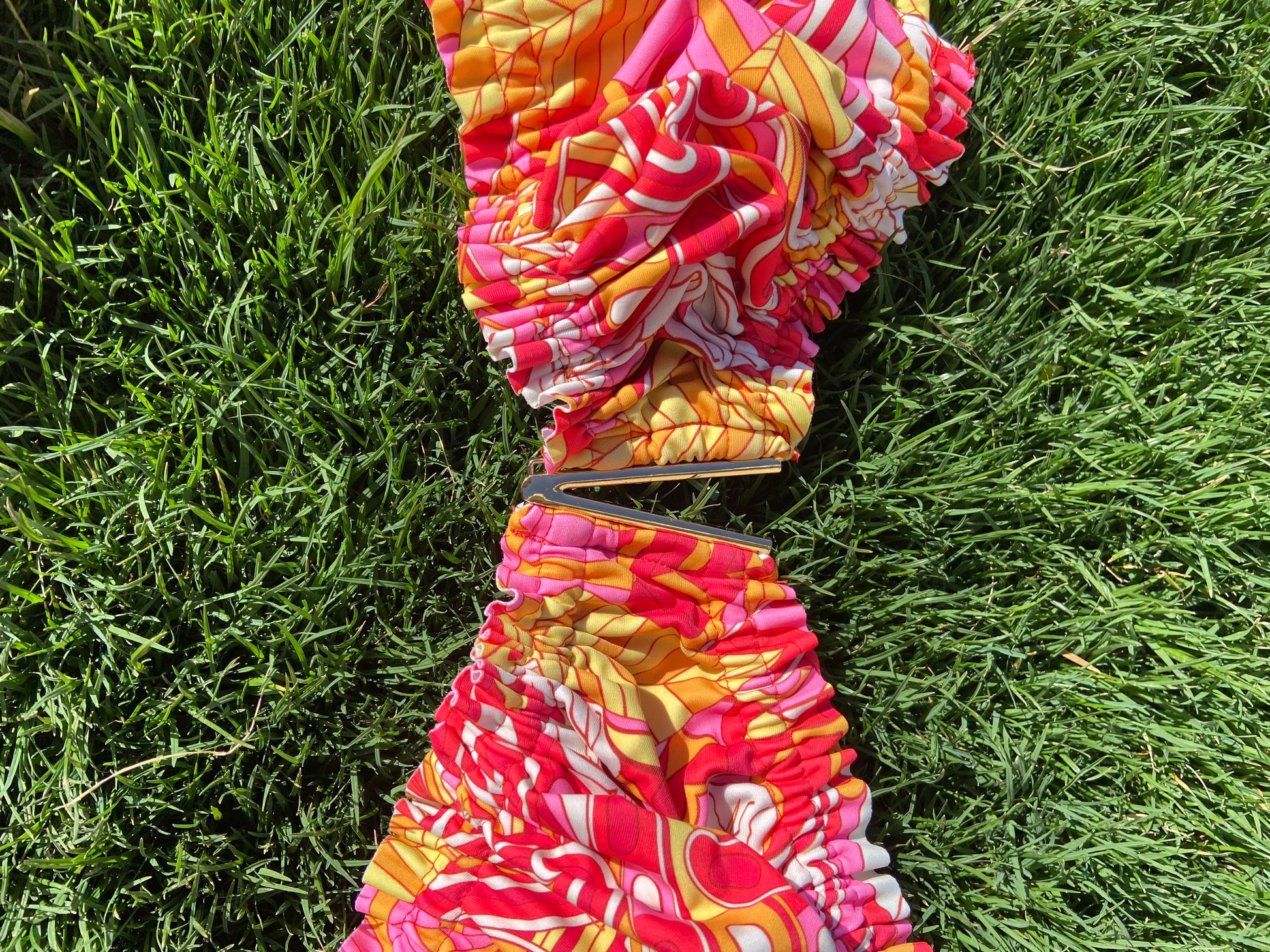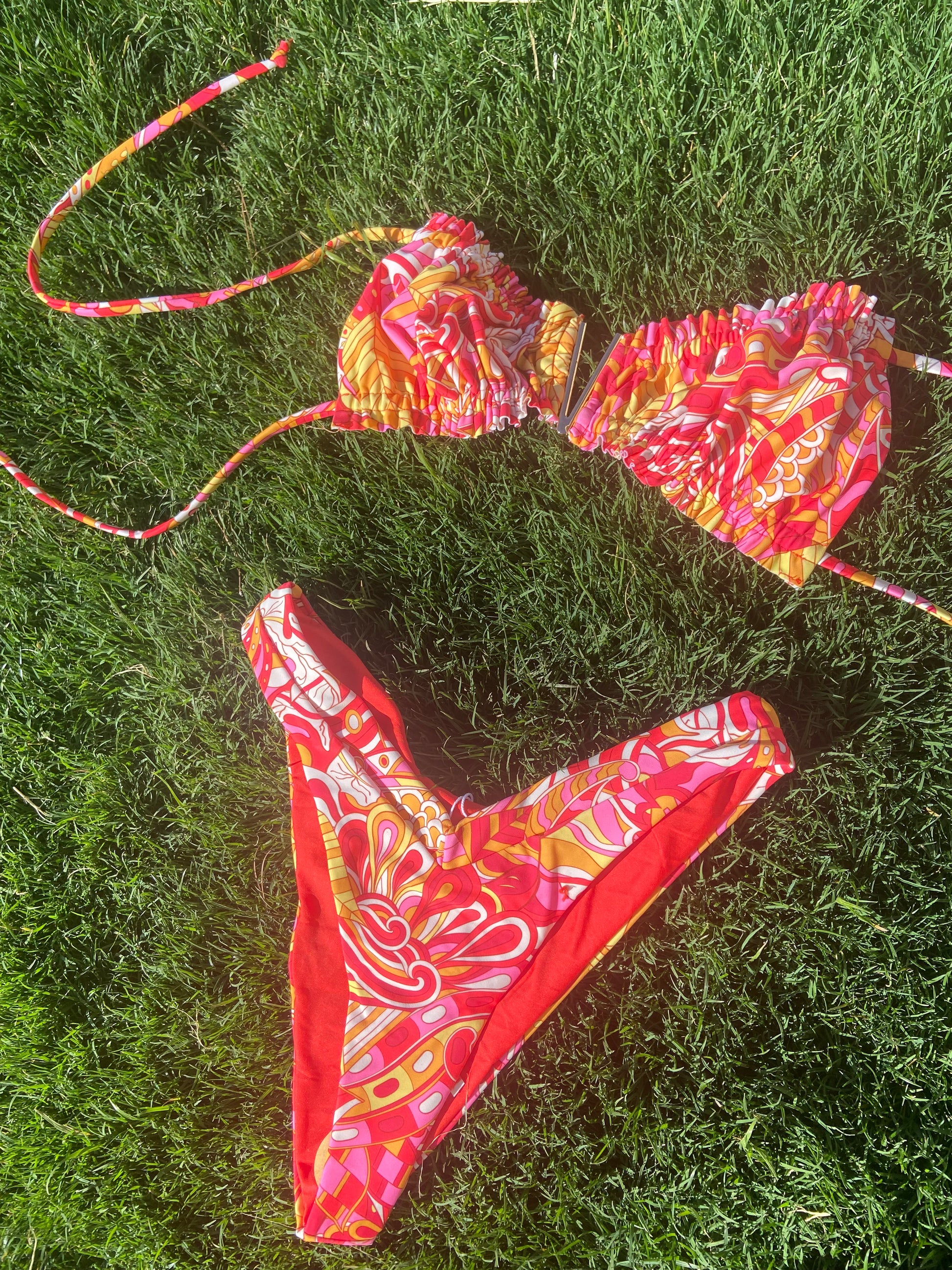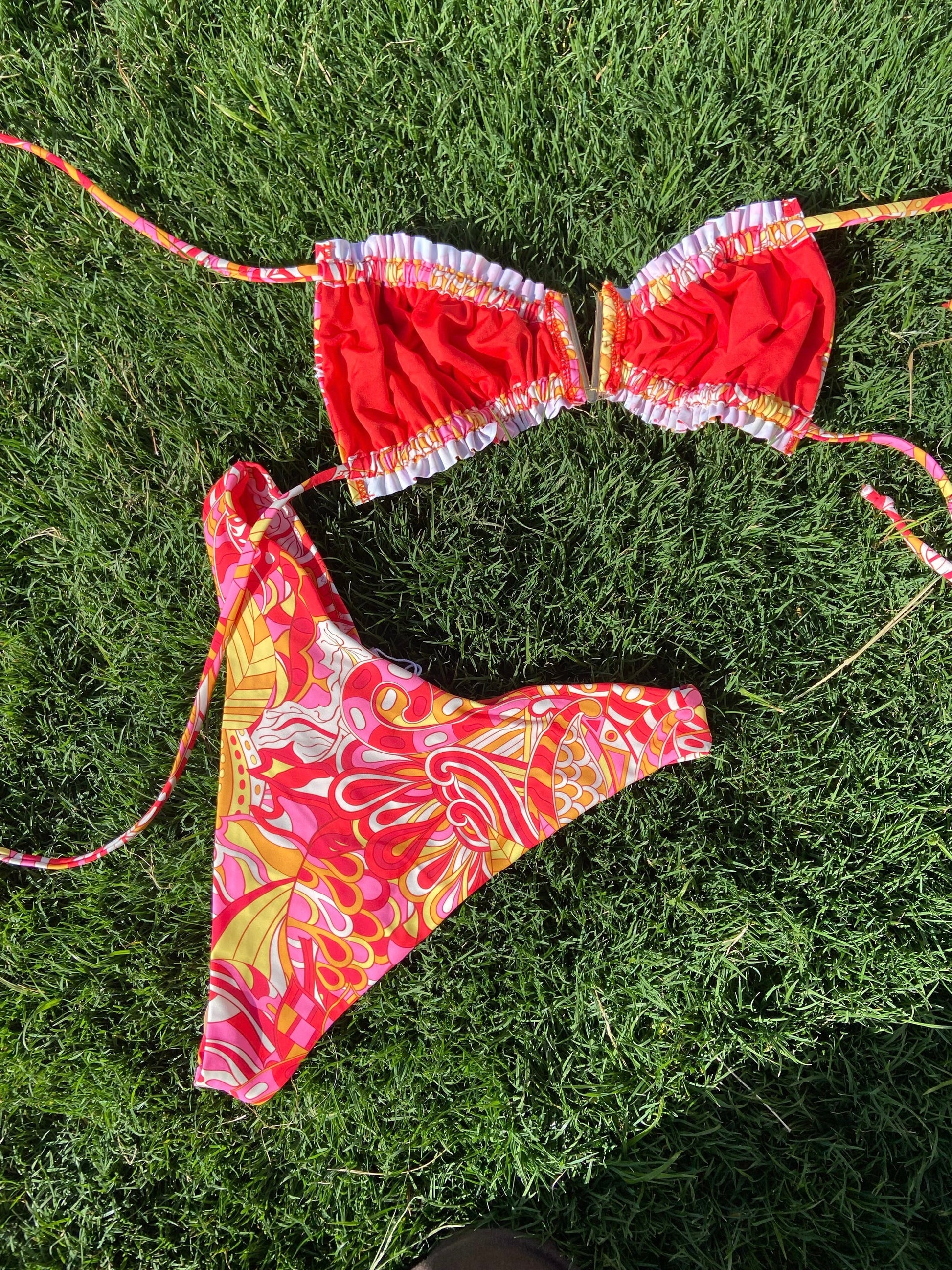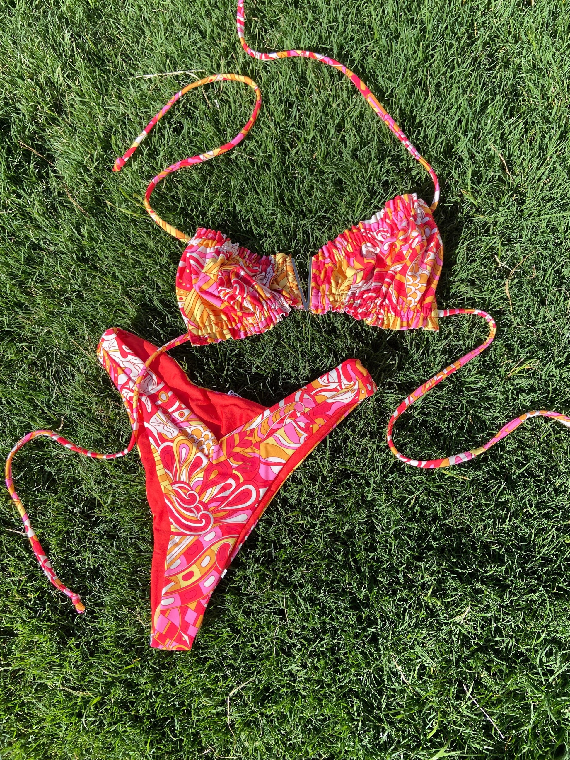 This paisley bikini features a bright red multi color pattern on high leg cheeky v-front bikini bottoms and a string-tie scrunch top with v-front silver hardware. Top and bottoms sold separately.