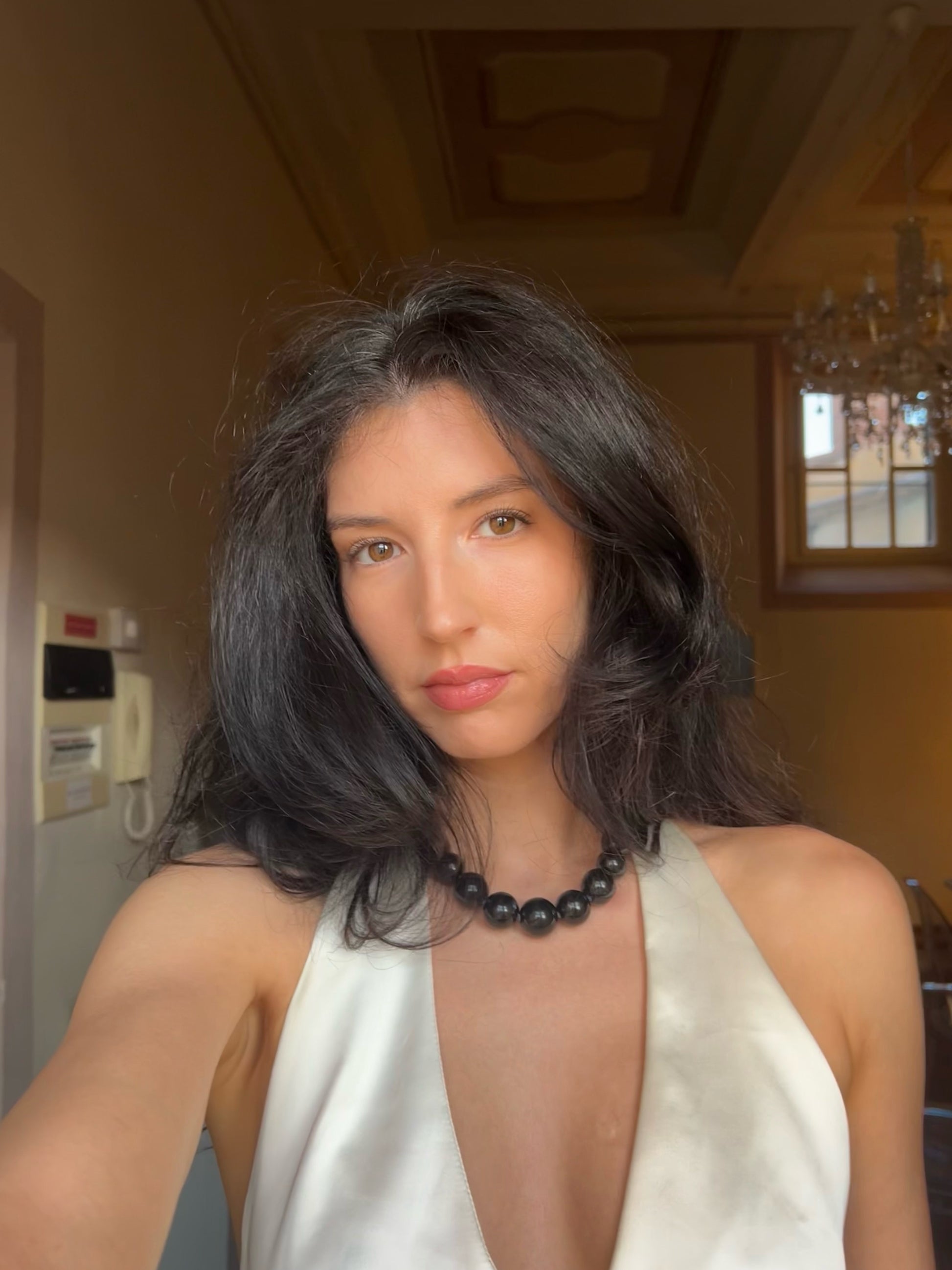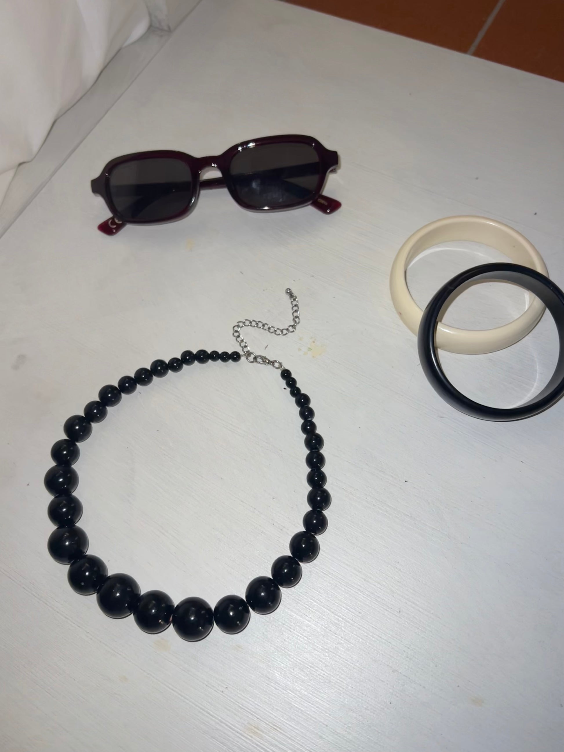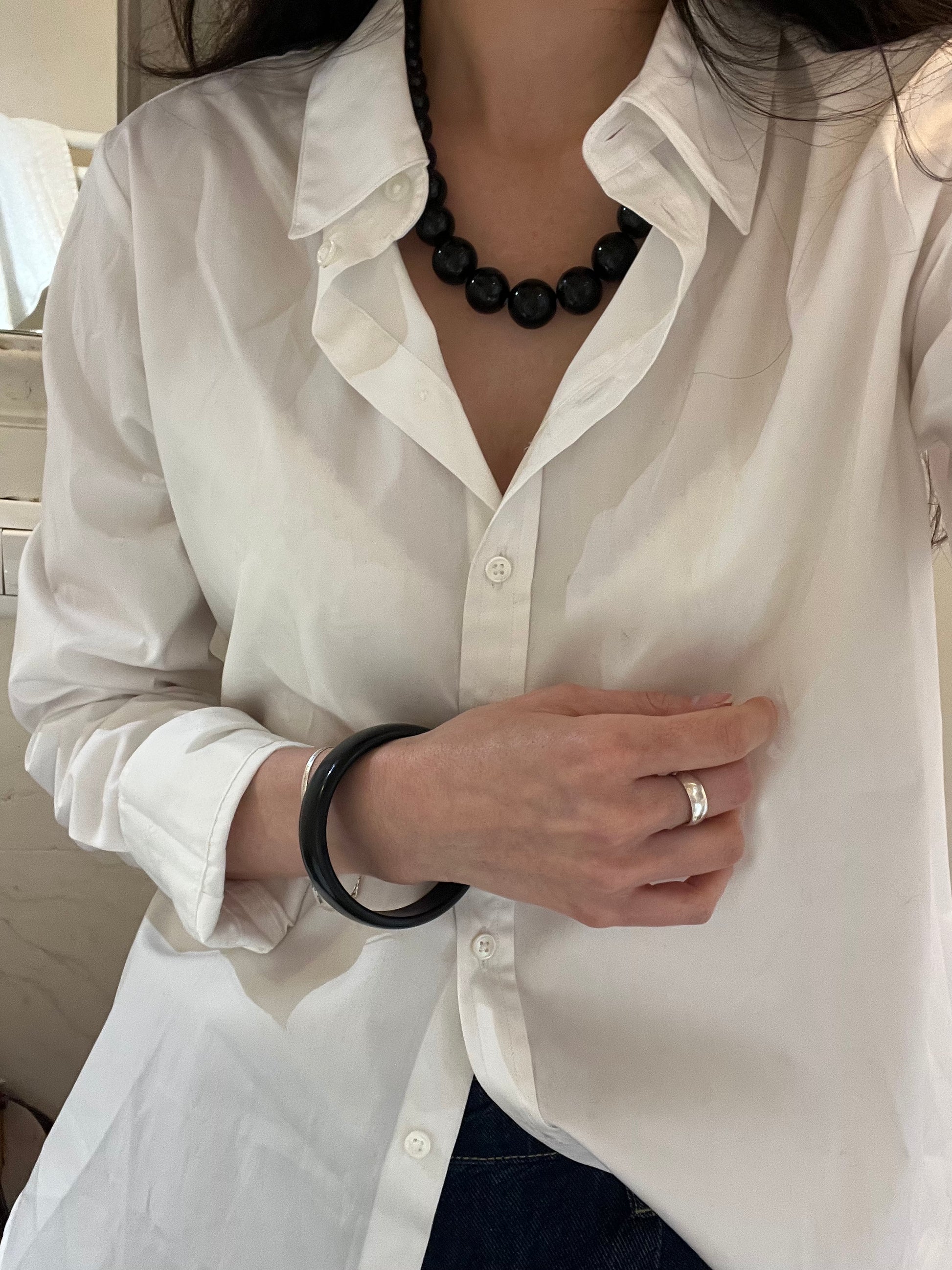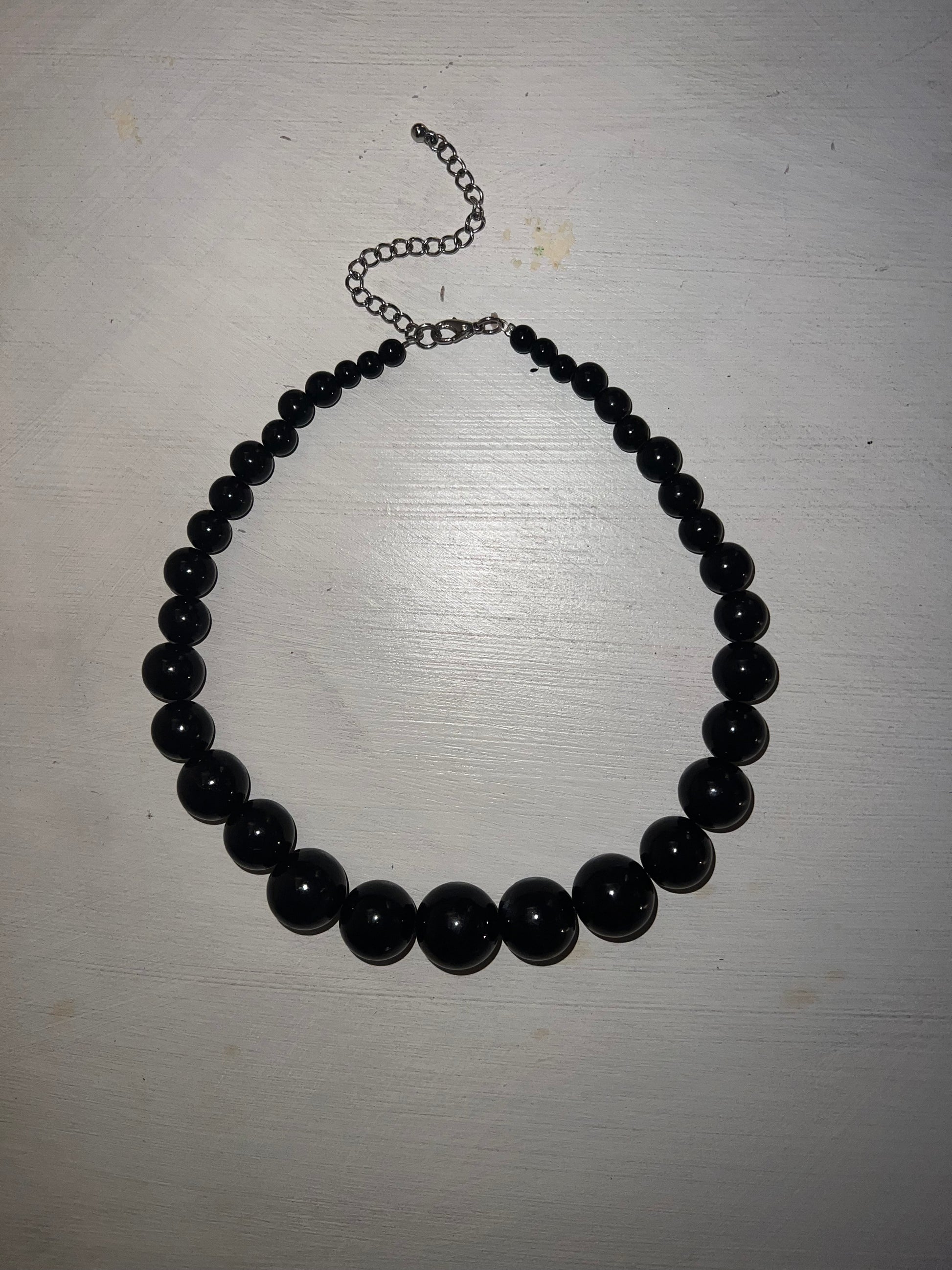 A black chunky bead statement necklace with adjustable silver tone lobster clasp. Minimalist design. The beads decrease in size as they reach the back. Such a chic accessory for a collared shirt or with a fun flirty going-out getup.