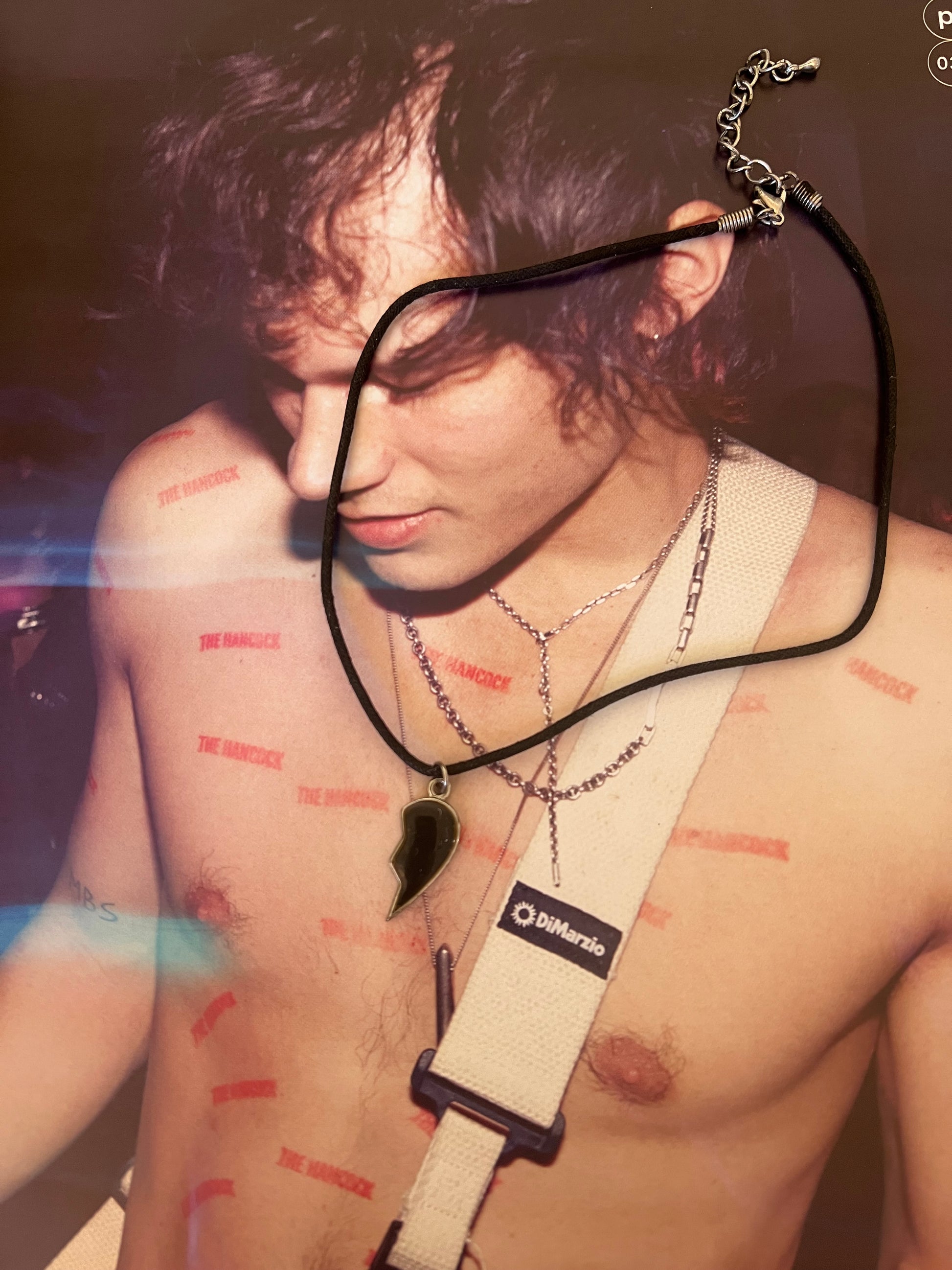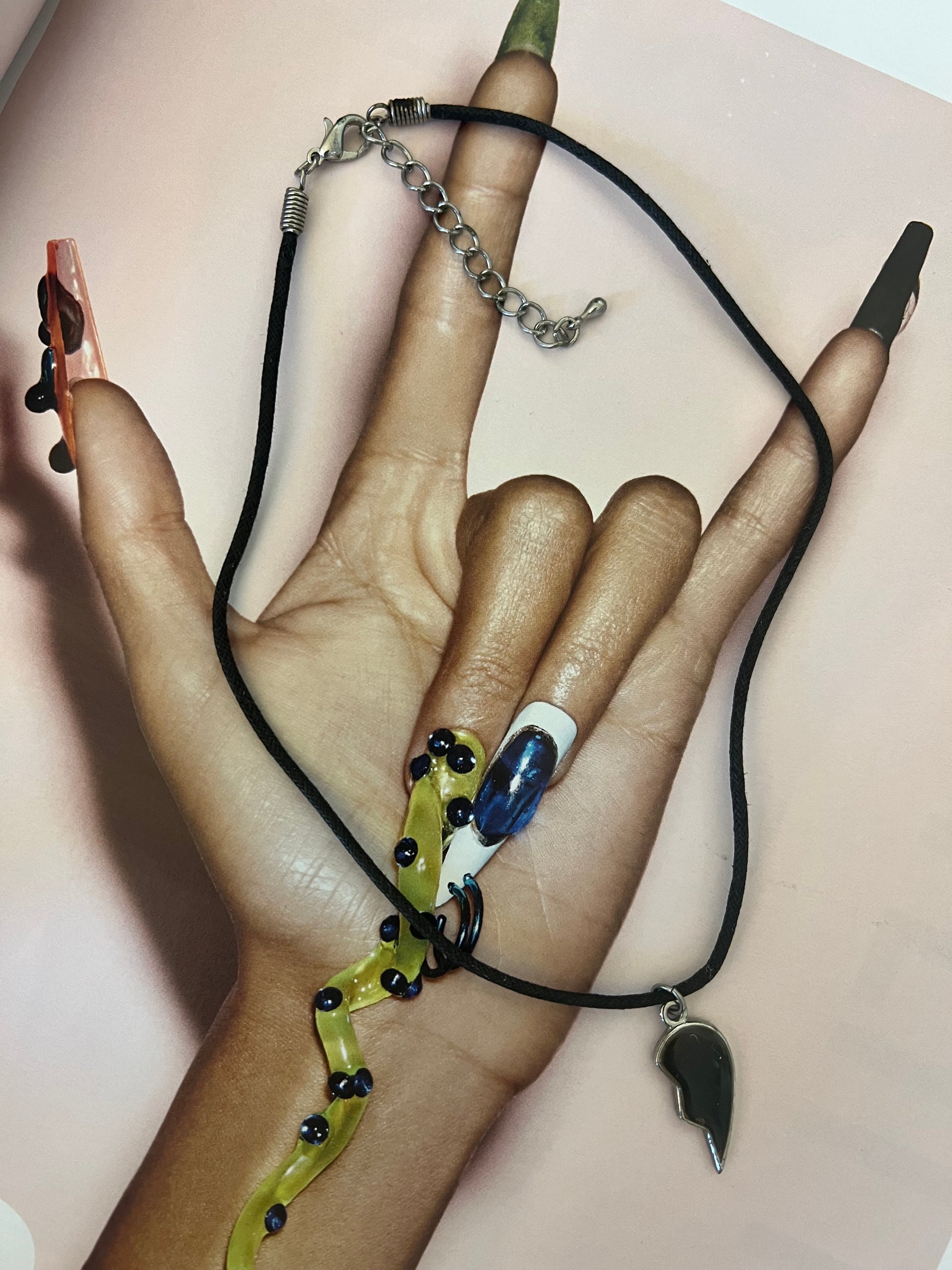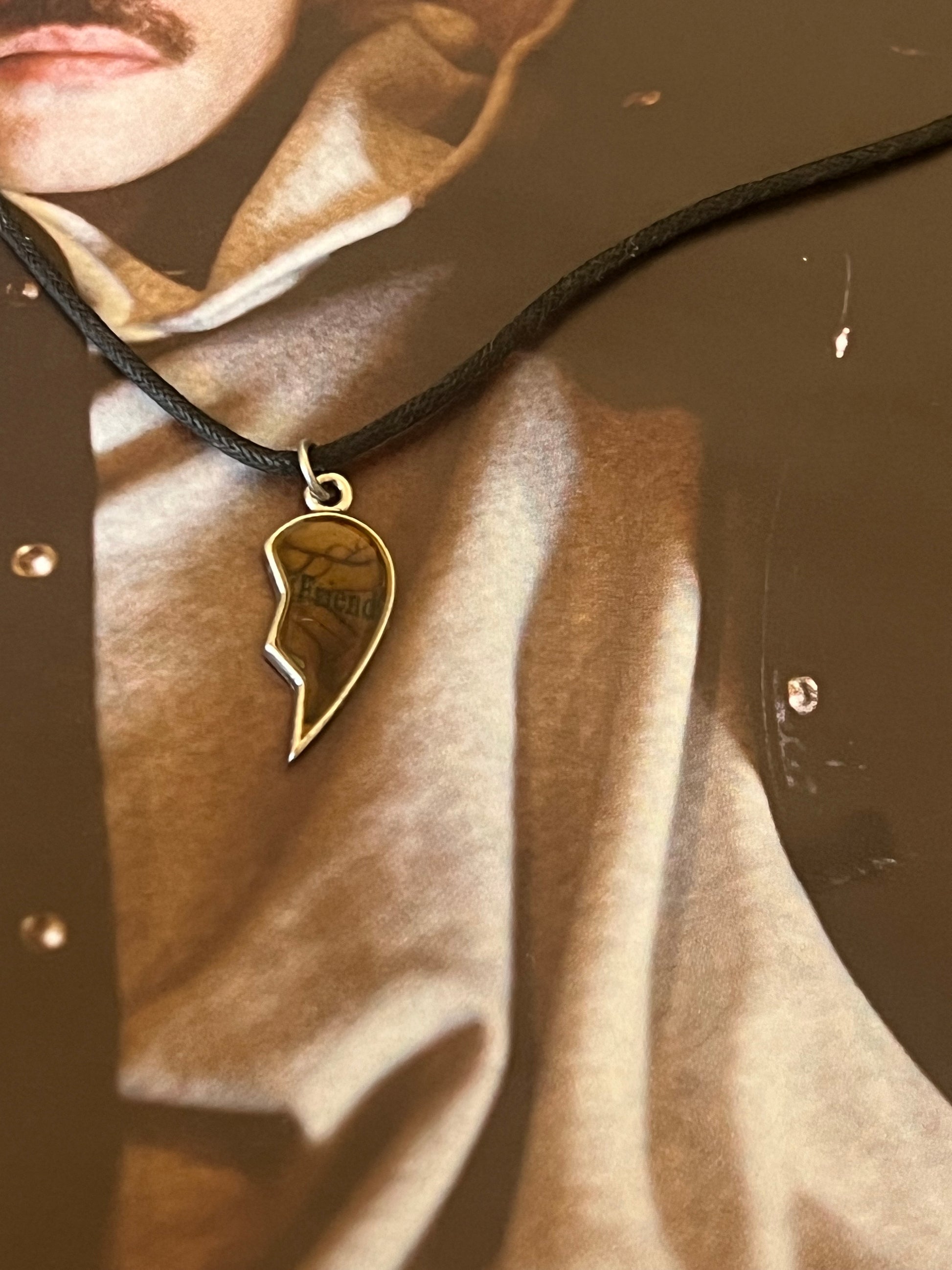 A “best friends” broken heart necklace on black cord with adjustable lobster clasp. Silver heart pendant with black enamel center. The pendant is a mood stone and changes color with body heat. It ranges from black to orange to green!