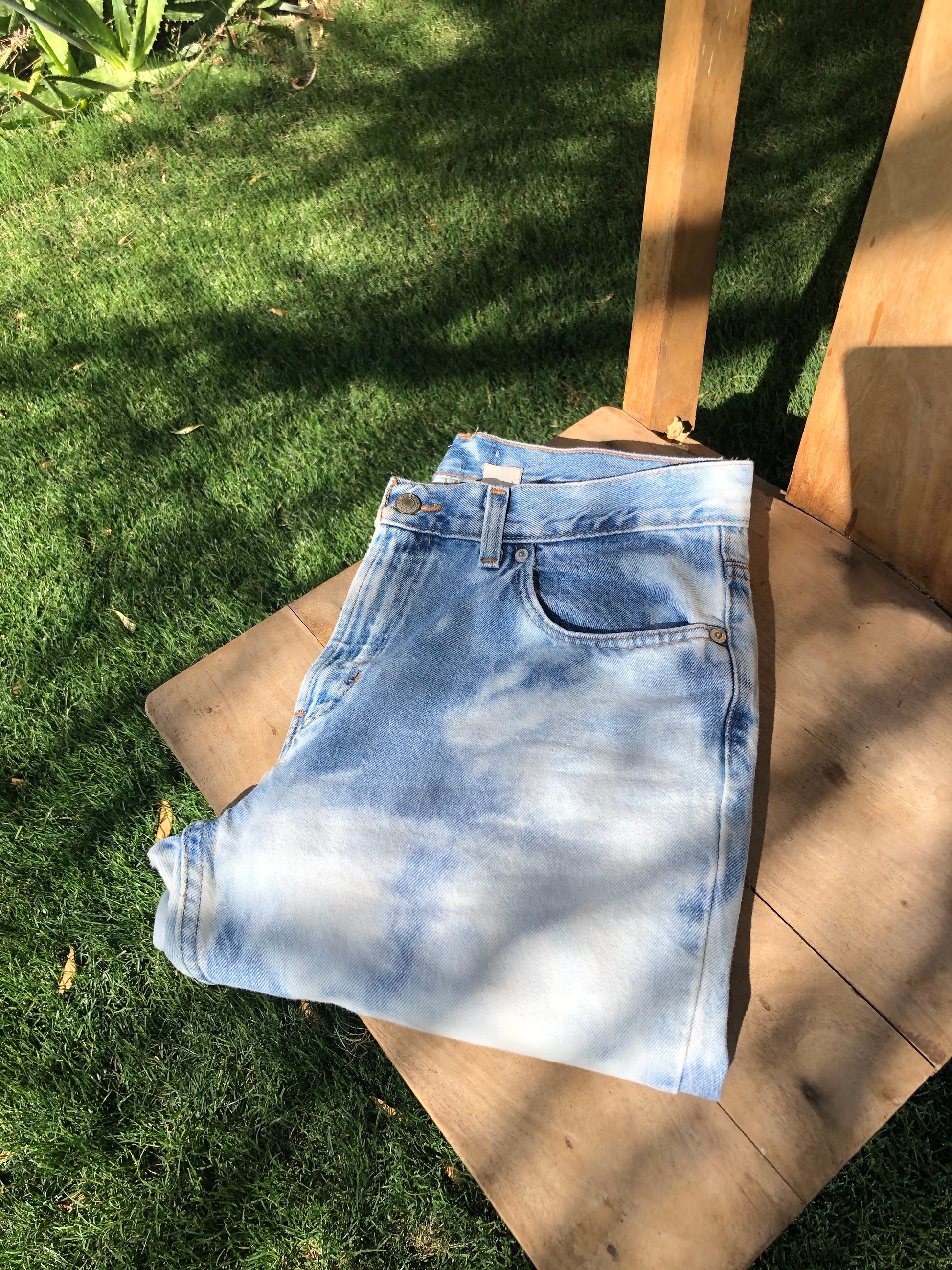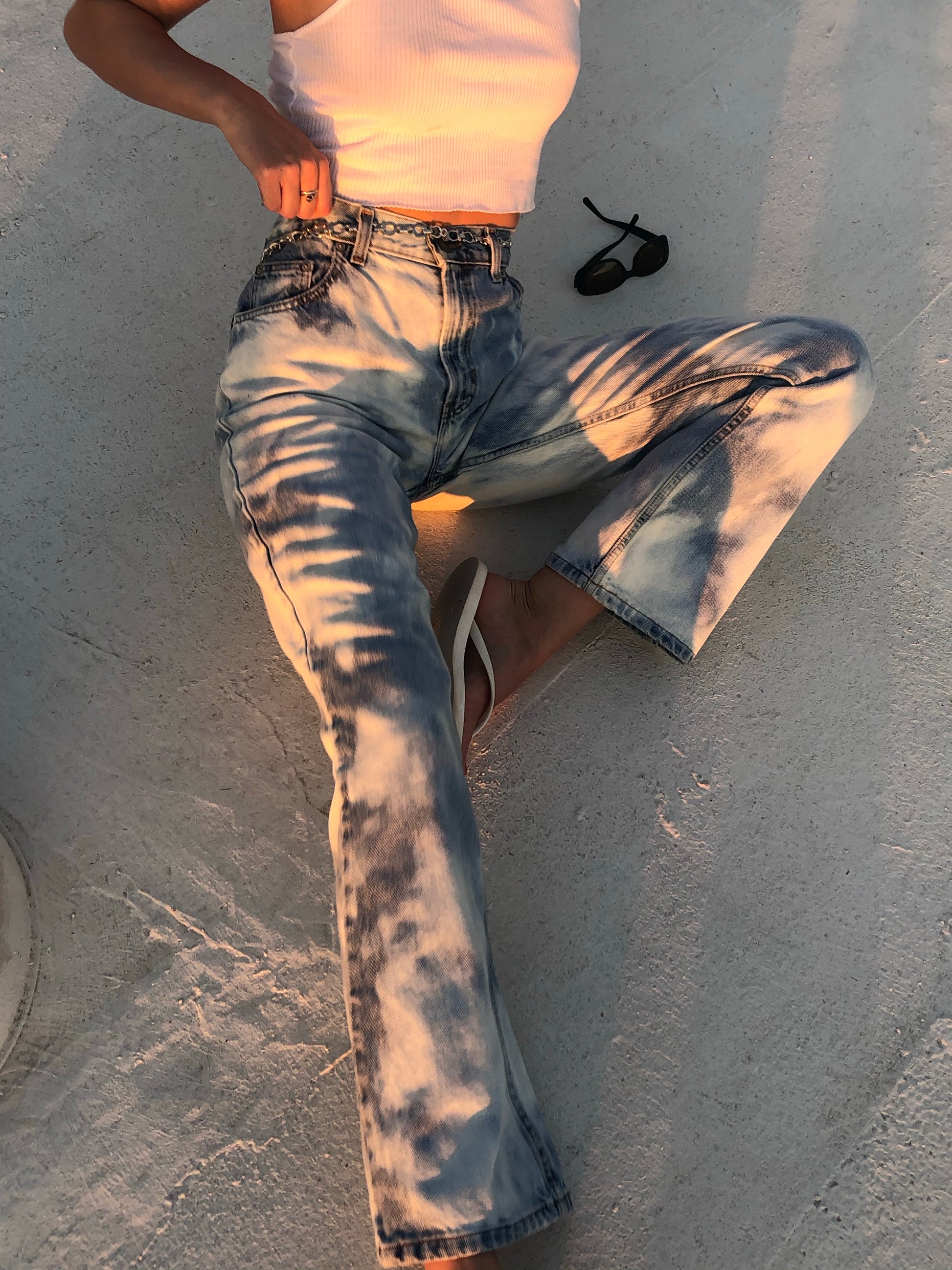 Upcycled and bleach dyed baggy boot leg 90’s light wash jeans