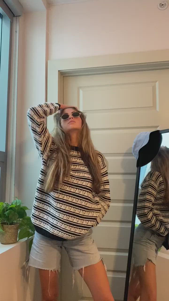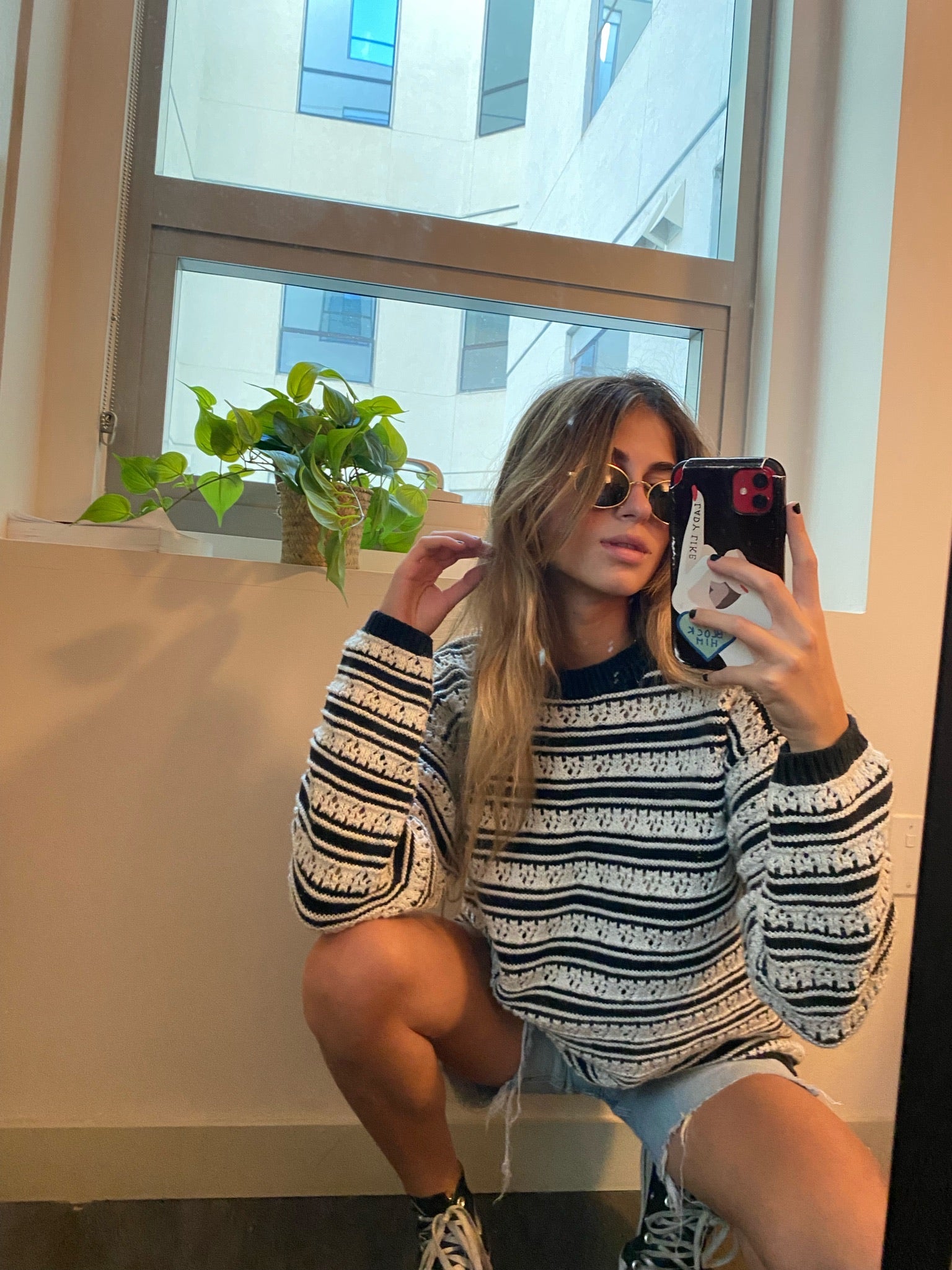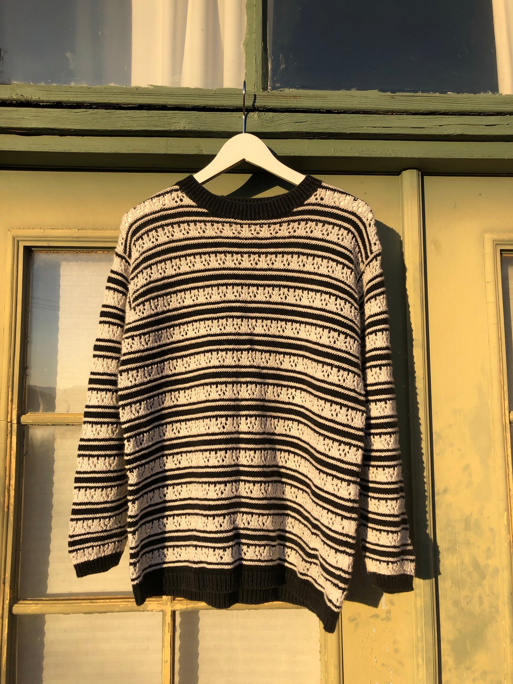 Upcycled crew neck knit sweater with horizontal black and white stripes. Tag says size medium but fits more like a large. Wear oversized with some bike shorts and high top chunks or layered over a crisp white collared button down!
