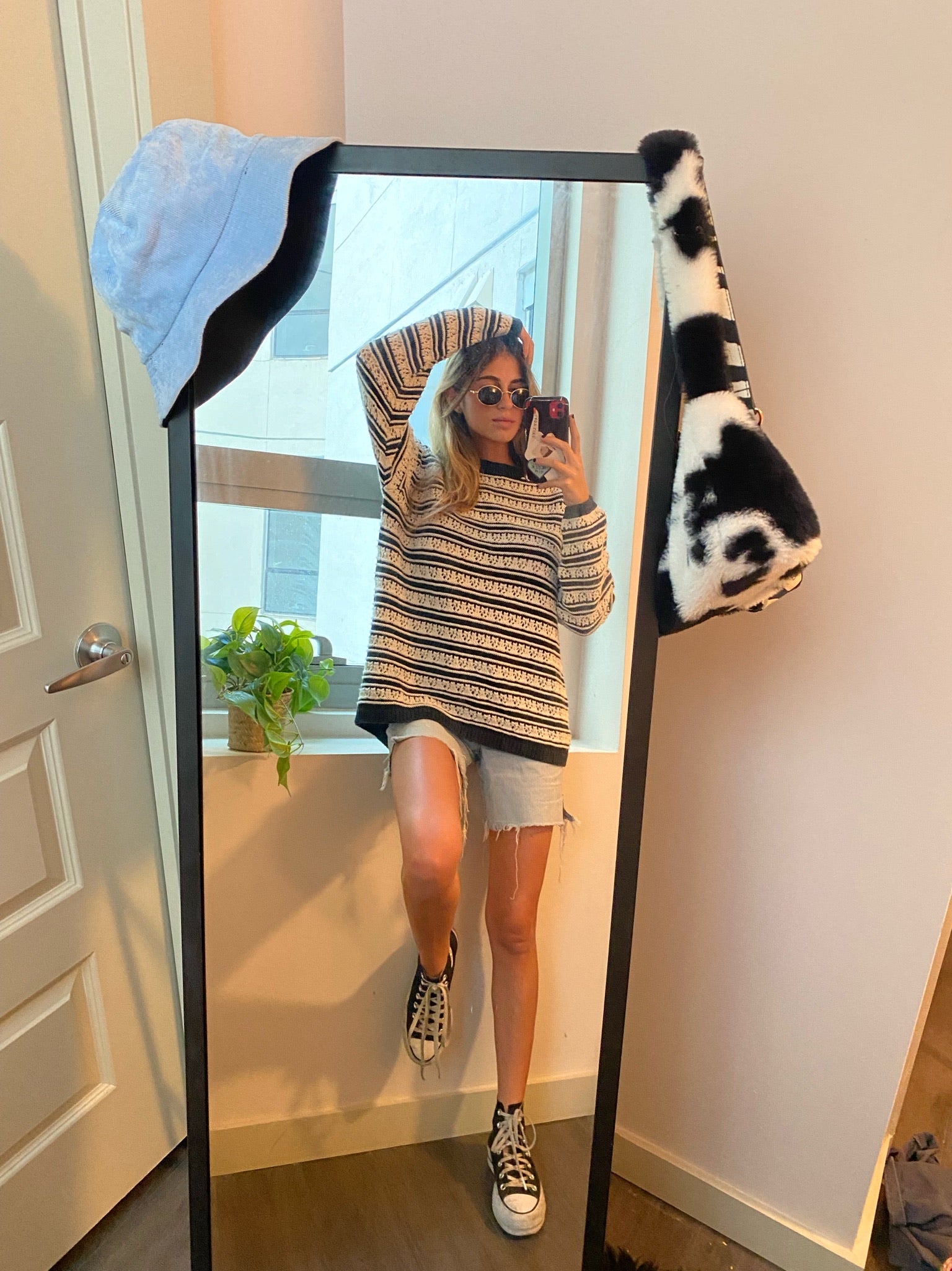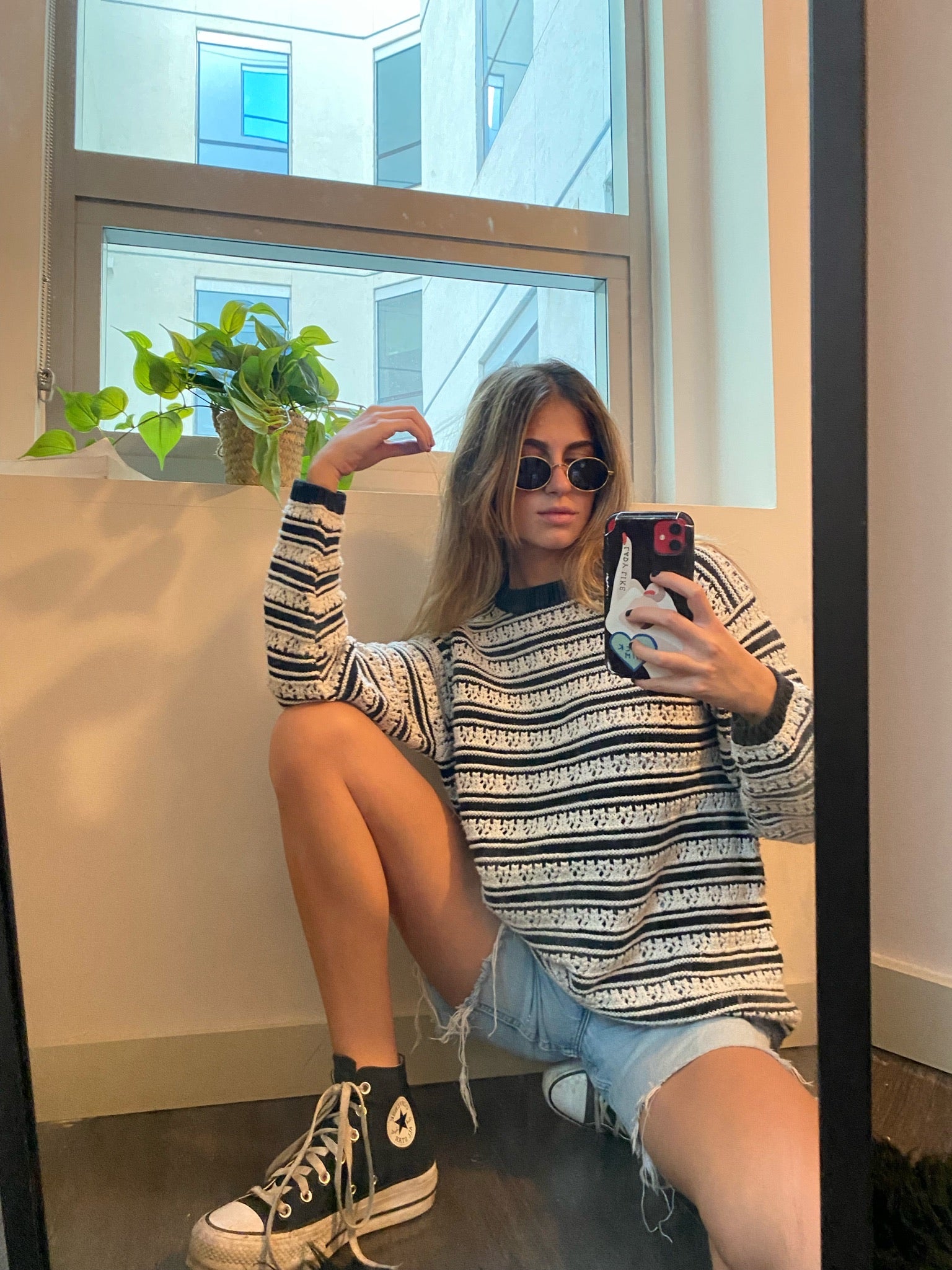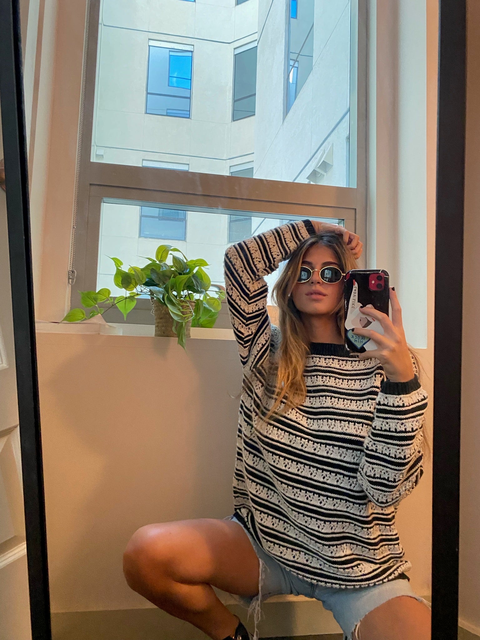 Upcycled crew neck knit sweater with horizontal black and white stripes. Tag says size medium but fits more like a large. Wear oversized with some bike shorts and high top chunks or layered over a crisp white collared button down!