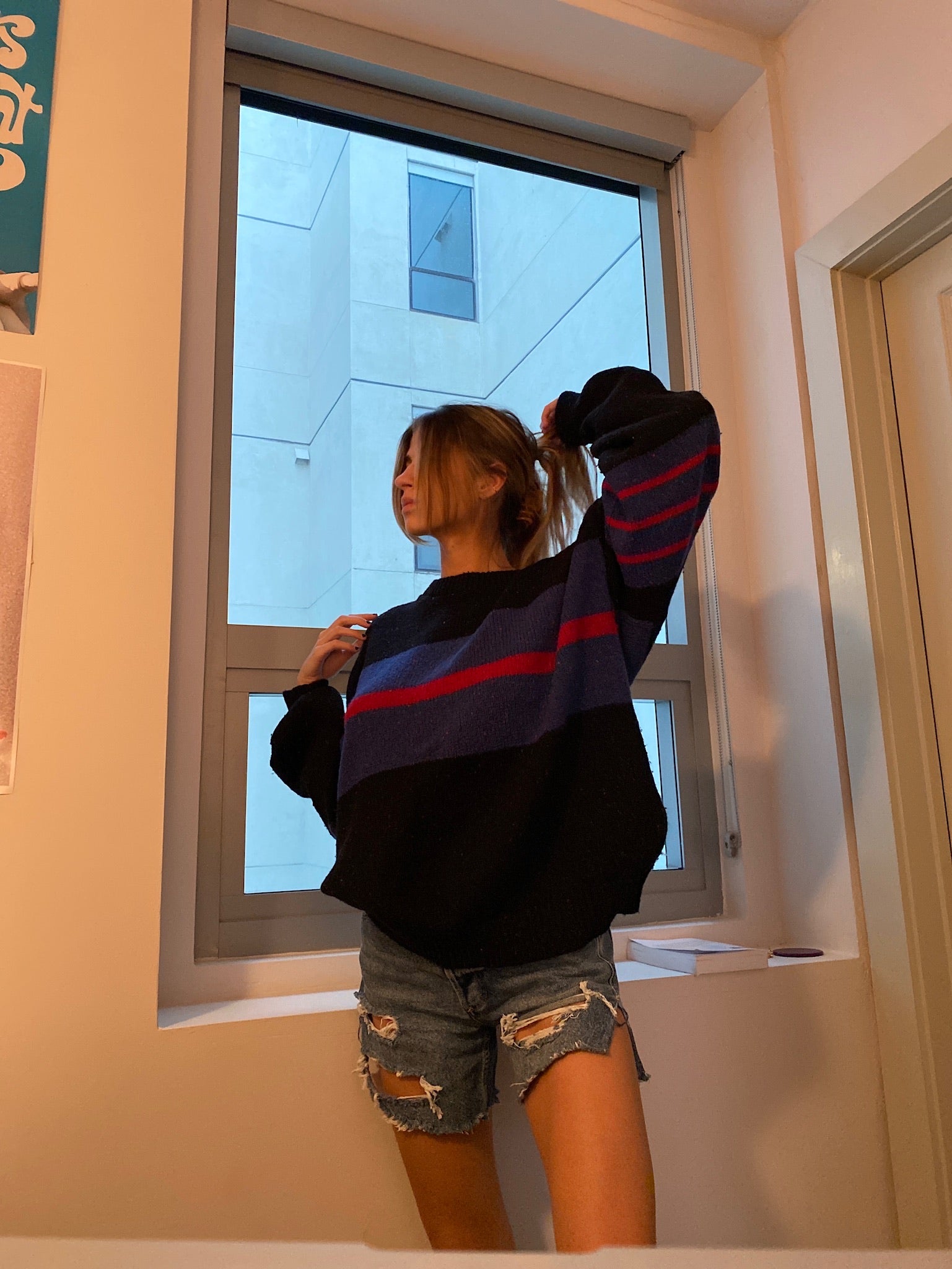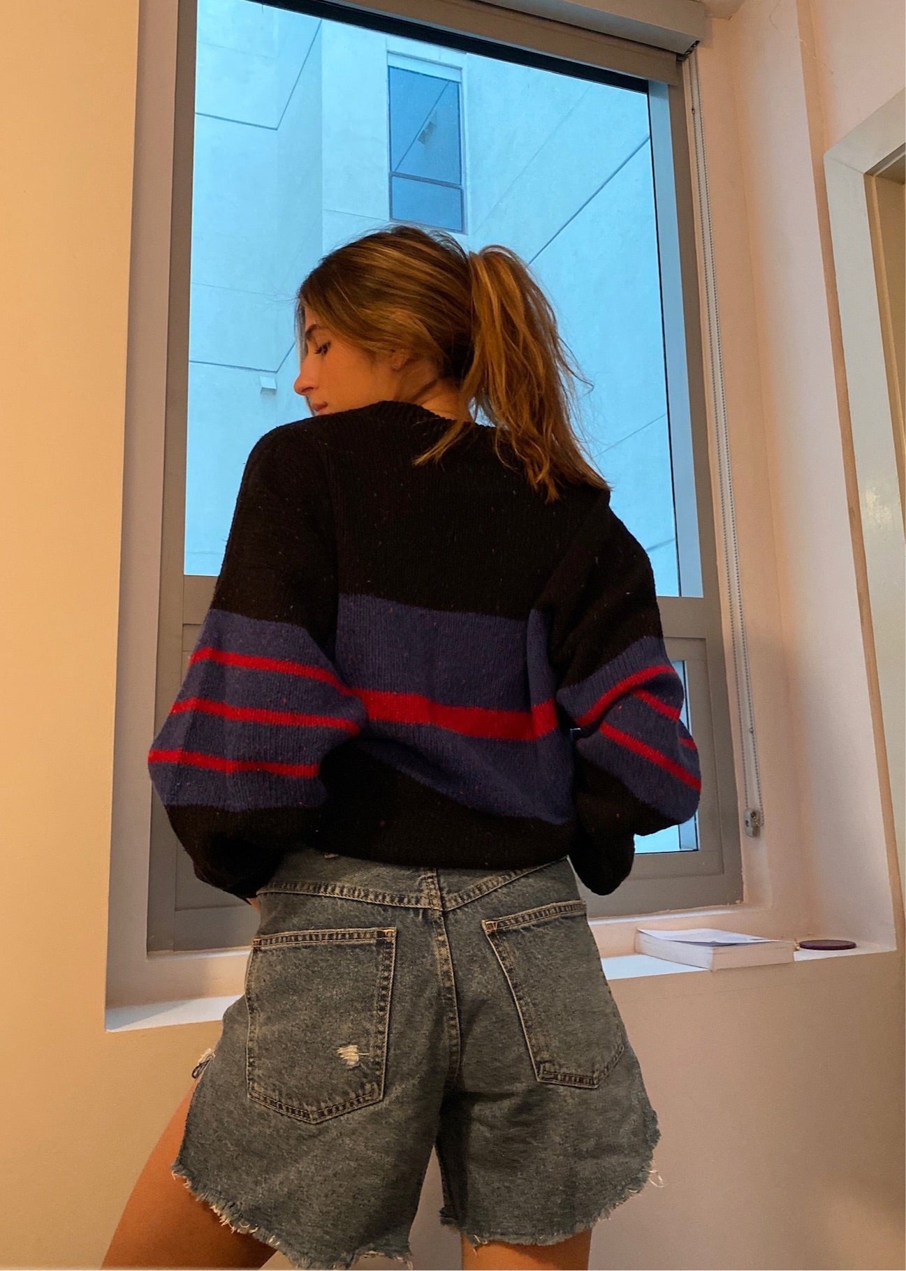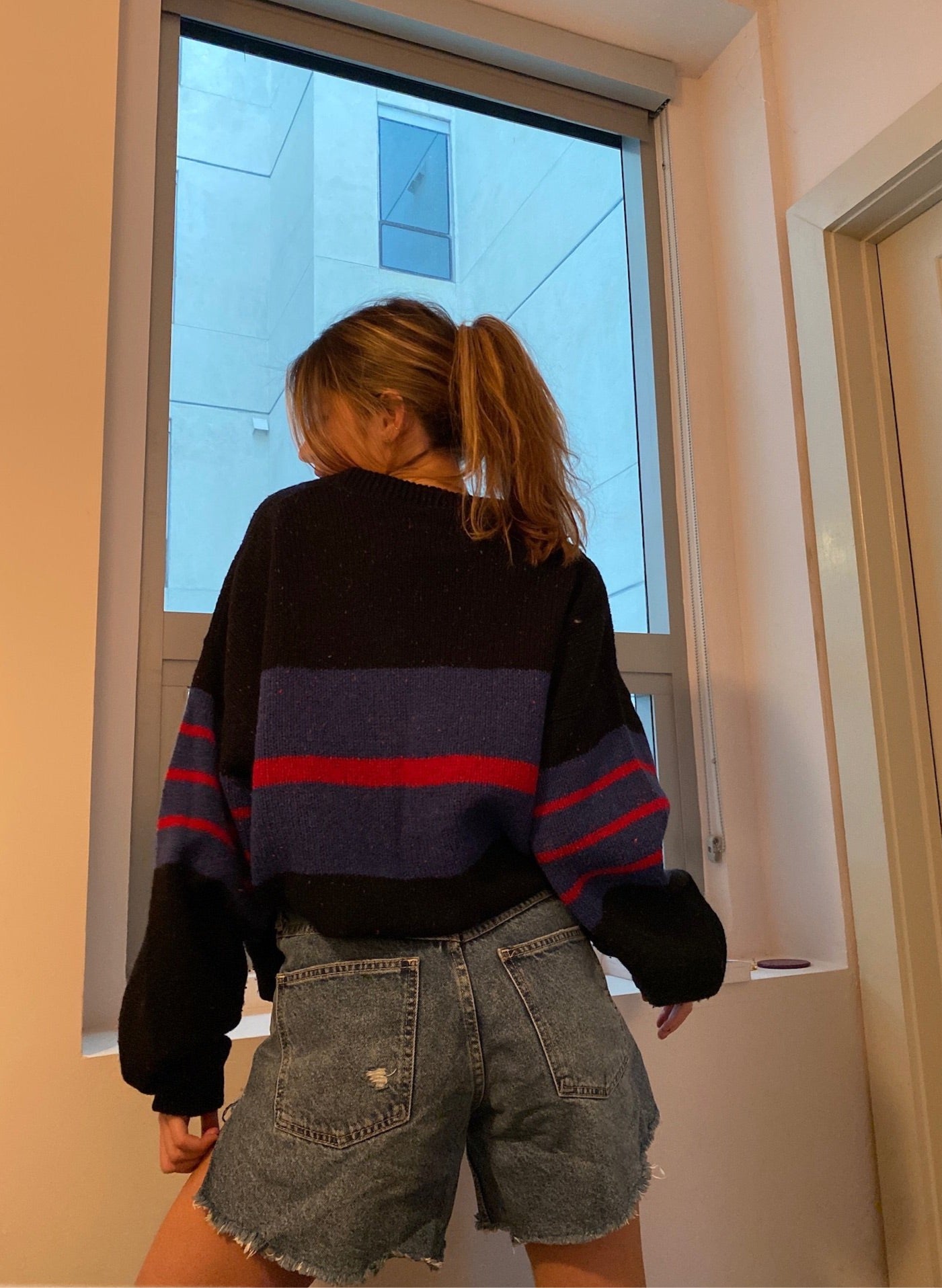 Vintage black knit sweater with red and blue stripe detail. An oversized chunky cozy piece to warm up your wardrobe.