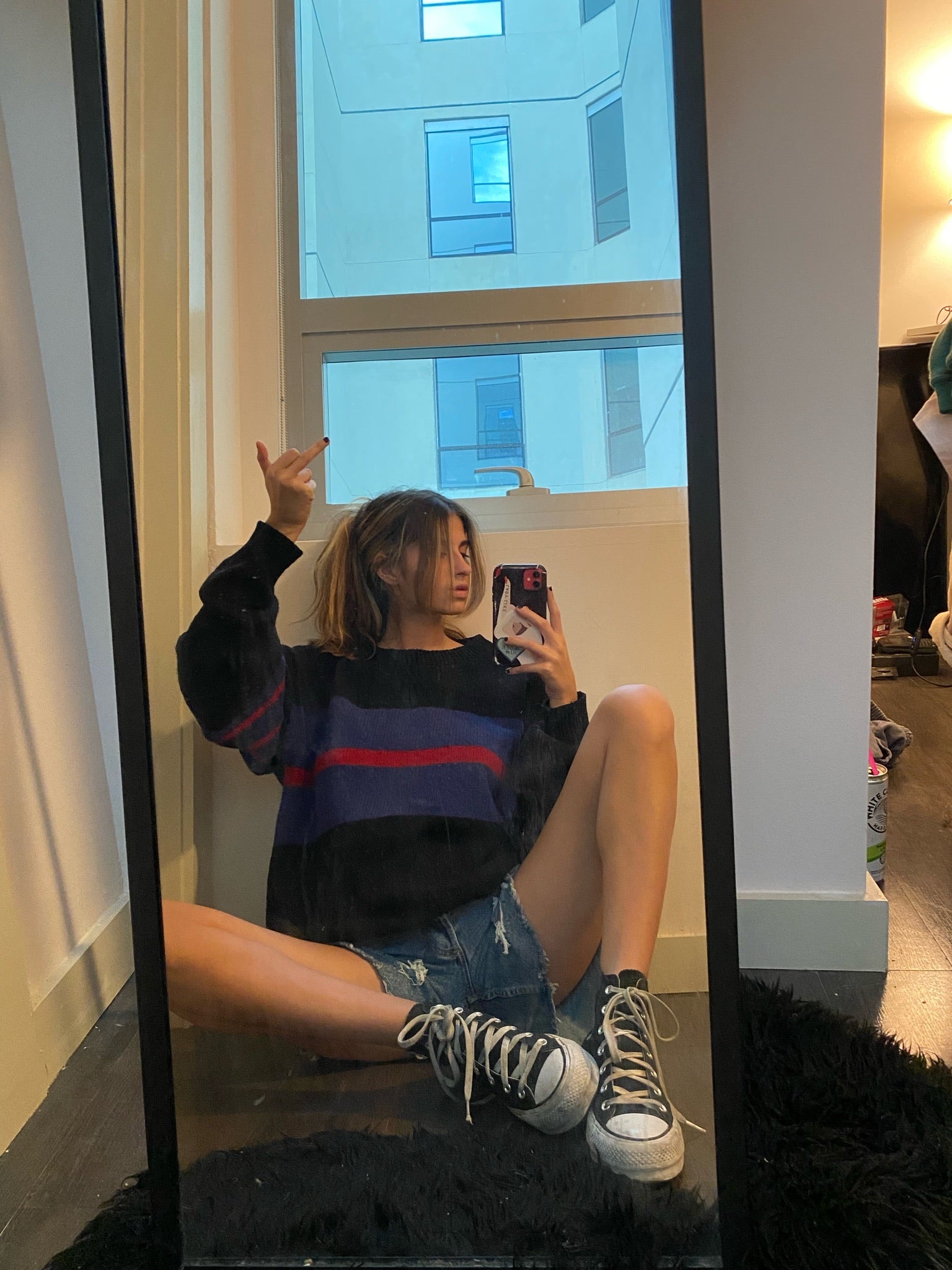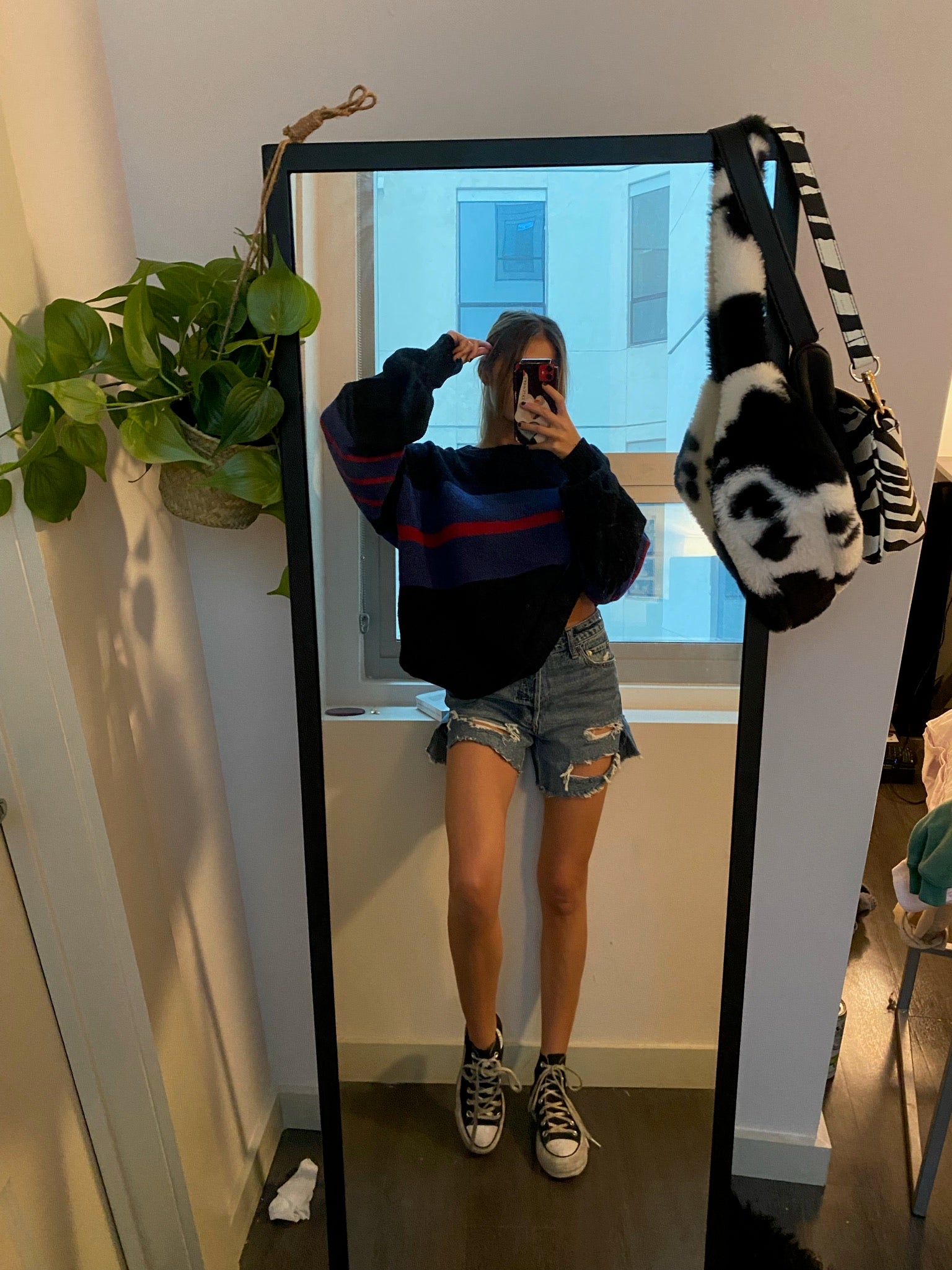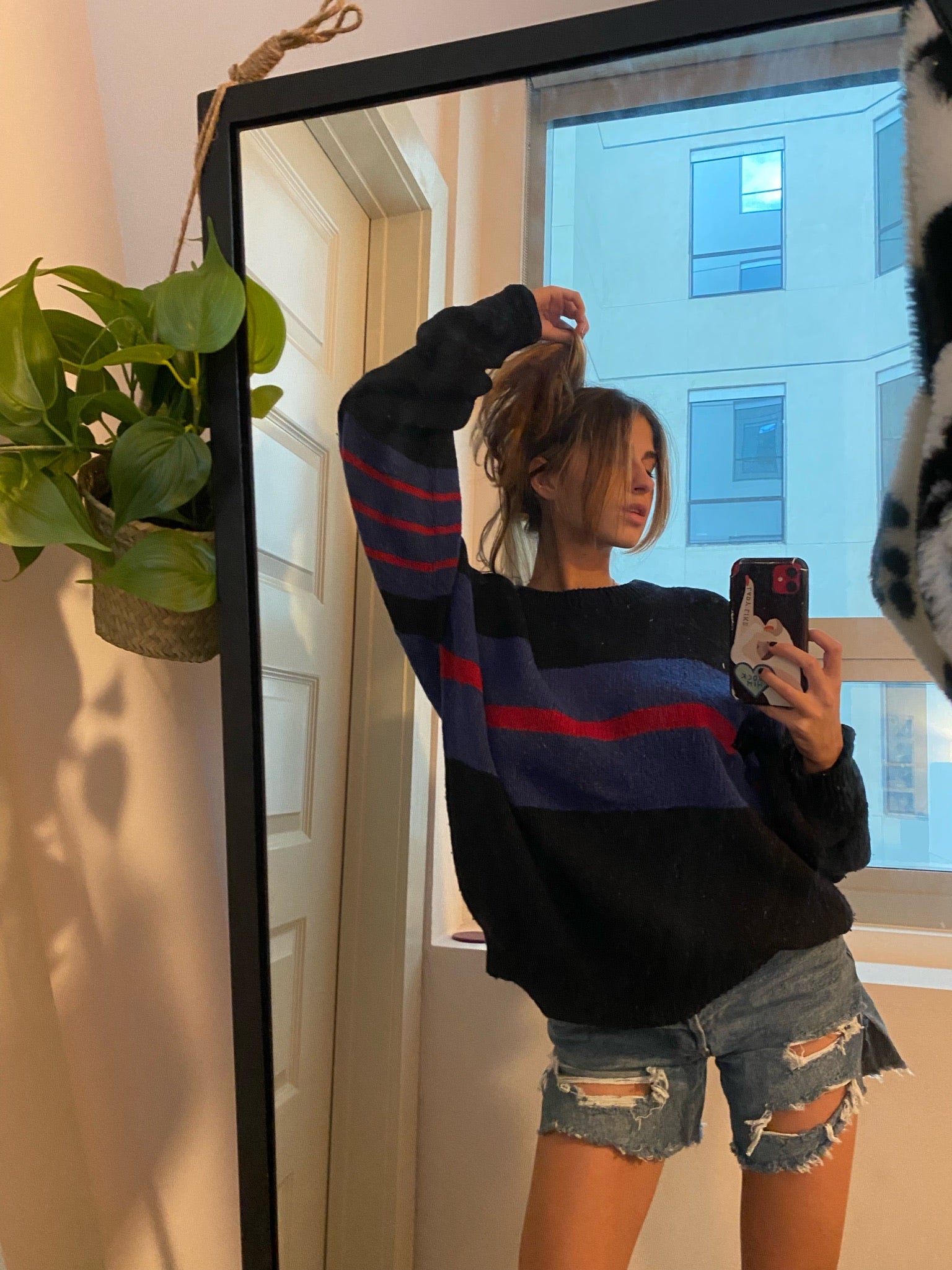 Vintage black knit sweater with red and blue stripe detail. An oversized chunky cozy piece to warm up your wardrobe.