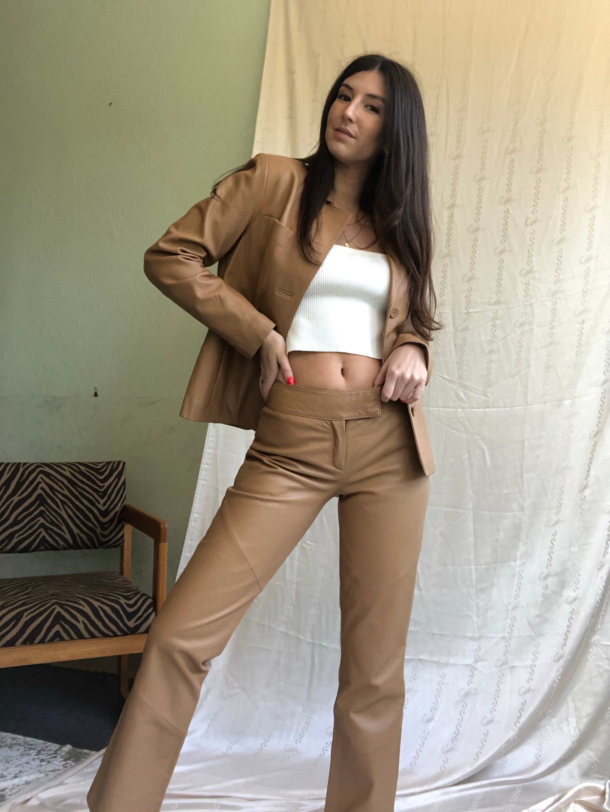 90’s Wilson tan leather high waisted zip front boot cut pants