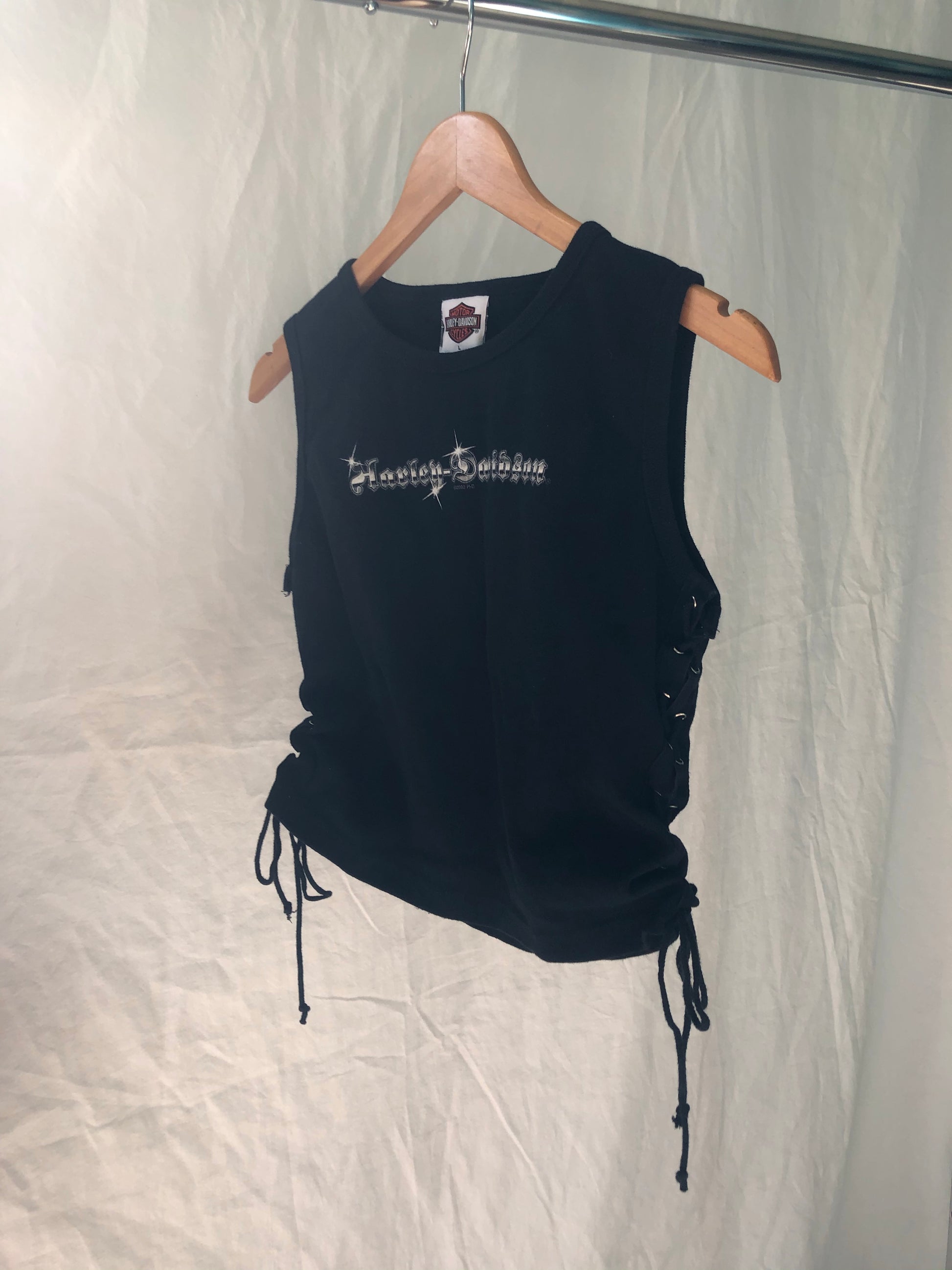 Lace up cinch tie adjustable sides black vintage ‘02 Harley Davidson sleeveless top