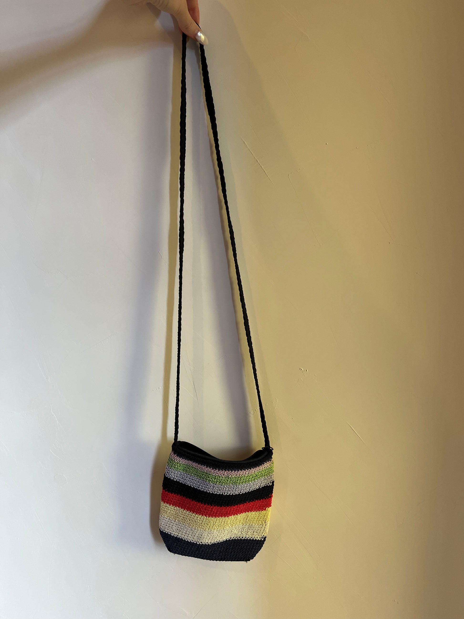 A 1990’s vibe. This mini crochet color stripe long shoulder bag features a zipper closure. Pair with a denim maxi skirt and chunky oxford loafers.