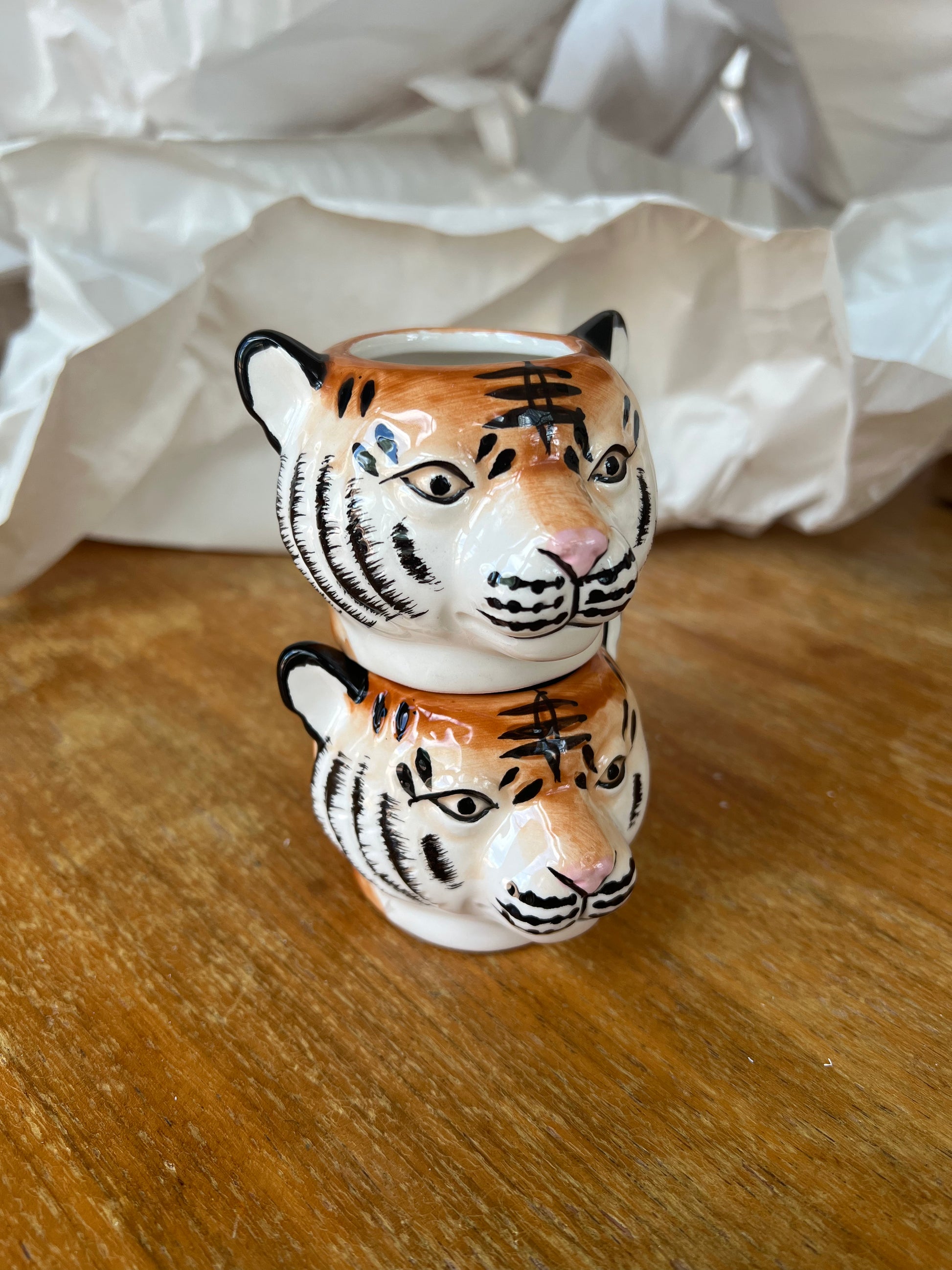 Set of two adorable ceramic painted tiger head dishes. These can be used as shot glasses, toothpick holders, make-up dishes, pill containers, and much more! Get creative!! These are so fun and cute.
