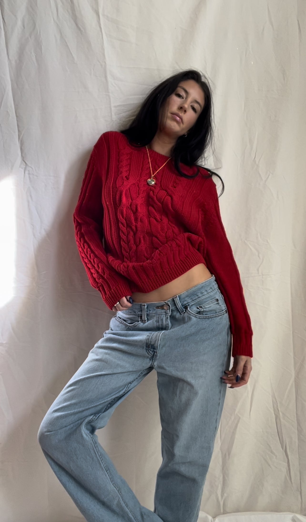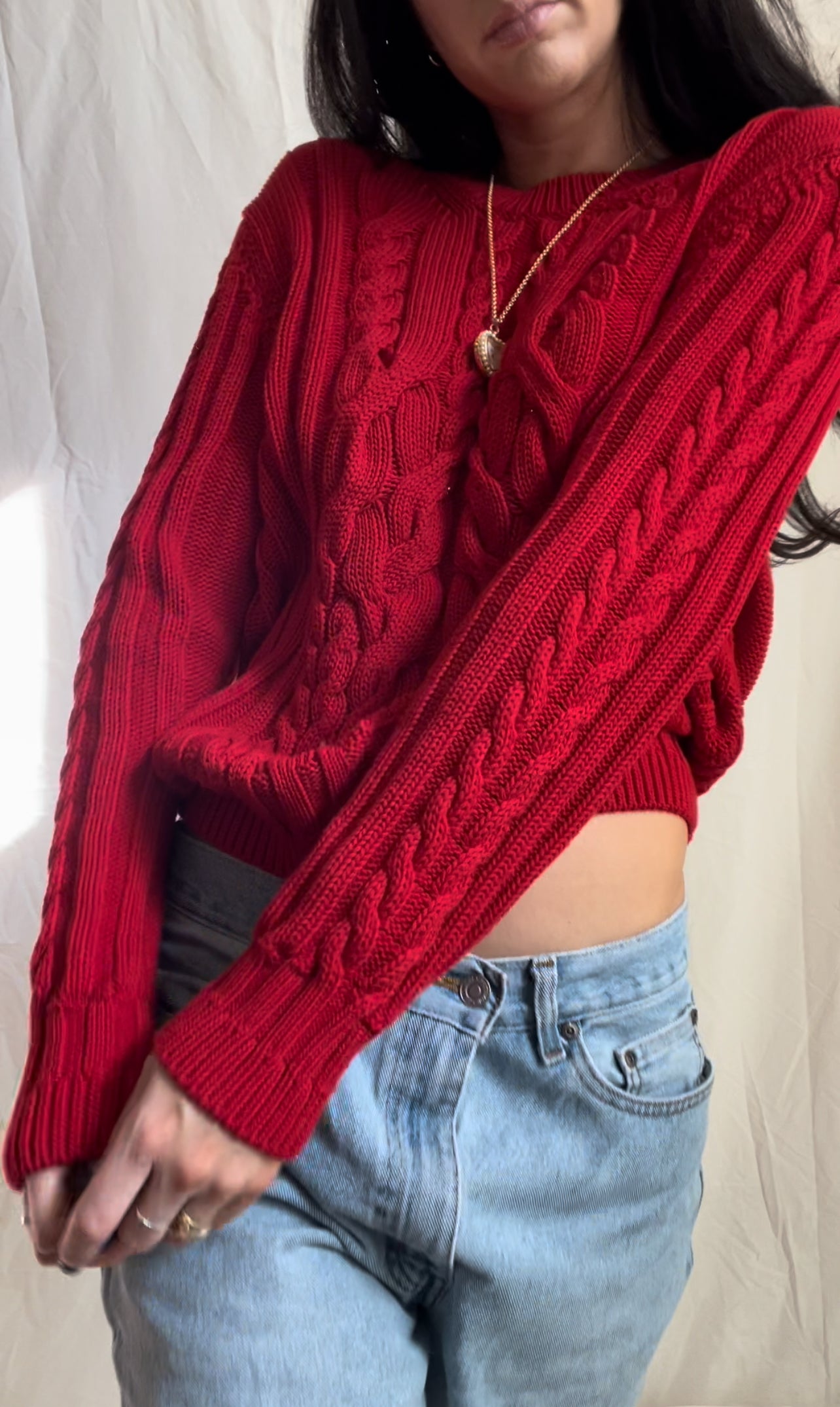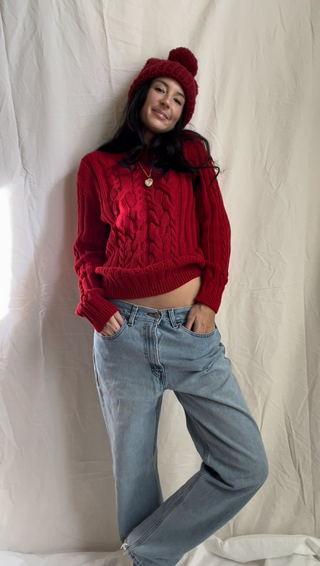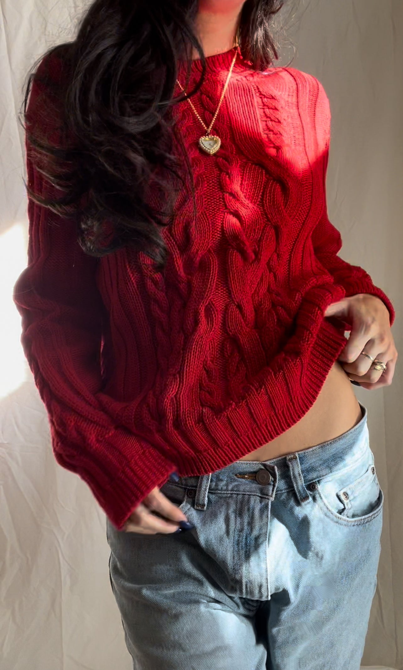Holly Berry red chunky knit crew neck sweater. The perfect holiday piece that carries over to Valentine’s Day!