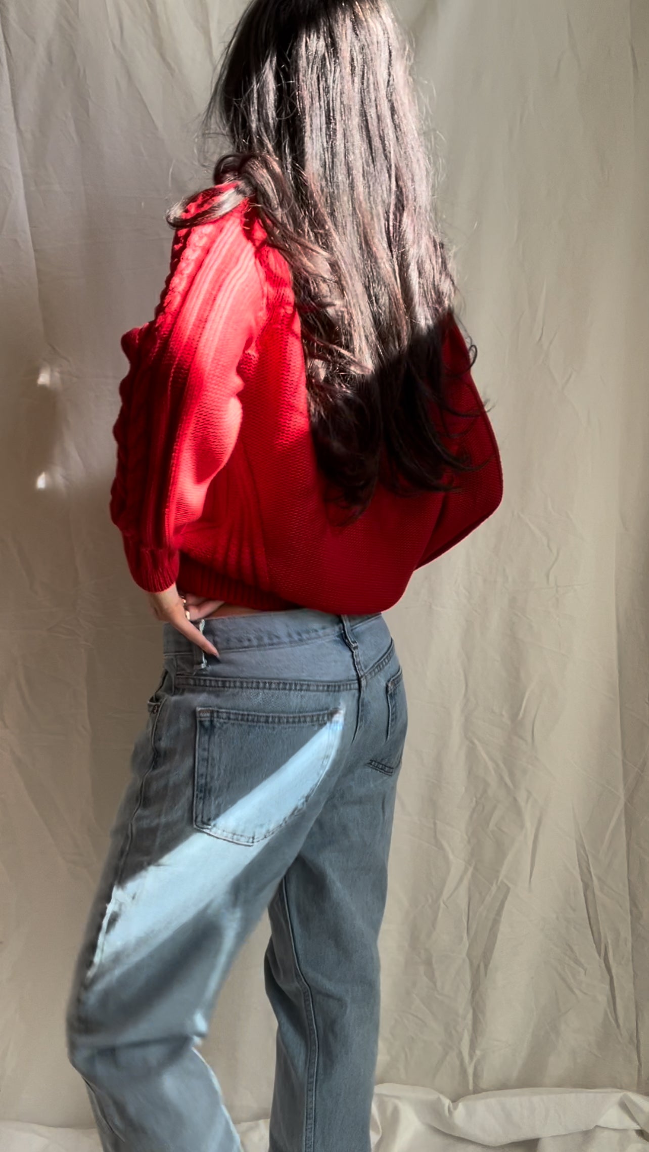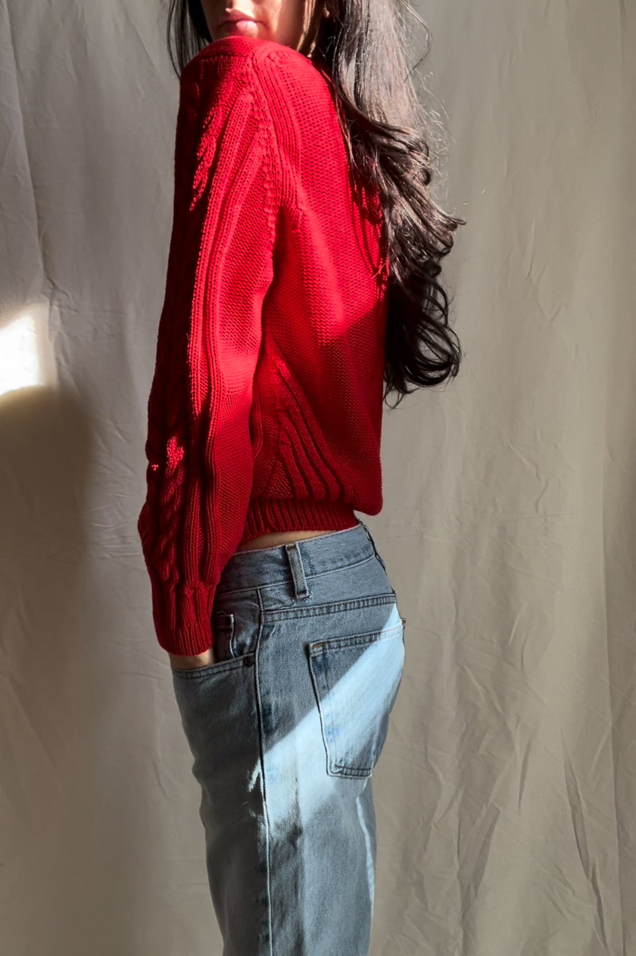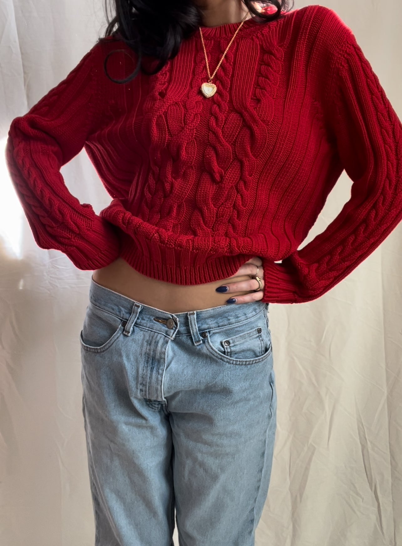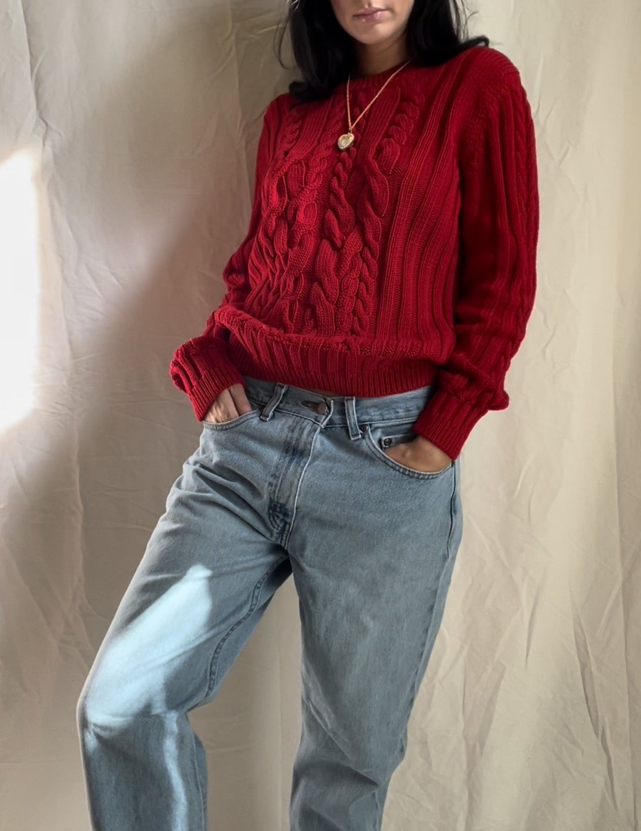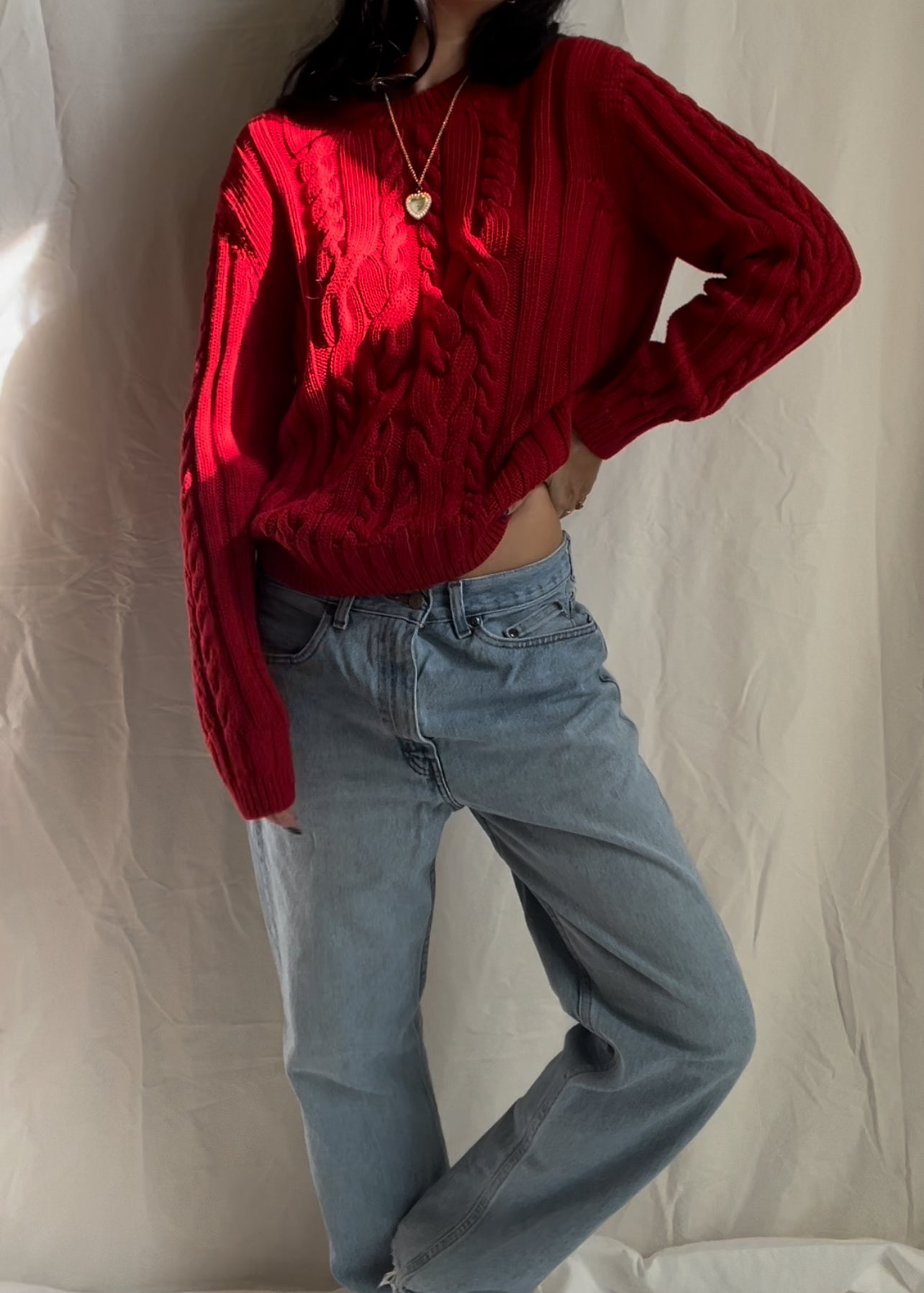 Holly Berry red chunky knit crew neck sweater. The perfect holiday piece that carries over to Valentine’s Day!