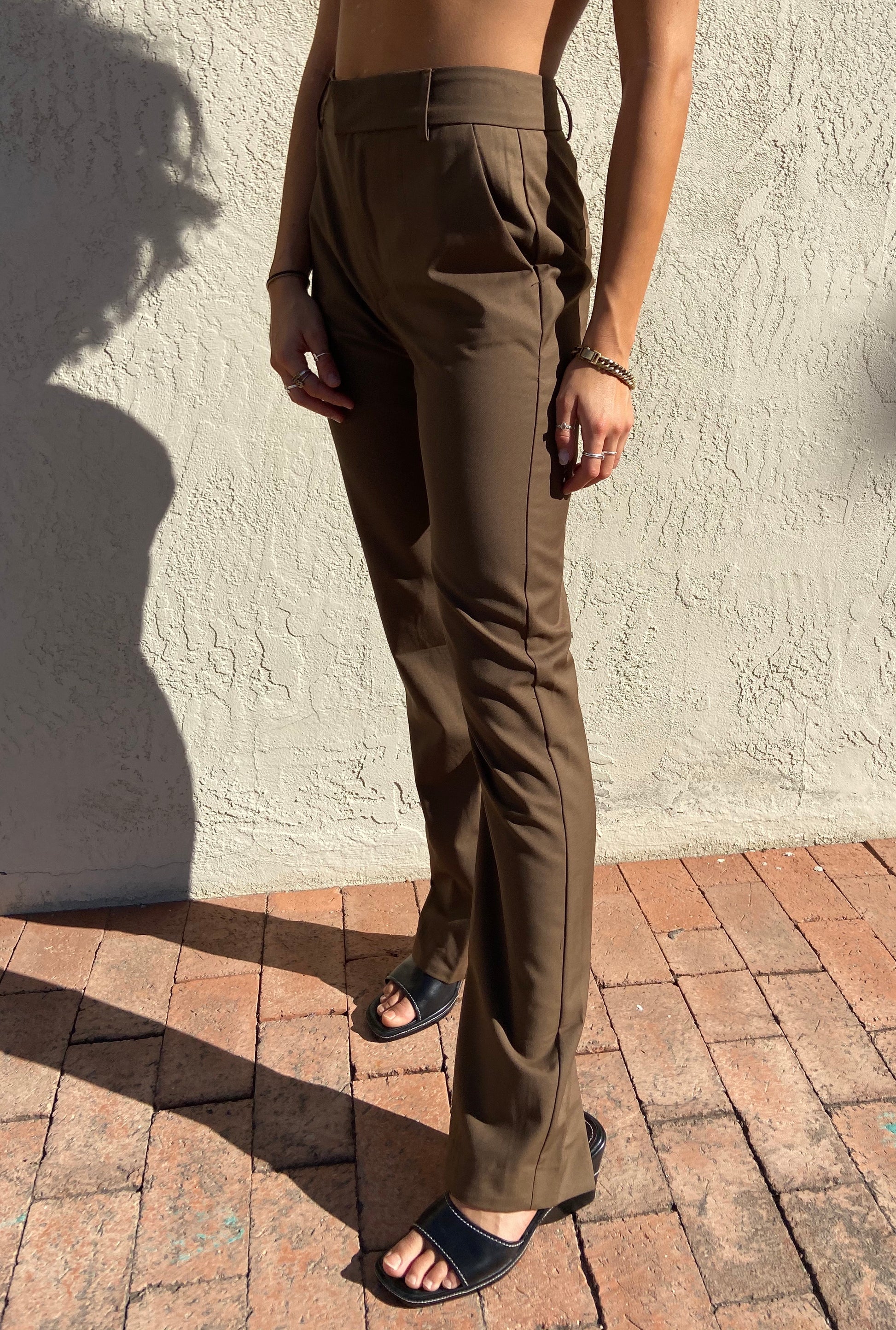 High waisted fitted trouser pants with slight flare bottoms with slits