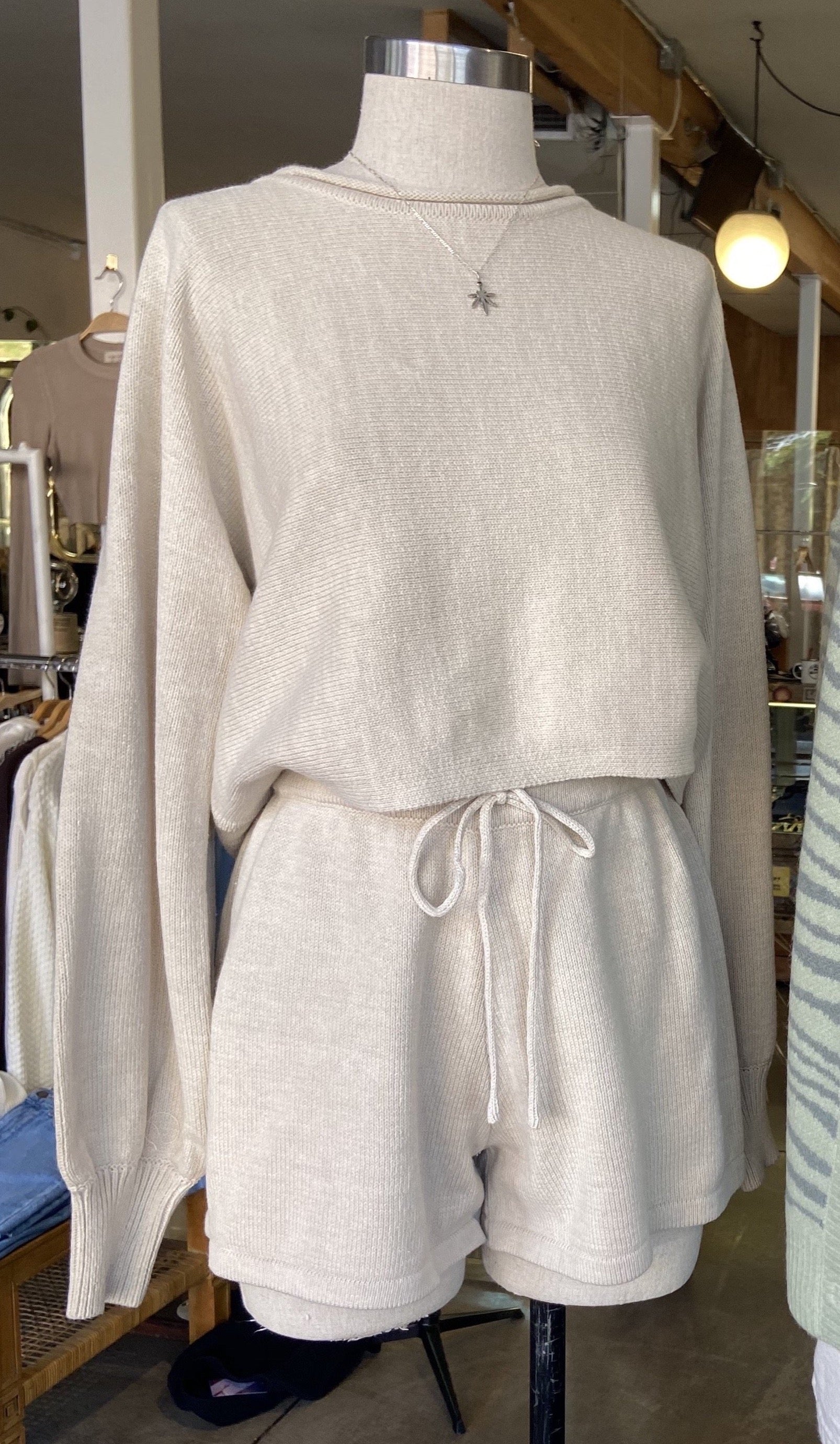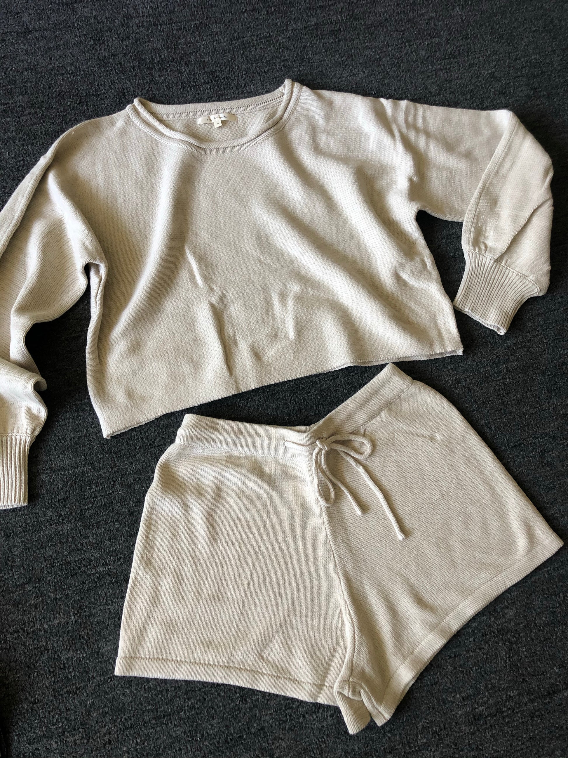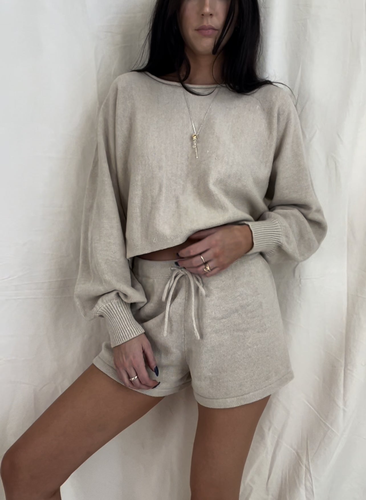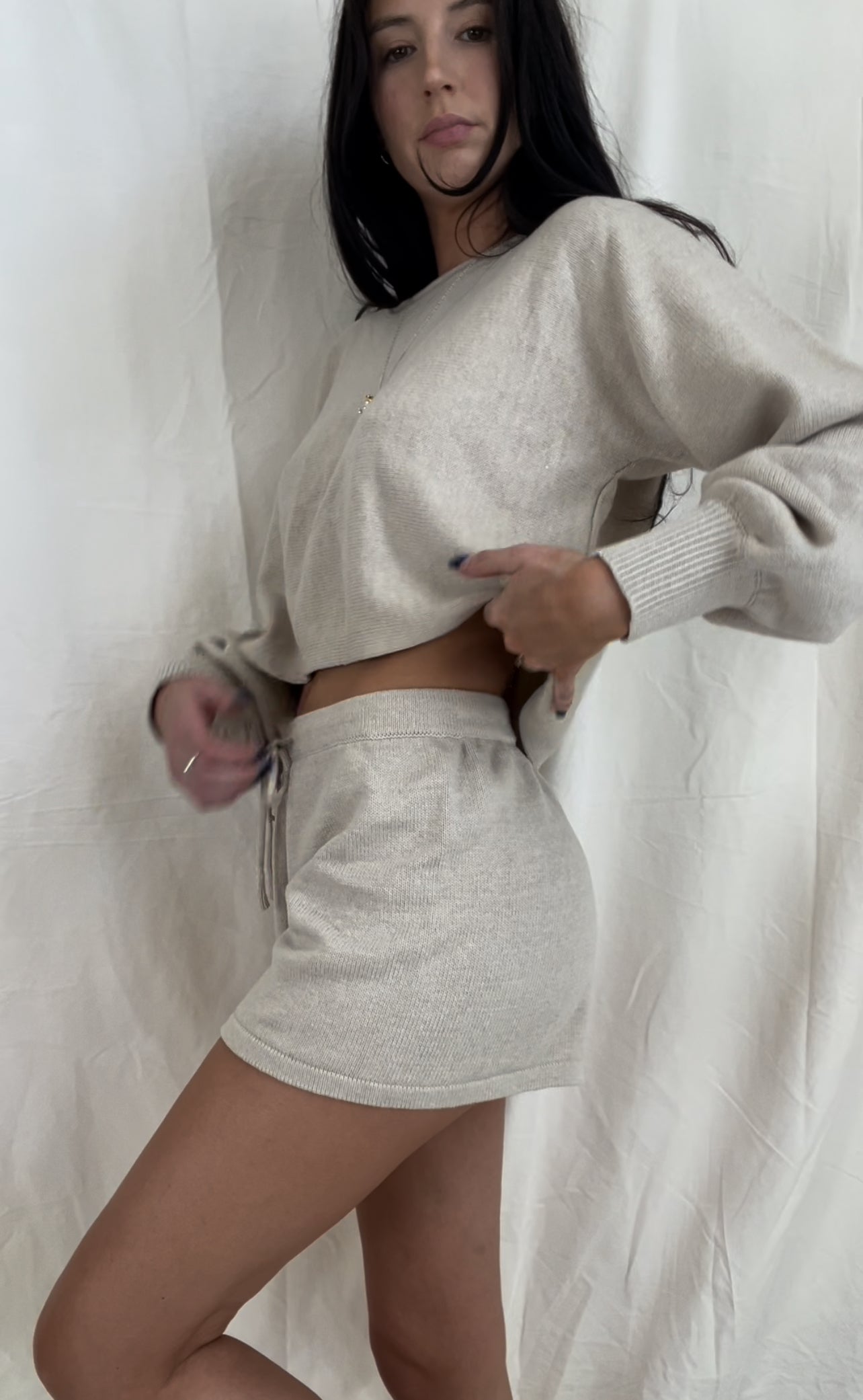 The ultimate comfy lounge set! Sit back, relax & look cute. This luxurious knit oatmeal set features drawstring high waist shorts with a slightly cropped oversized comfy crewneck sweater.
