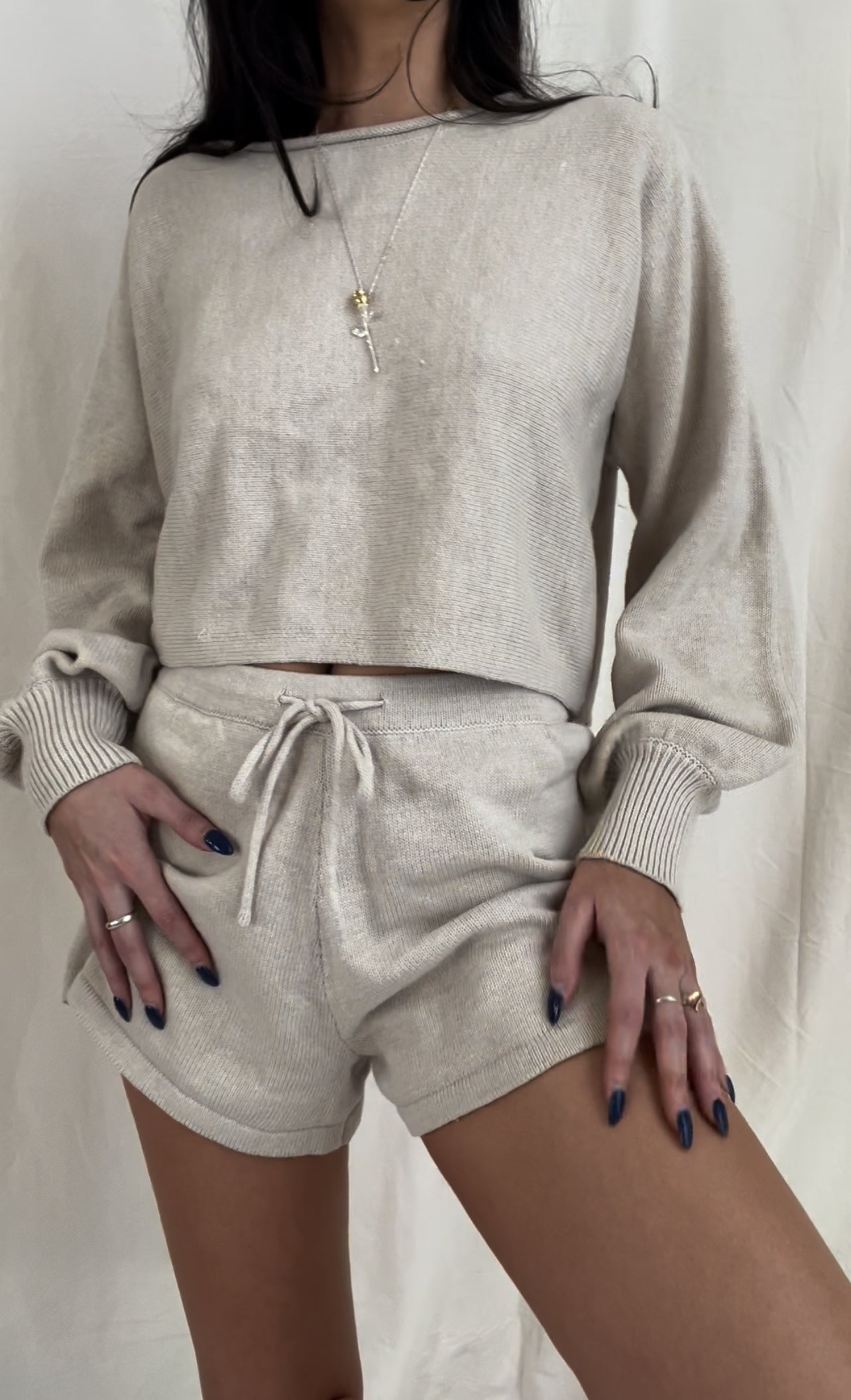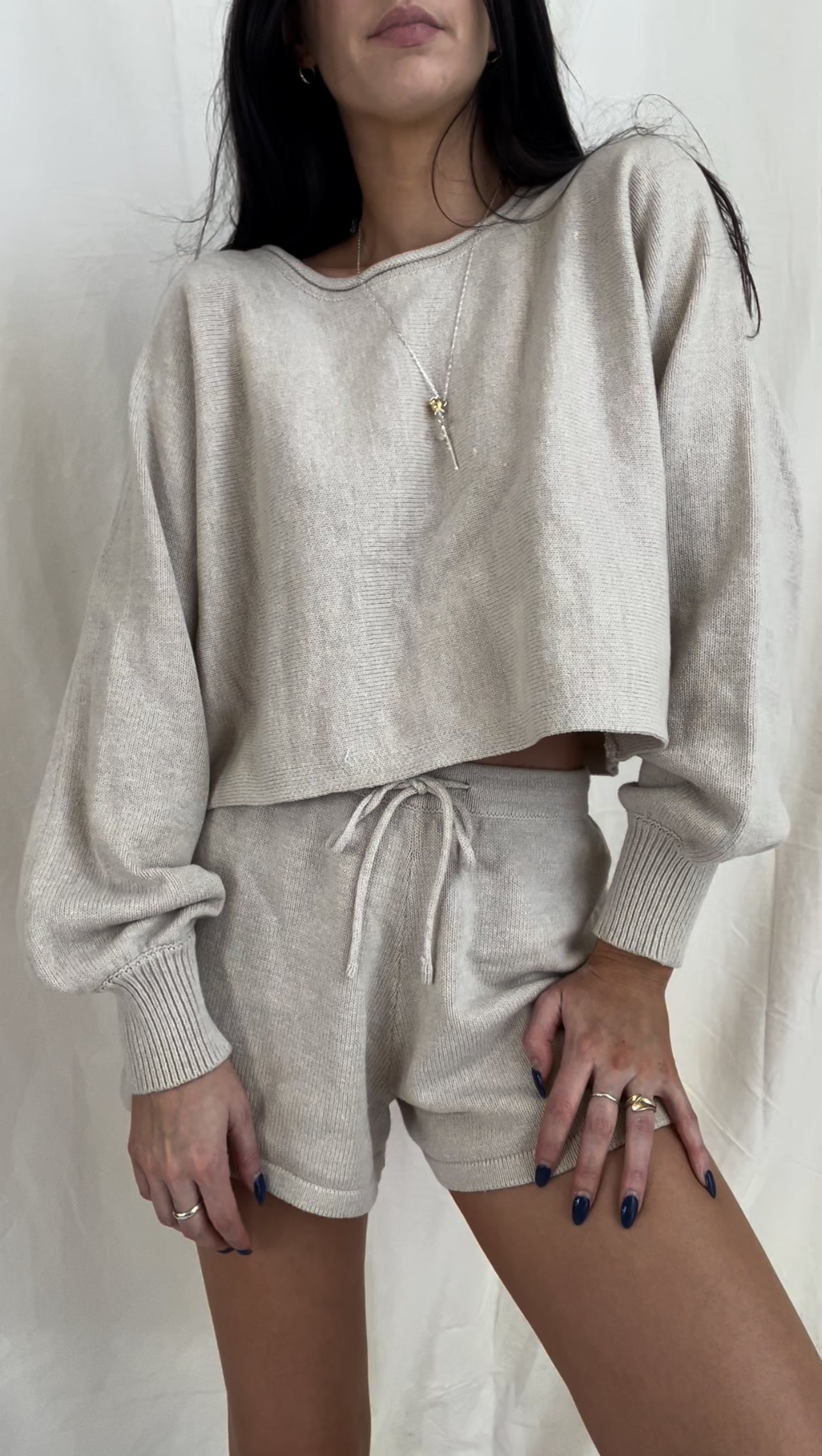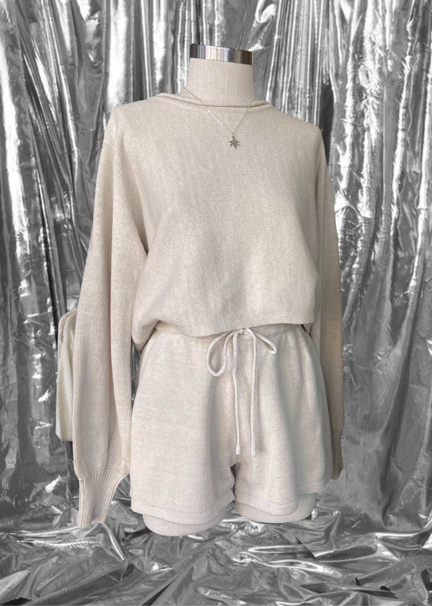 The ultimate comfy lounge set! Sit back, relax & look cute. This luxurious knit oatmeal set features drawstring high waist shorts with a slightly cropped oversized comfy crewneck sweater.