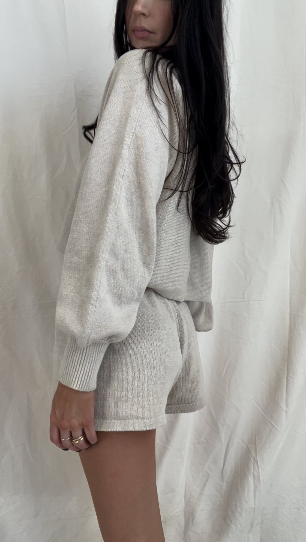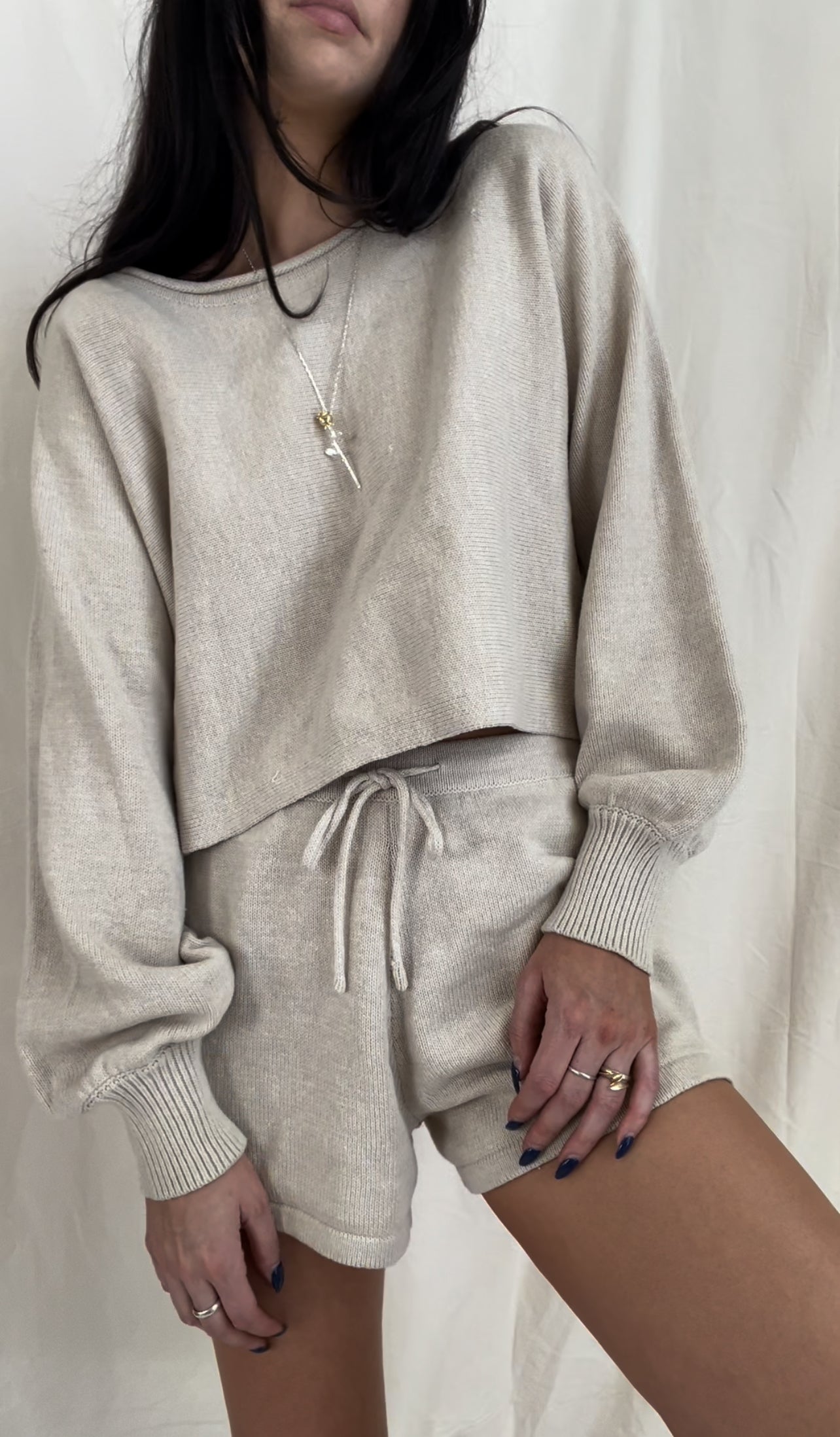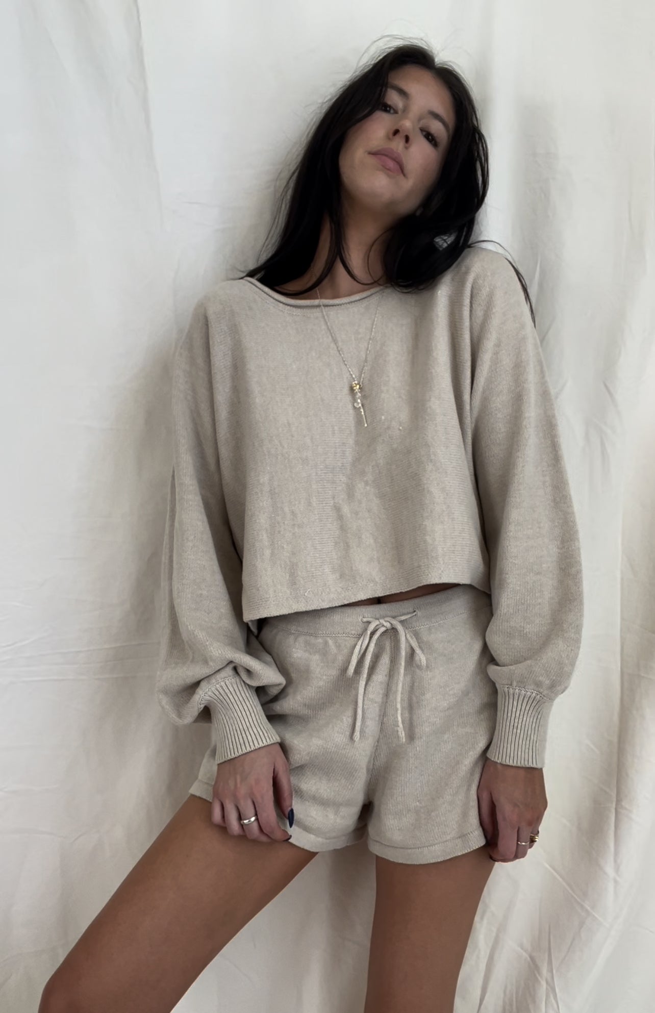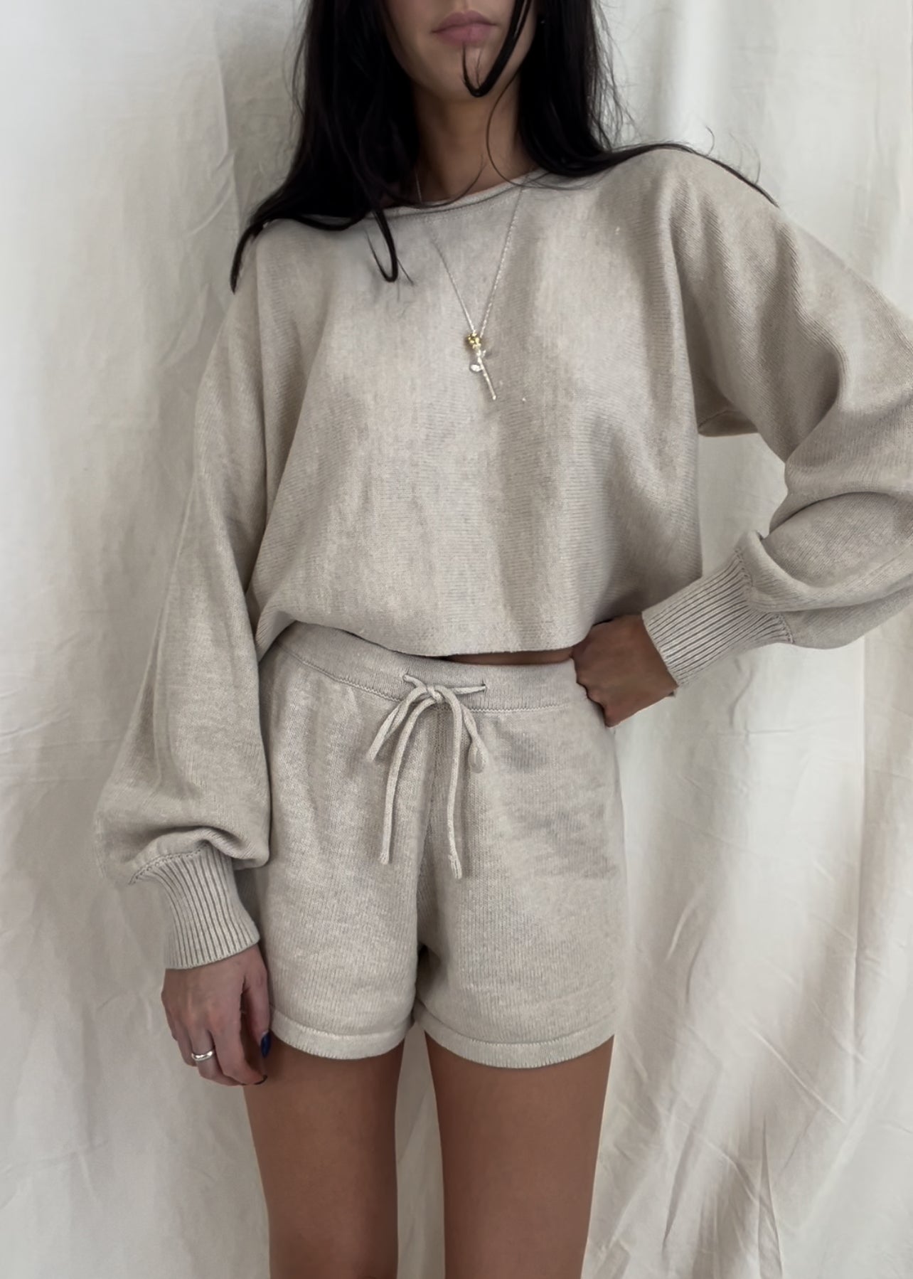 The ultimate comfy lounge set! Sit back, relax & look cute. This luxurious knit oatmeal set features drawstring high waist shorts with a slightly cropped oversized comfy crewneck sweater.