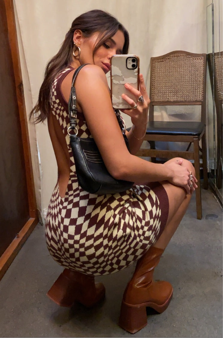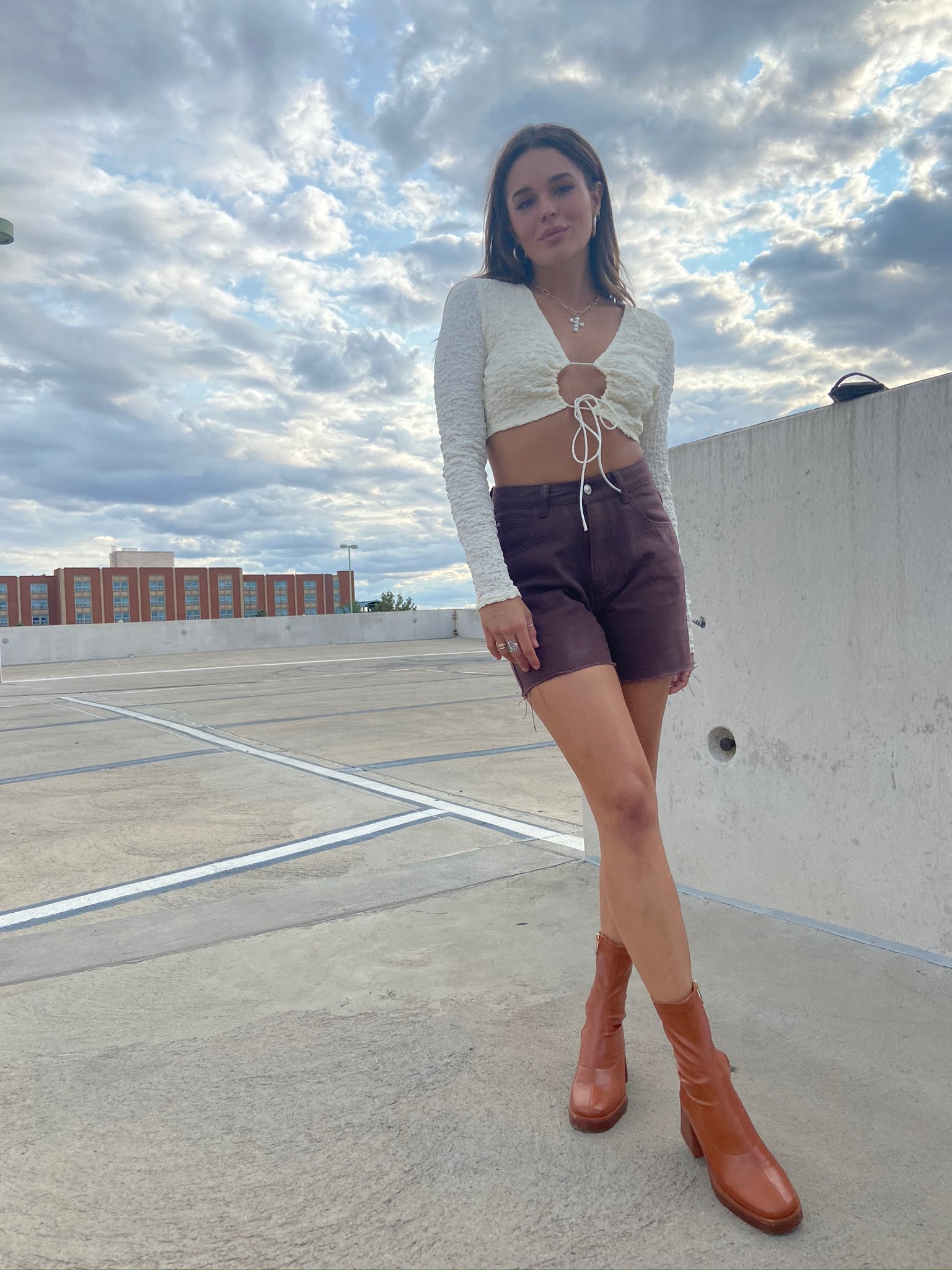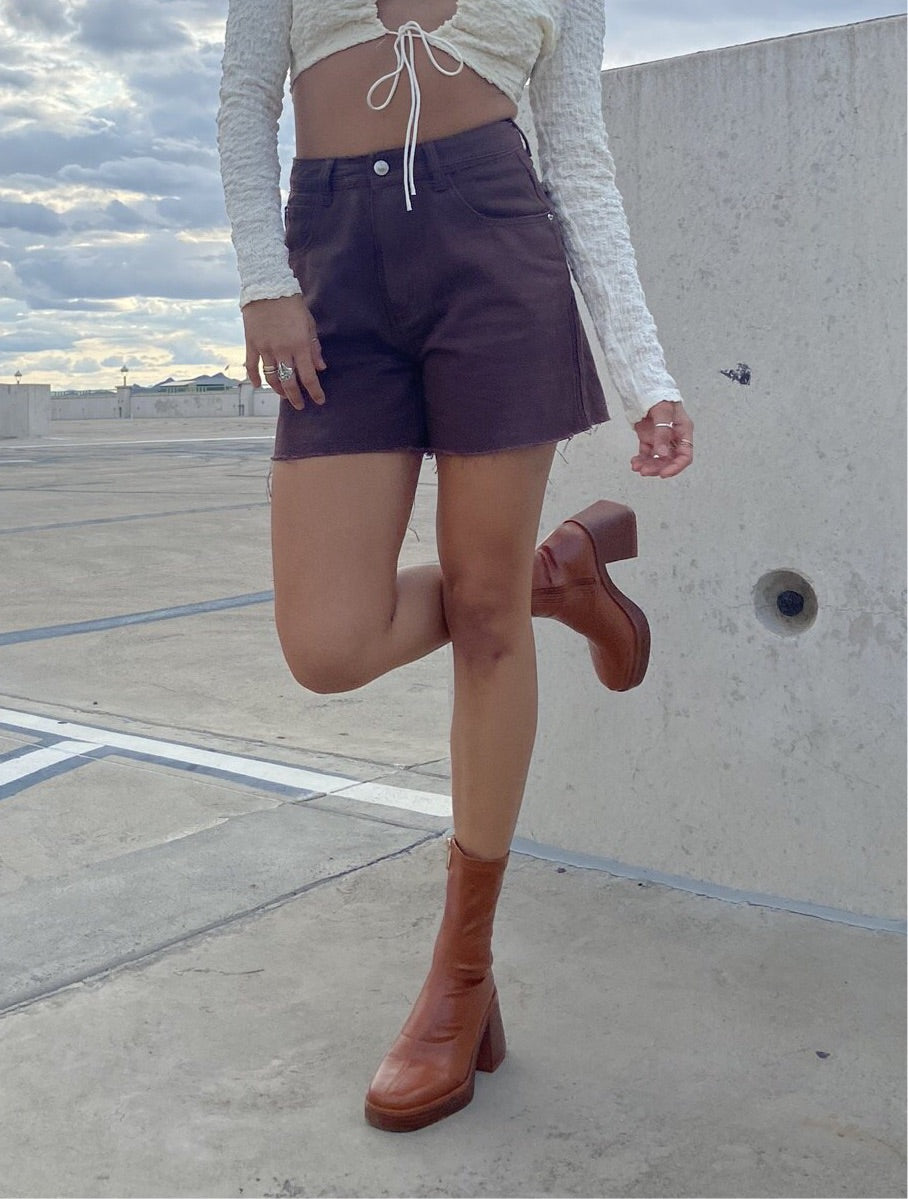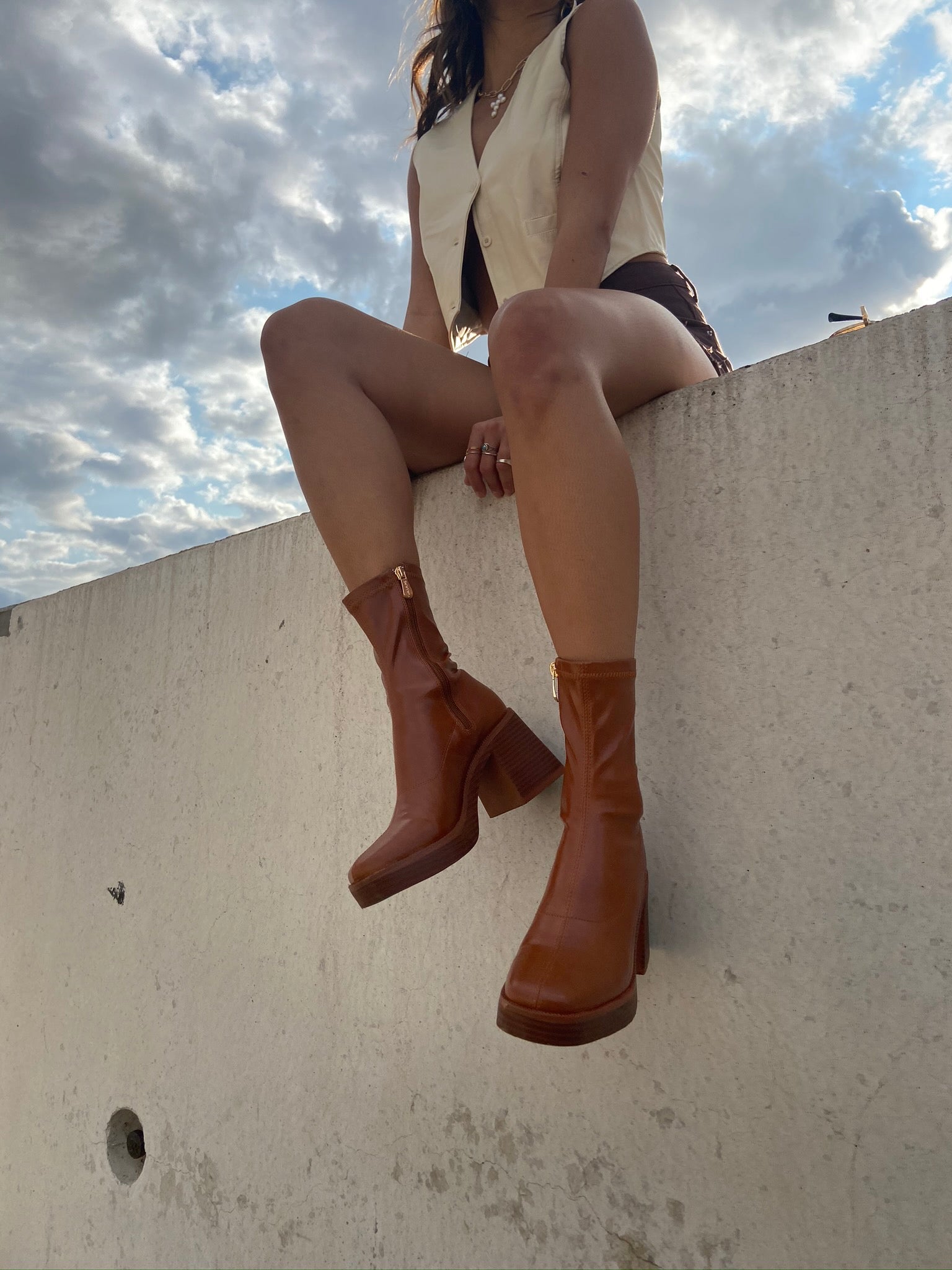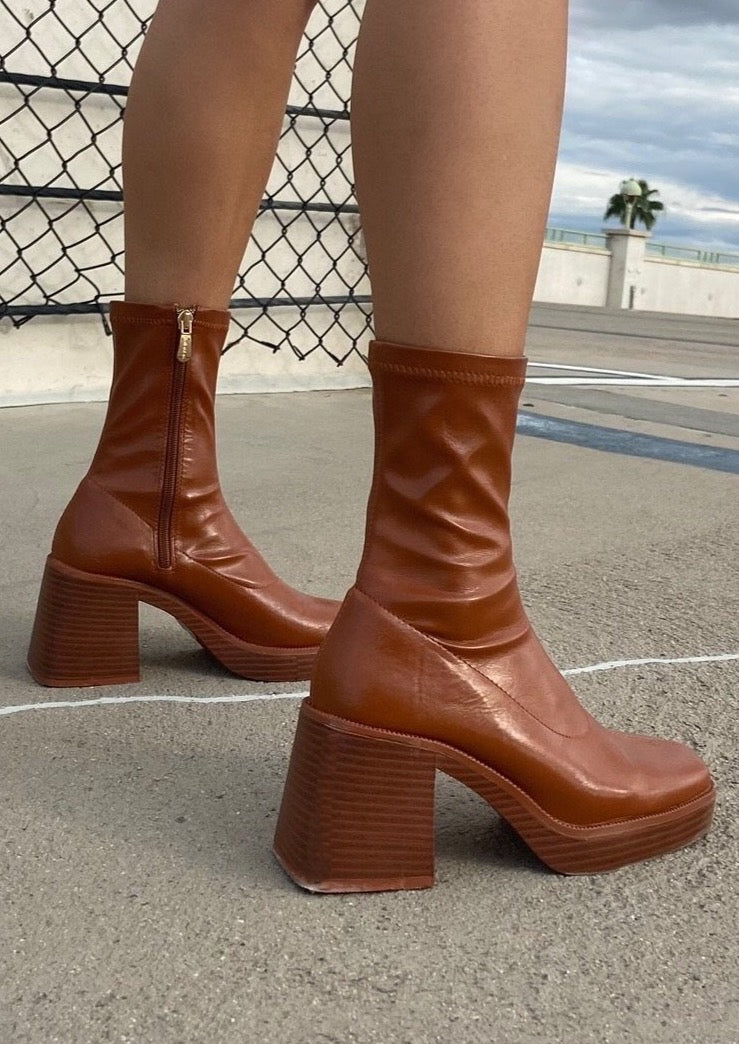 Square toe chunky heel faux leather boots in a cognac brown with zipper closure. These platform boots feature a super flattering slim ankle and are super comfortable! Our 1970’s dream shoe 🤎