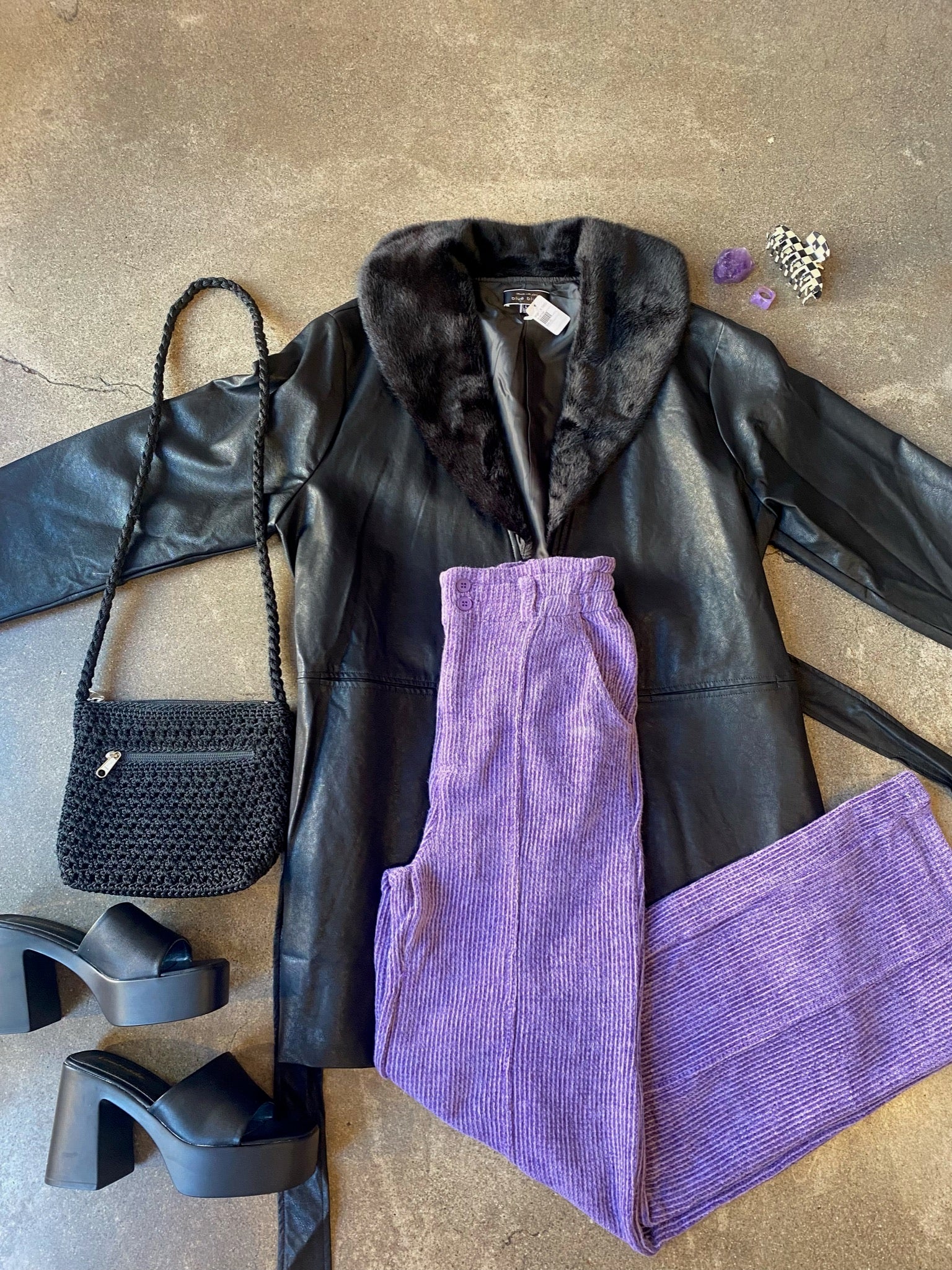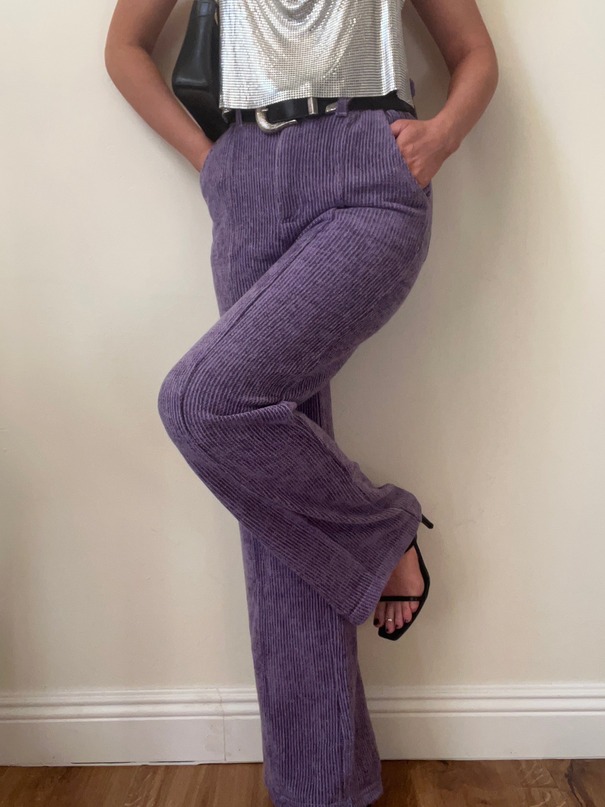 High waisted soft flowy straight leg ribbed purple pants. These 90’s style trouser pants come in bold amethyst and make the perfect statement. Pair with black boots and black sunglasses for the ultimate edgy look.