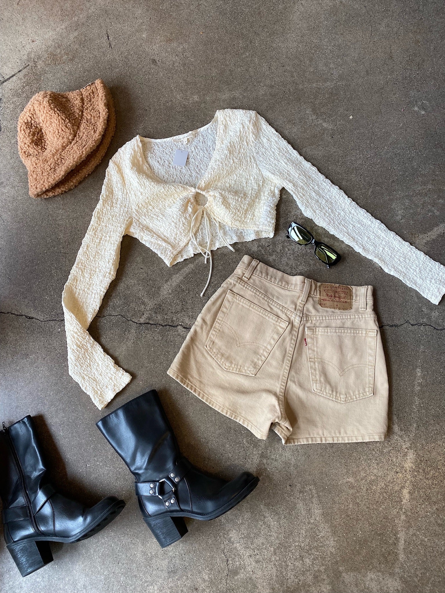 Crinkle long sleeve crop top with satin string tie front detail in fresh beige. A modern neutral statement top with a crinkle texture twist!