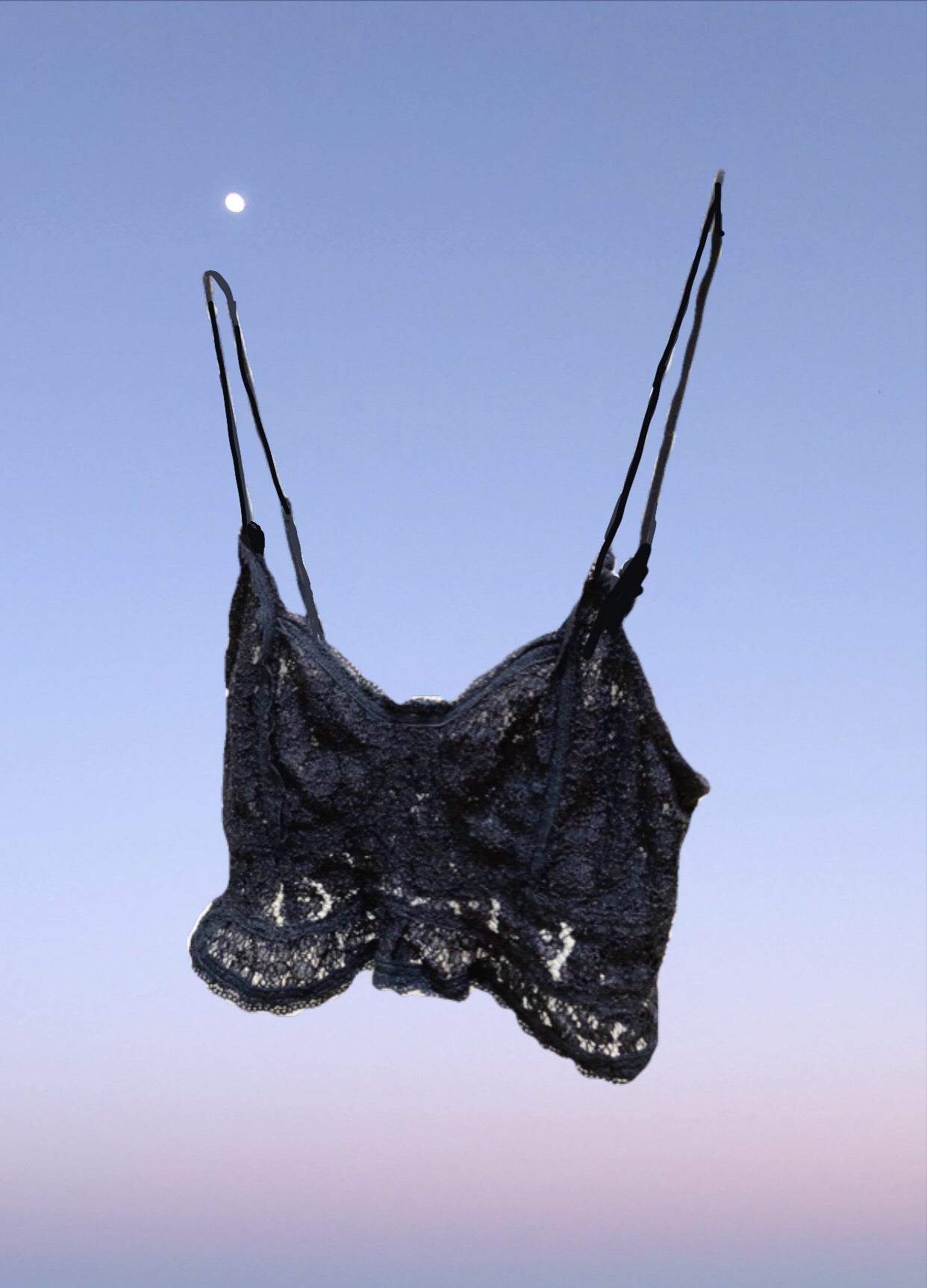 Spaghetti strap lace crop top with waved ruffle bottom.