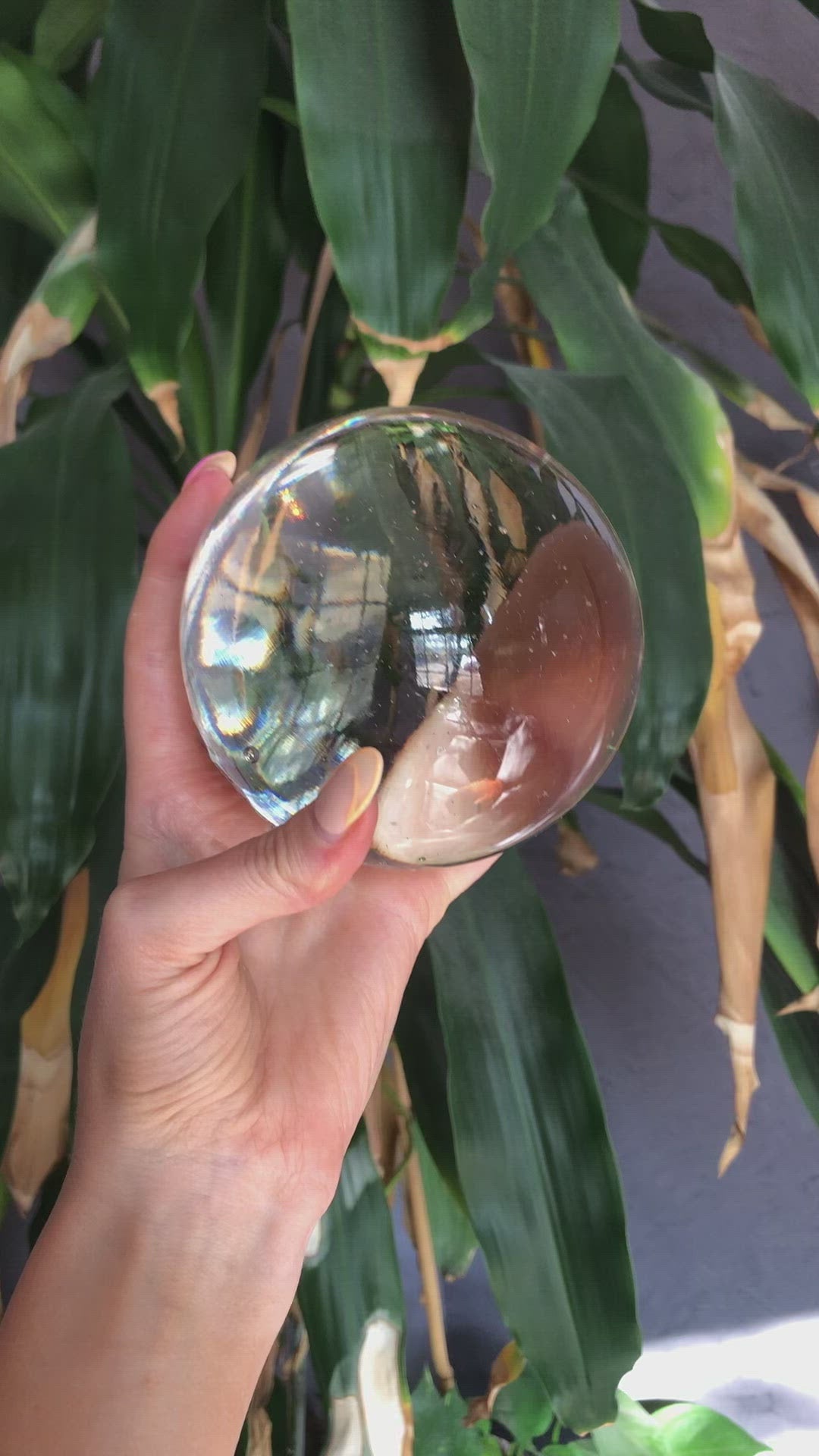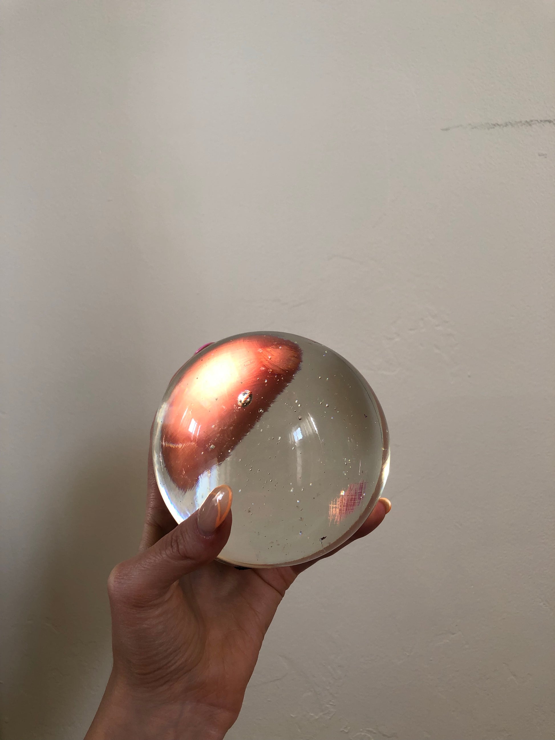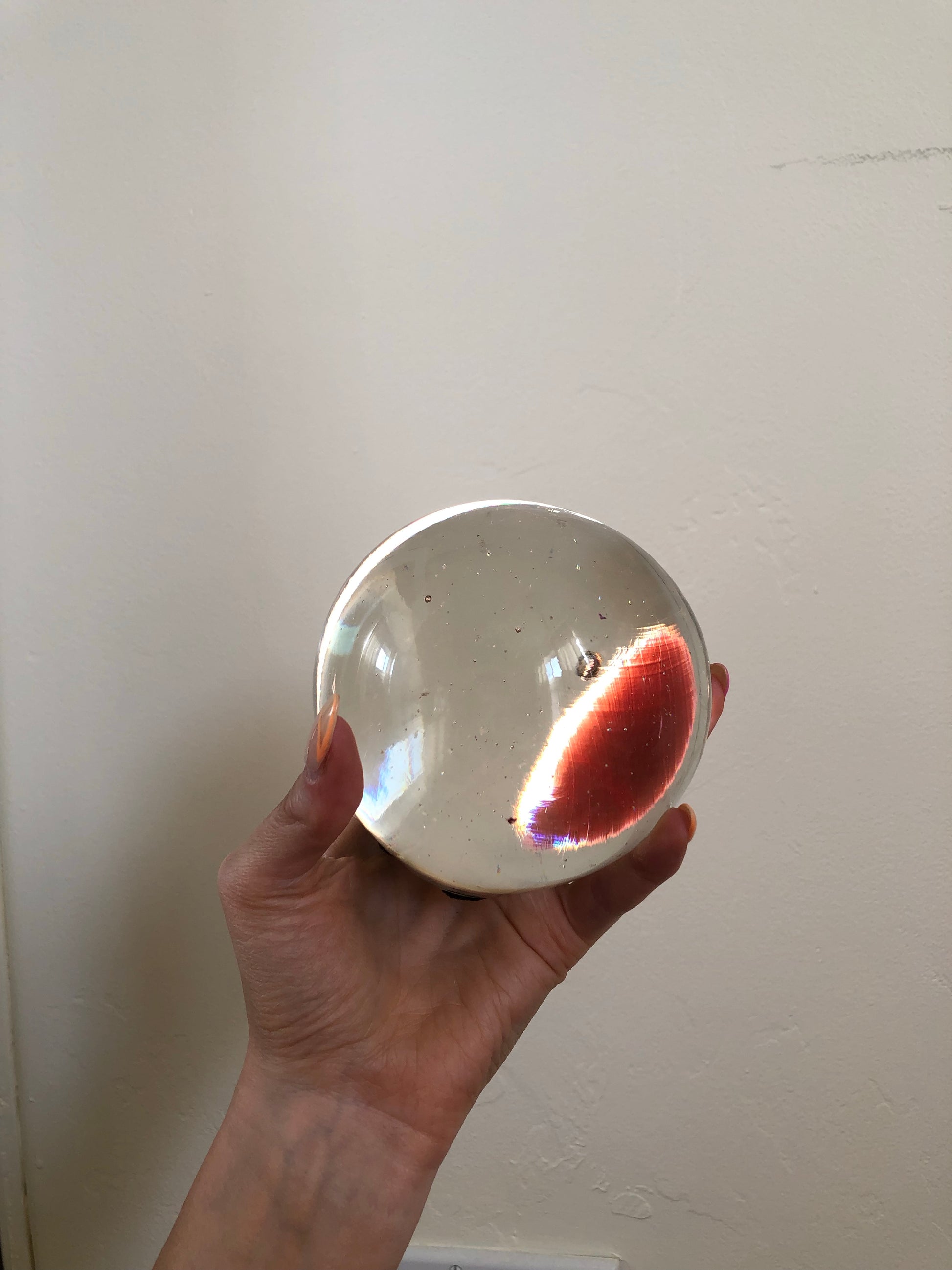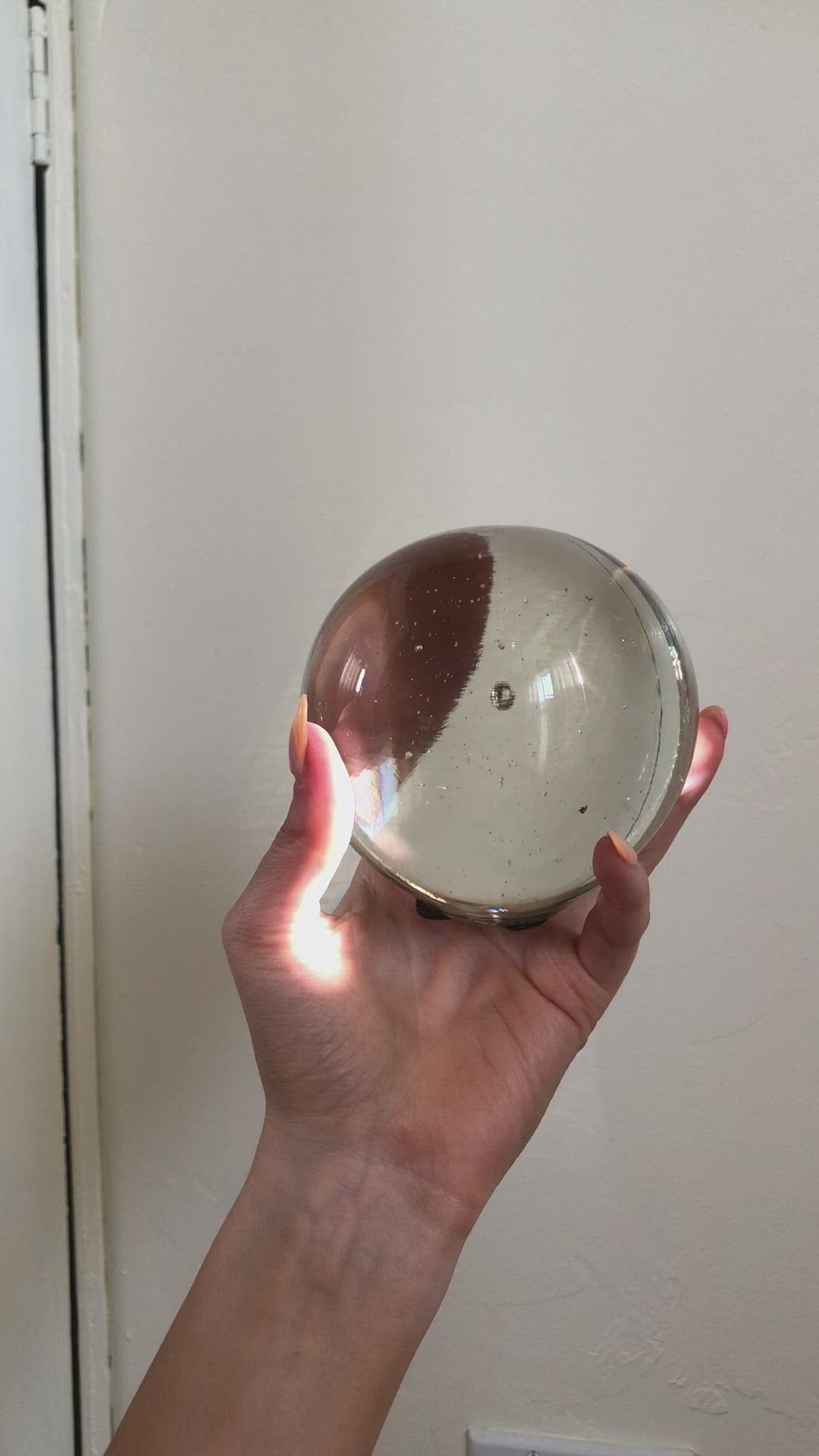 Amazing glass crystal ball with tapered bottom that stands on its own! Bring out your mystical side and conquer your demons :) This ball has some air bubbles within it and is missing one of the felt pieces on the bottom (see video).ย