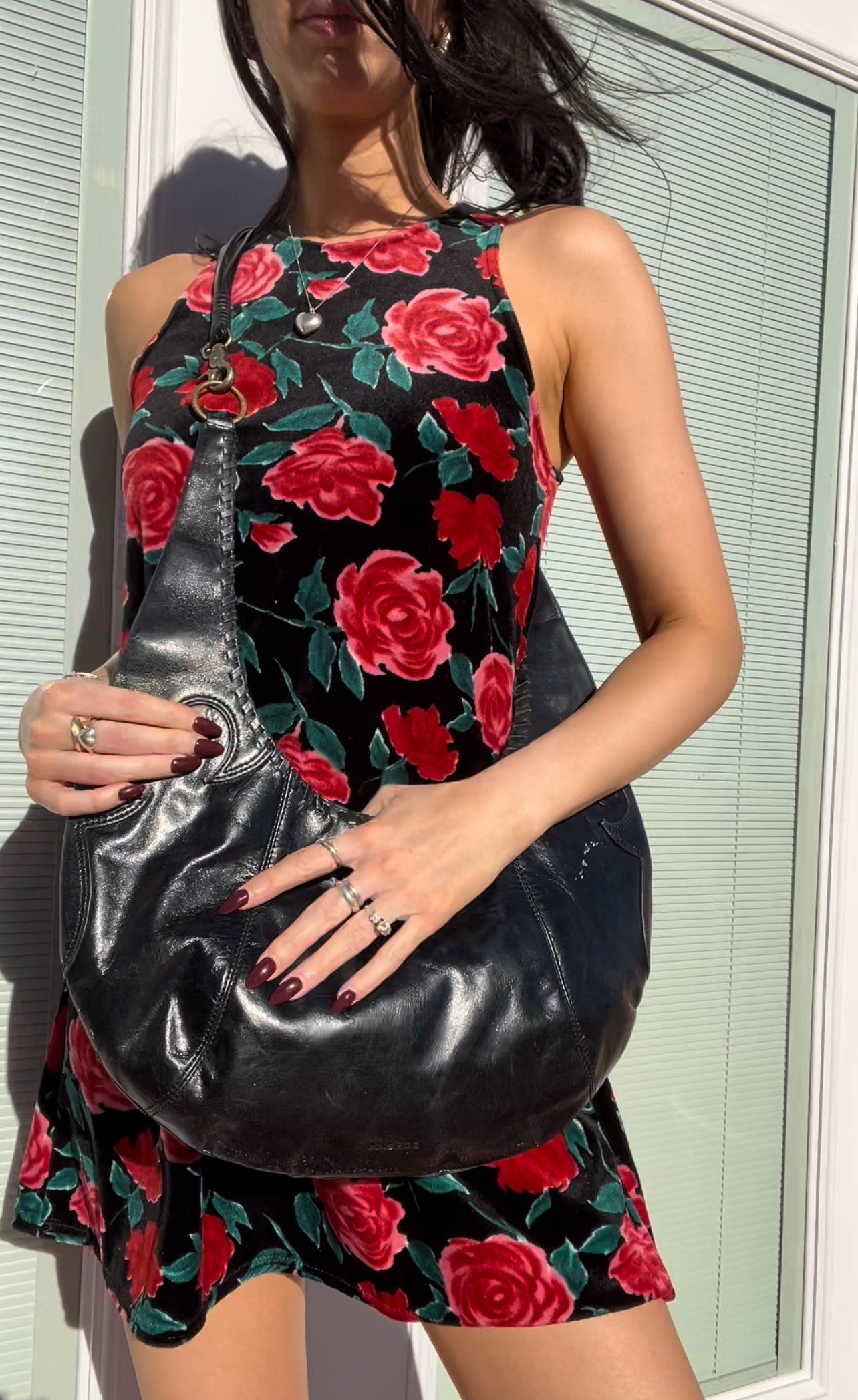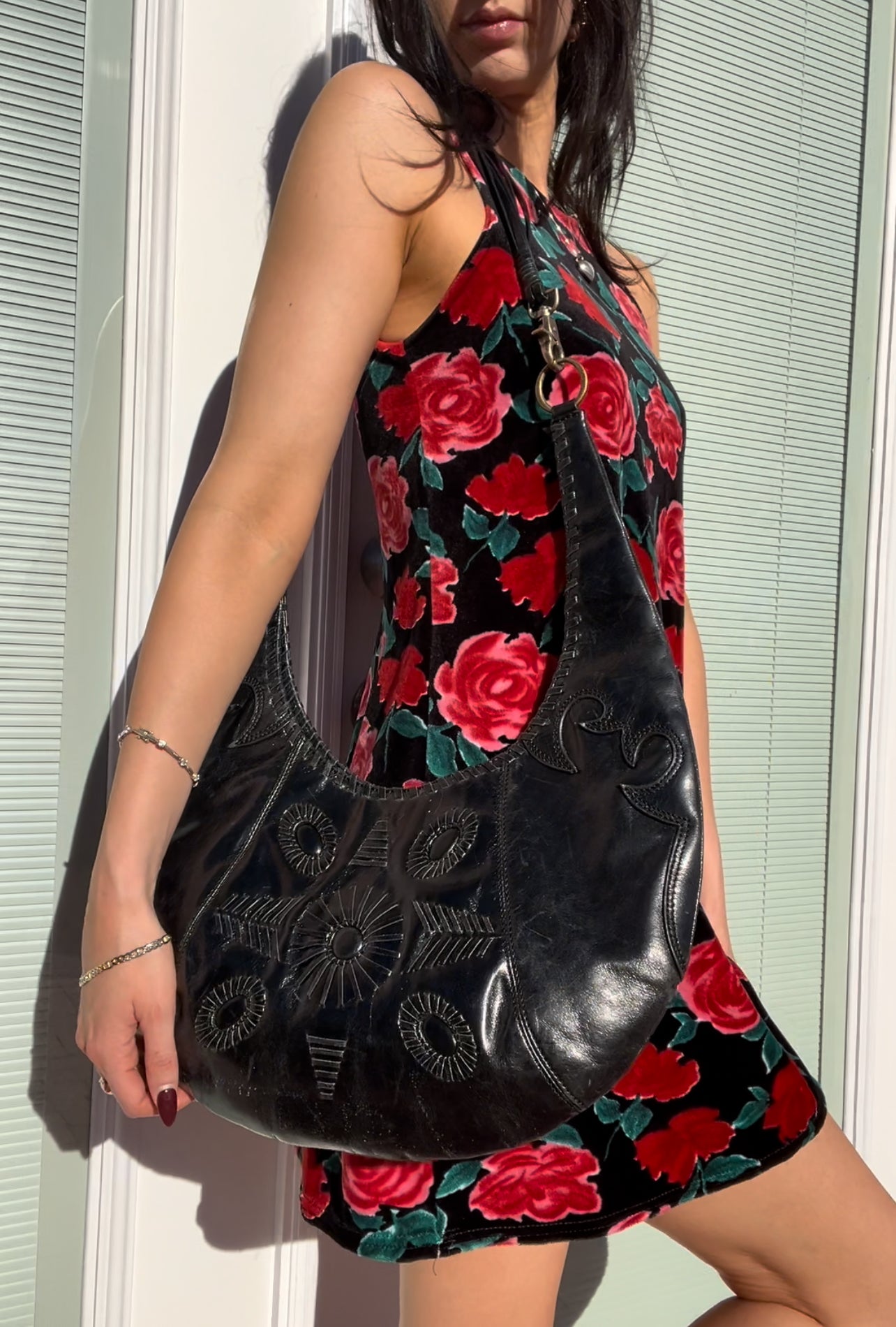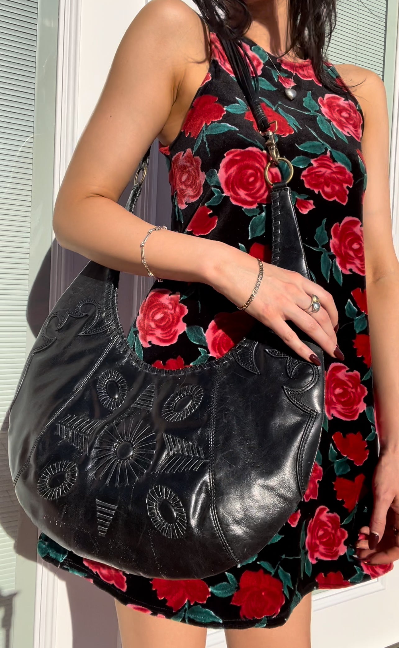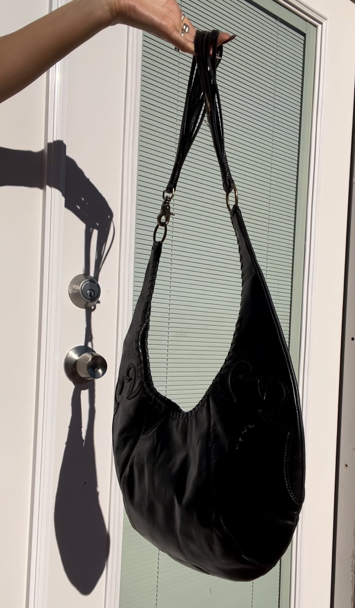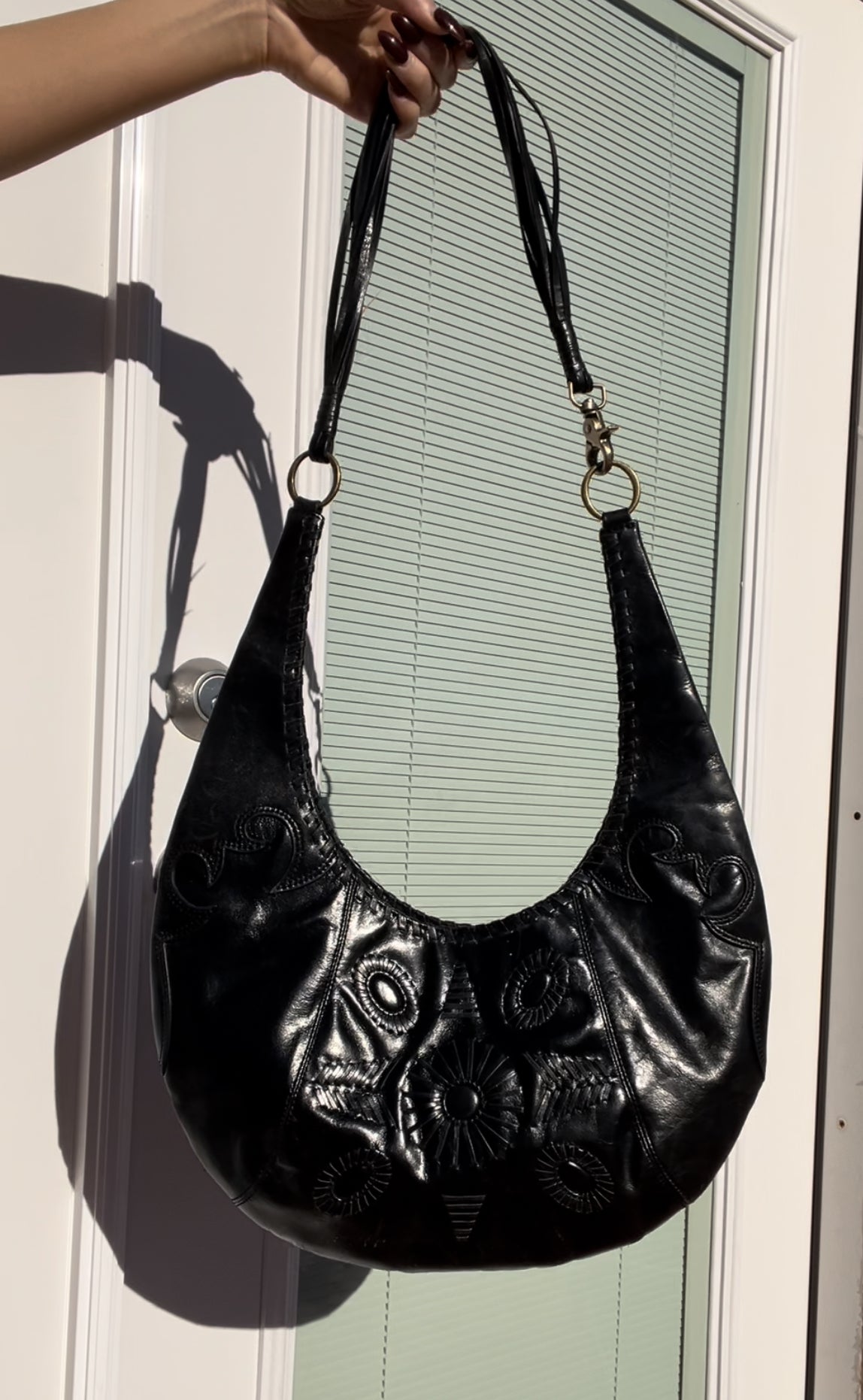 Western style vintage BCBG black leather crescent shoulder bag with embroidering and multi string strap detail.