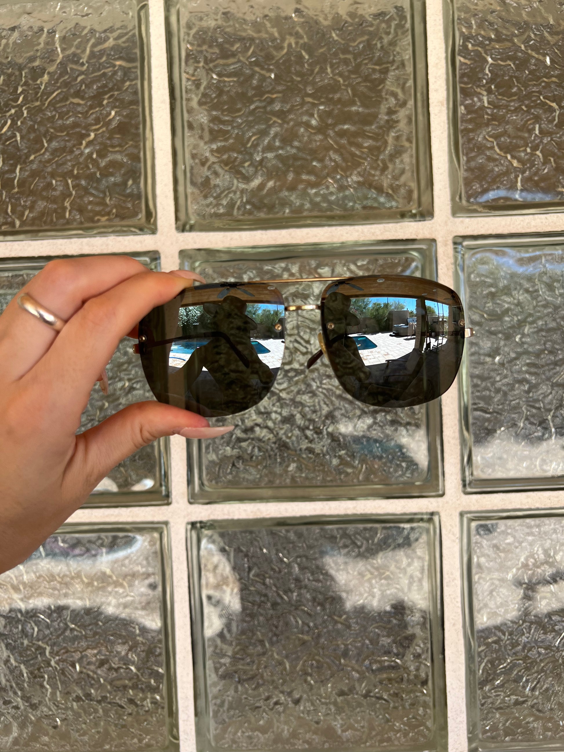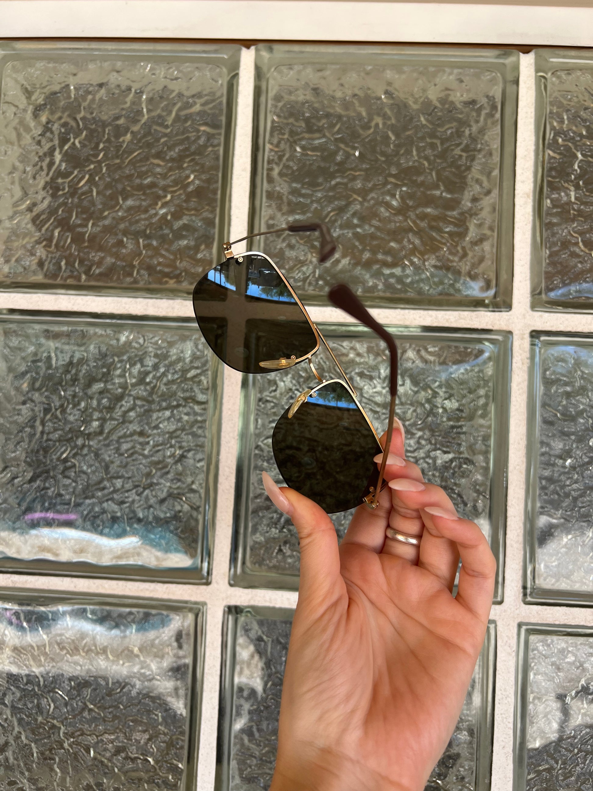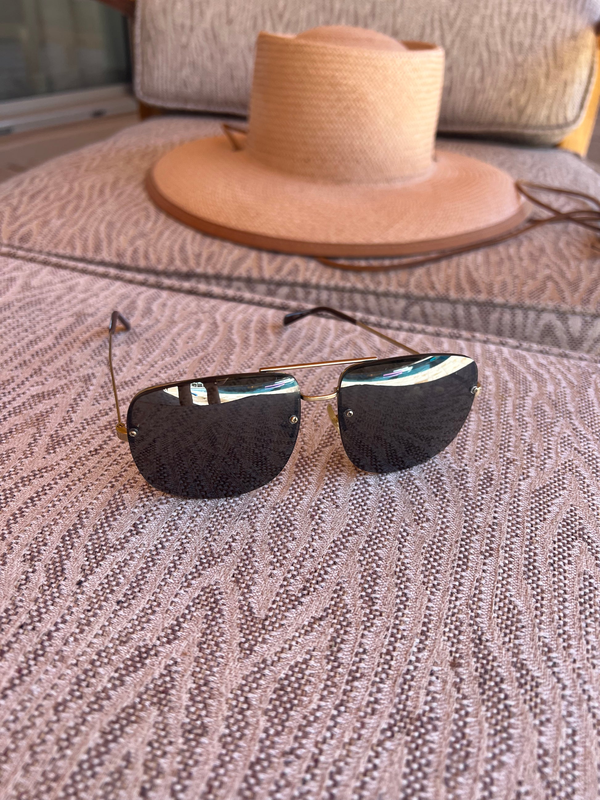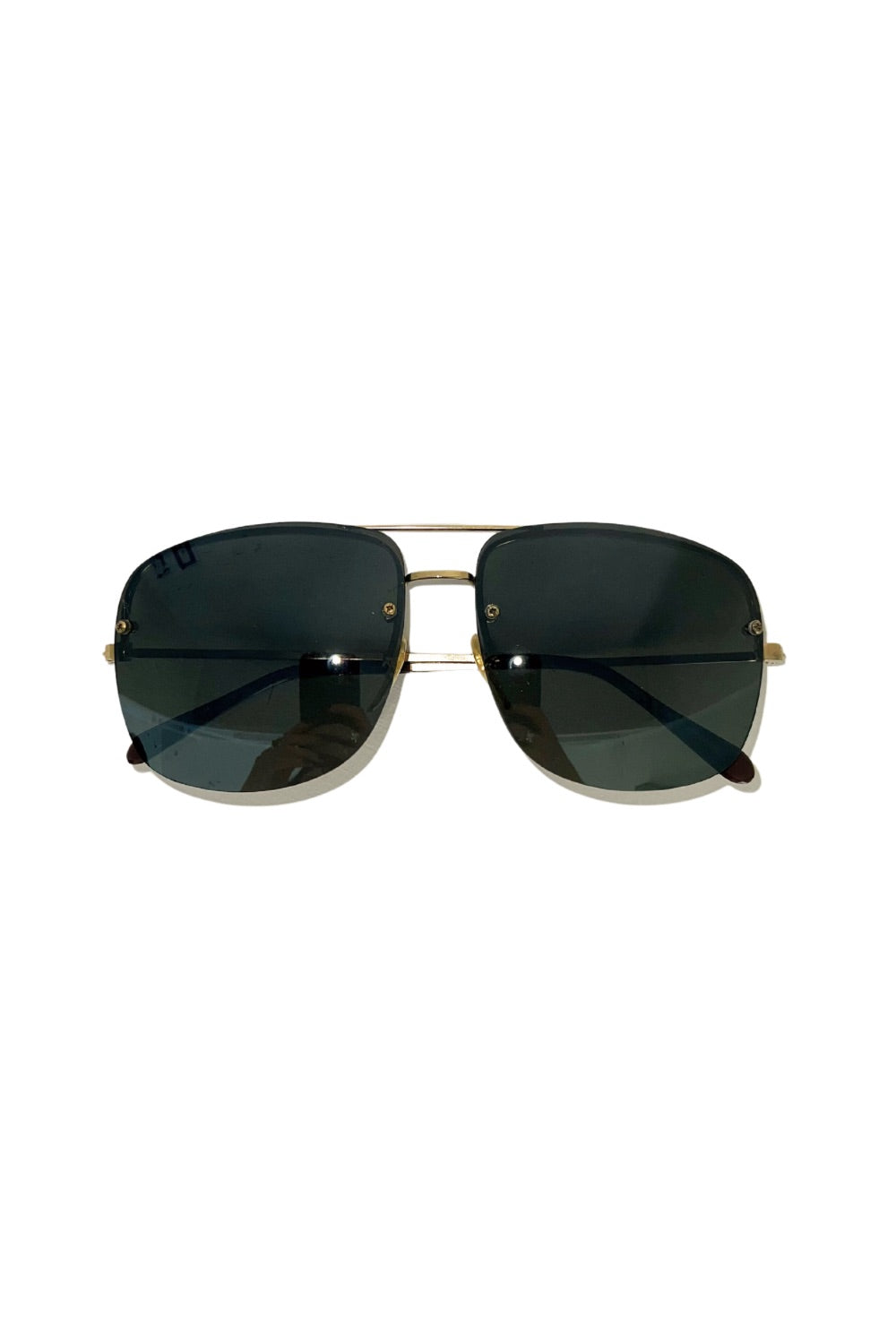 Smoke tinted frameless lenses with light gold metal arms. Oversized aviator style.