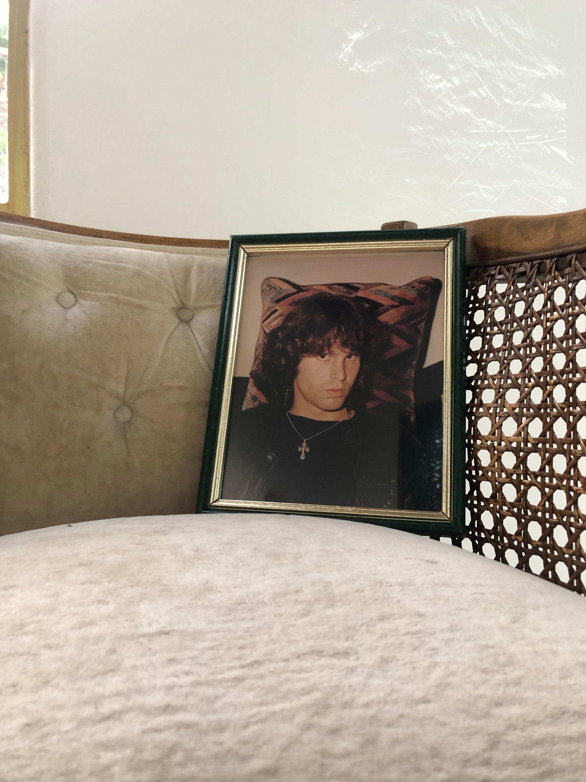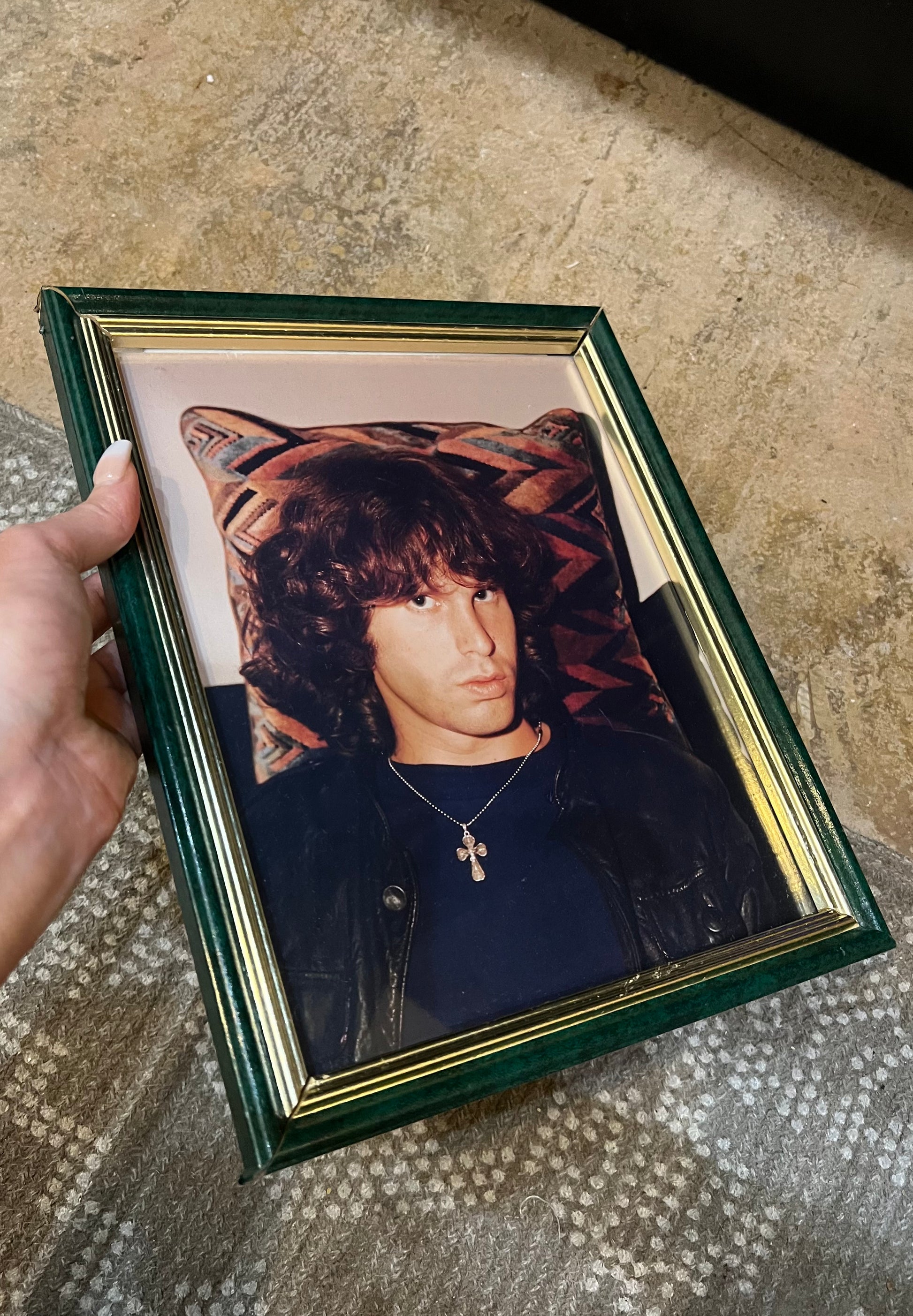 Come on baby light my fire… amazing vintage Jim Morrison (The Doors) print encased beneath glass in a green and gold frame.