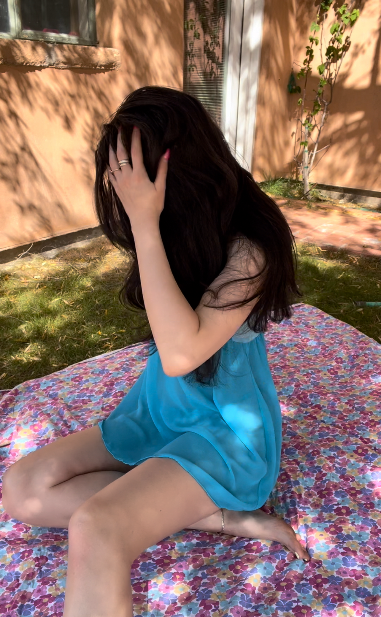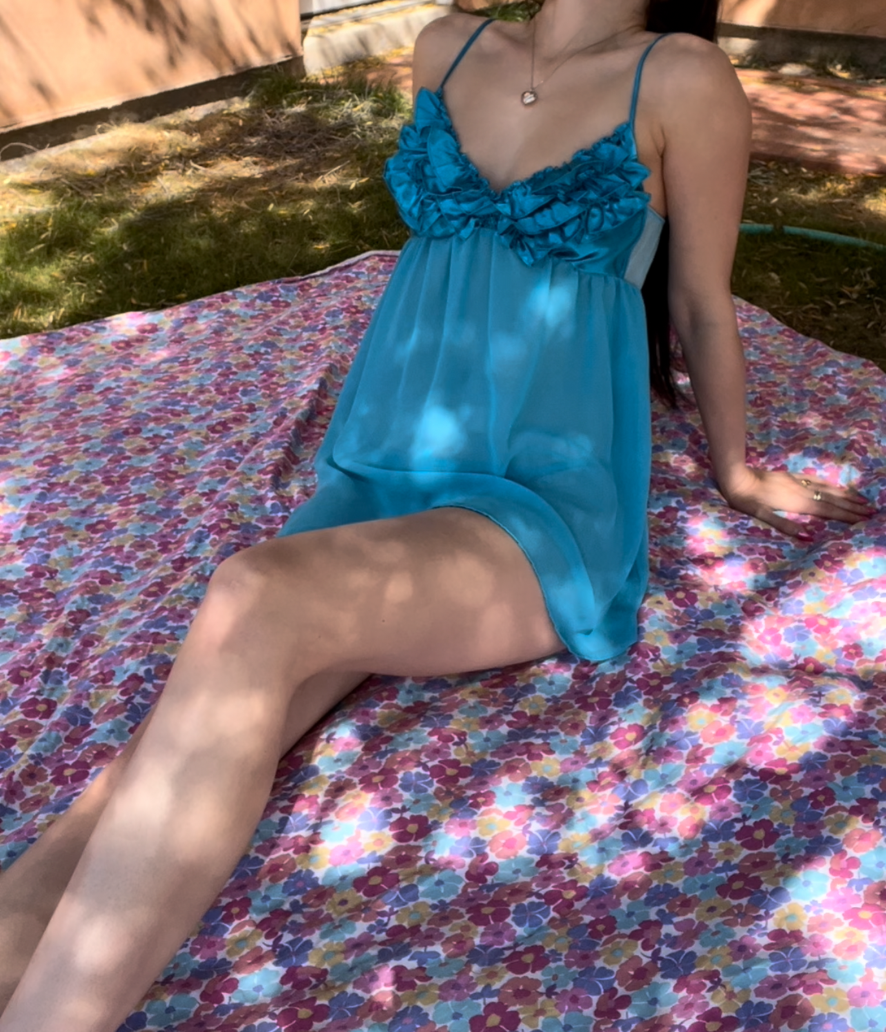 Electric blue ruffle sheer bra top with matching bikini-style sheer underwear.