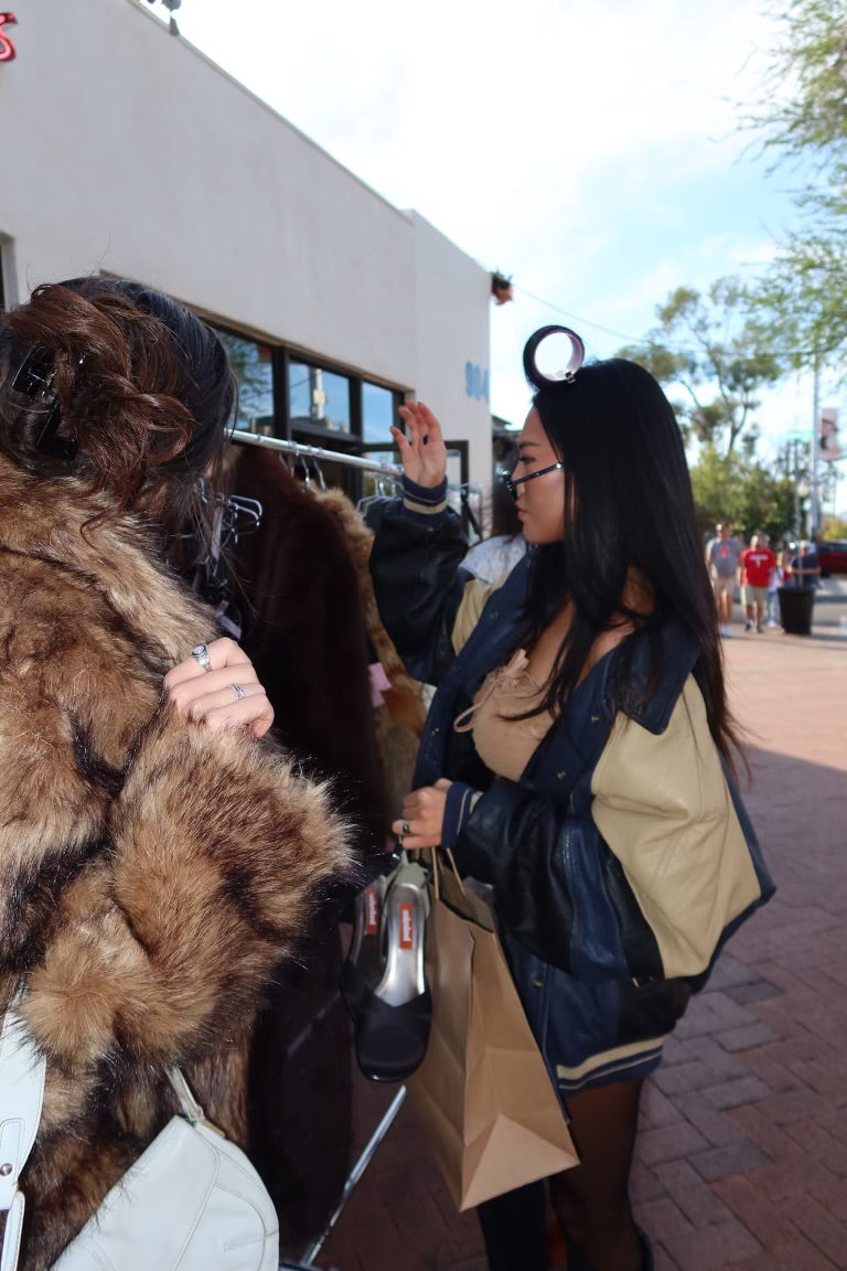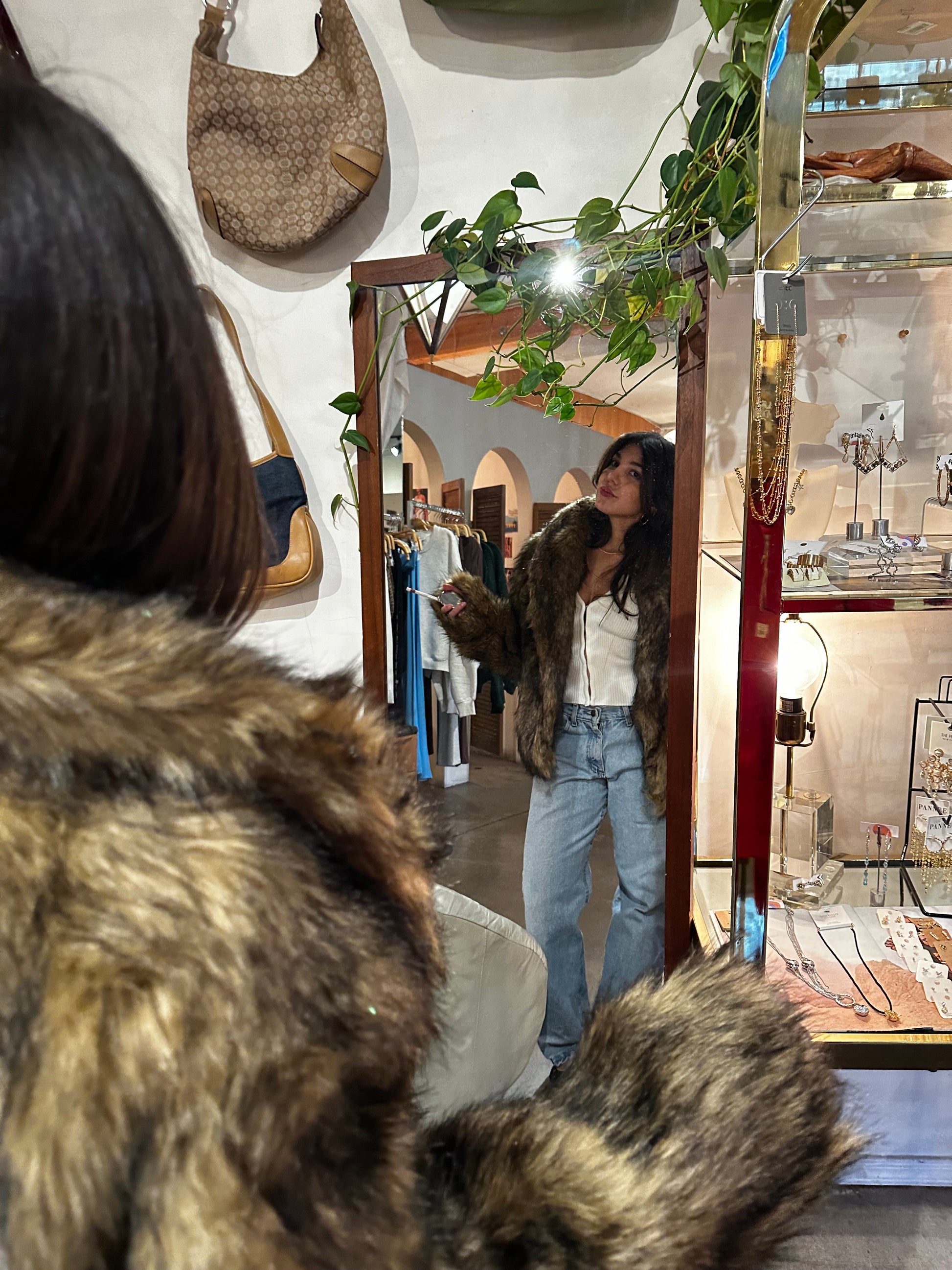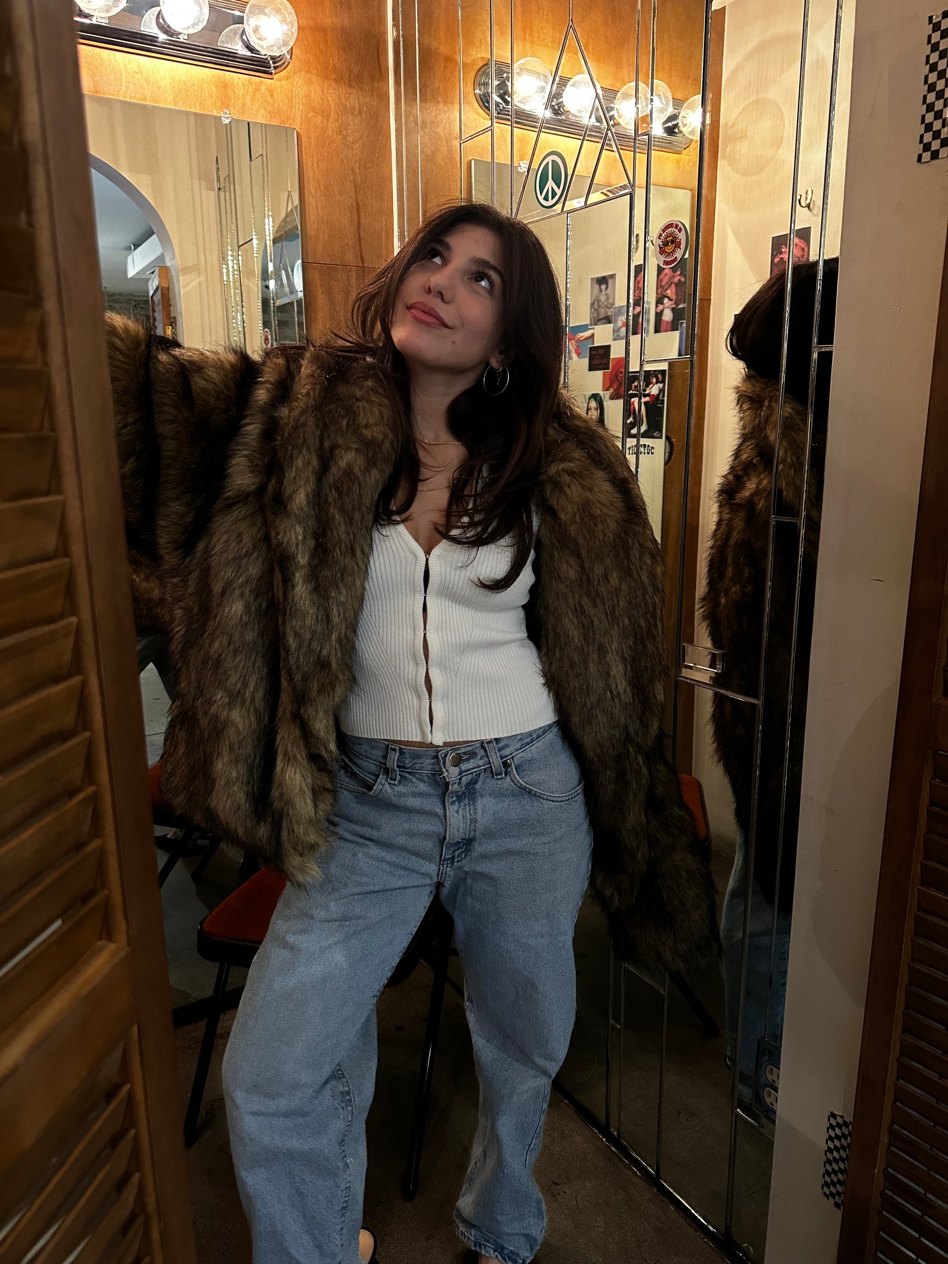 This faux fur coat is giving vintage from your Grandma’s closet in the best way. A warm chestnut brown mix and the perfect length for dress & boot season.