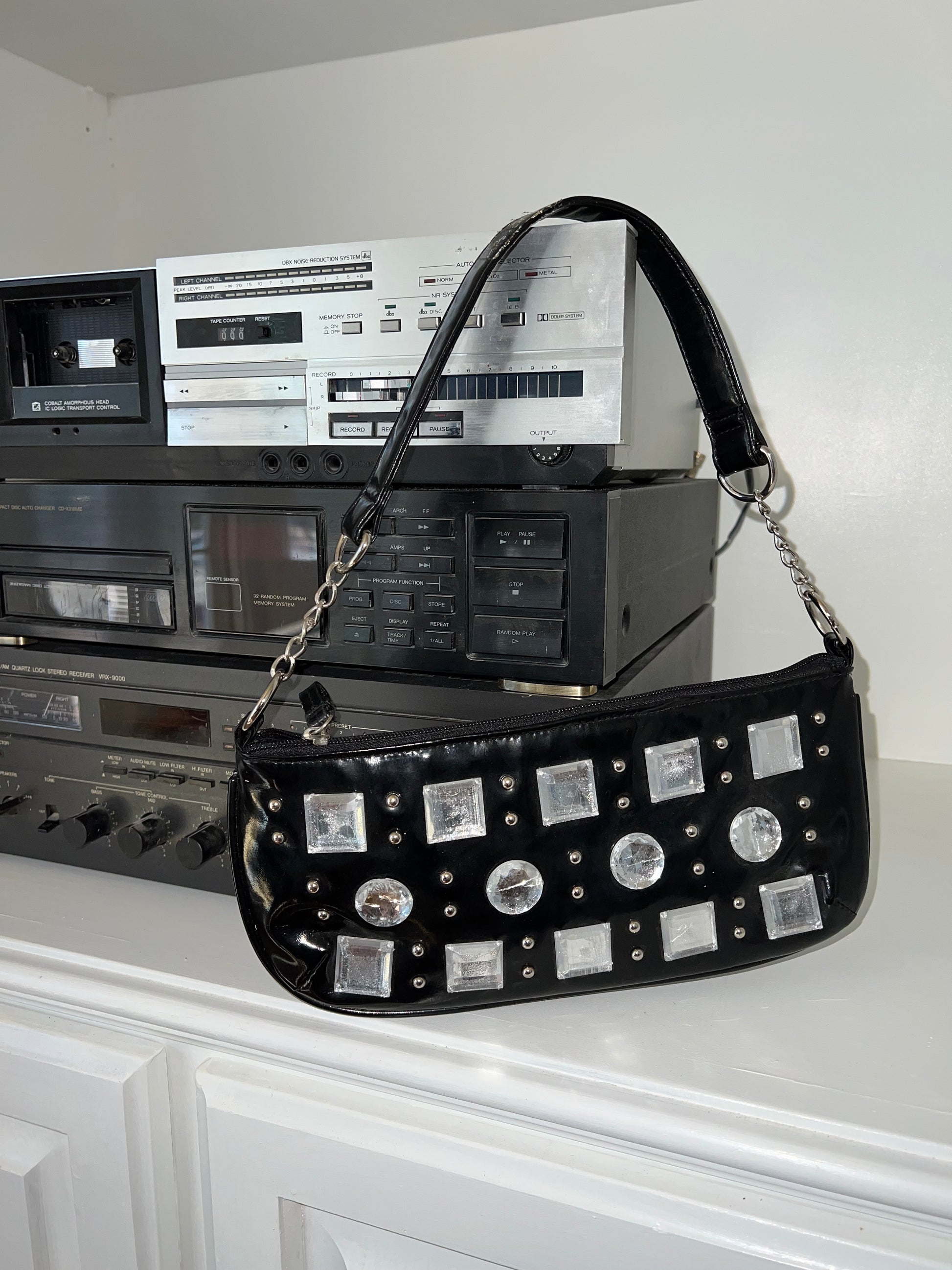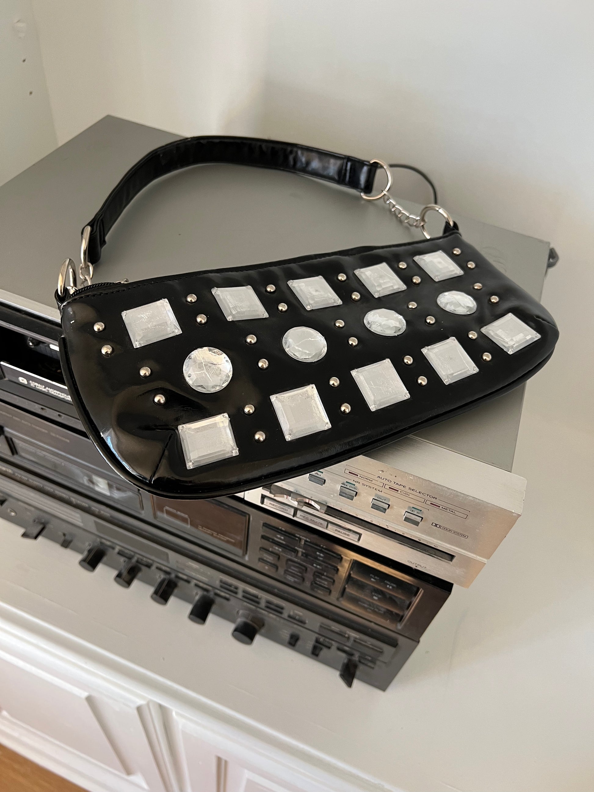 Vintage black faux patent leather shoulder purse with silver chain detail on strap and chunky jewel and stud design on the front. The back is plain.