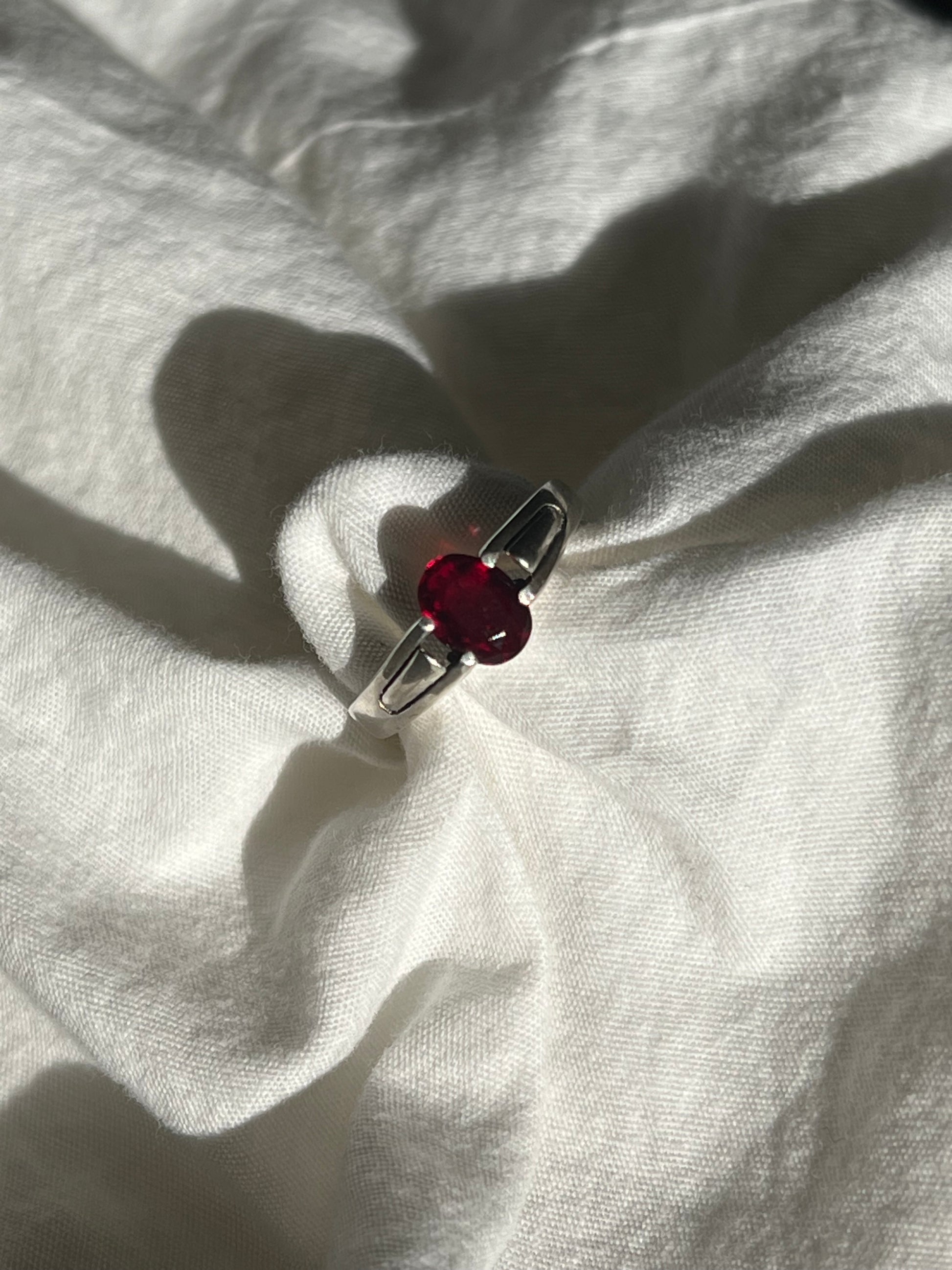 A simple art-deco feeling sterling silver ring with a glimmering blood red stone. She’s classic and edgy all in one.