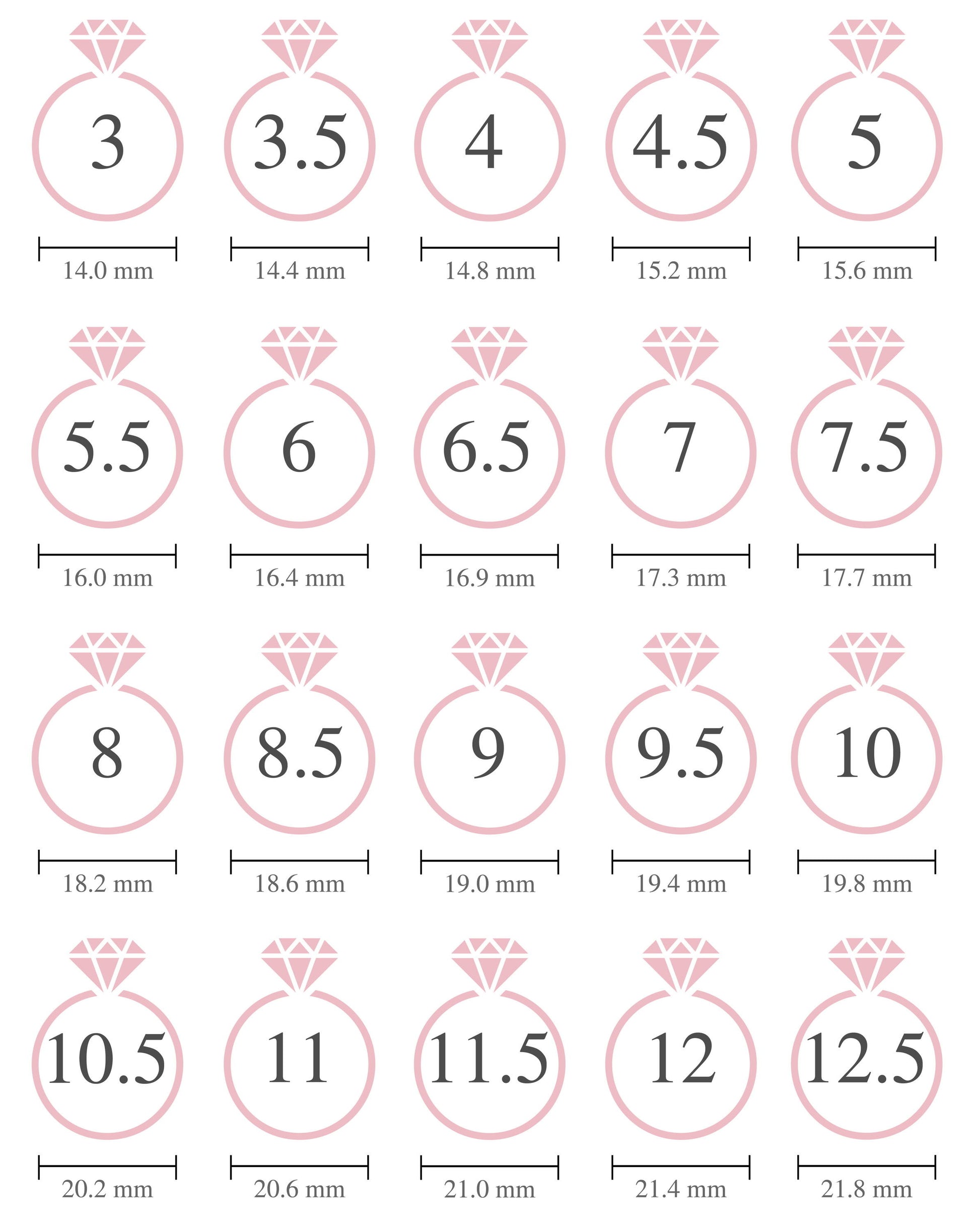 You can measure your ring size using something like a string, floss, or a small strip of paper. Take one of these measurement tools and wrap it around the base of your finger, marking where the string or floss first overlaps, with a pen. Then, line that up with a ruler or measuring tape and take down its length in millimeters. Use the chart above to see which size is right for you.