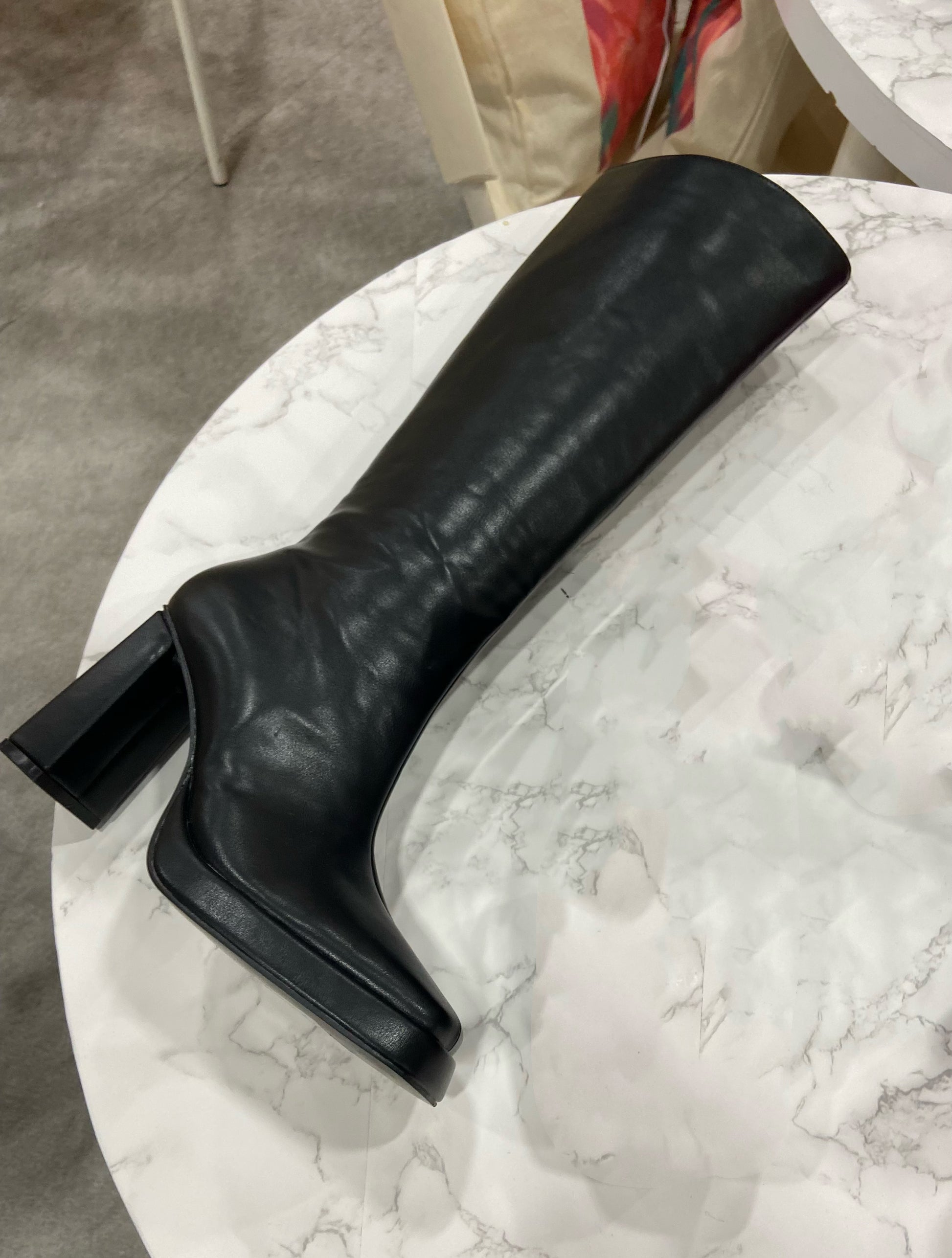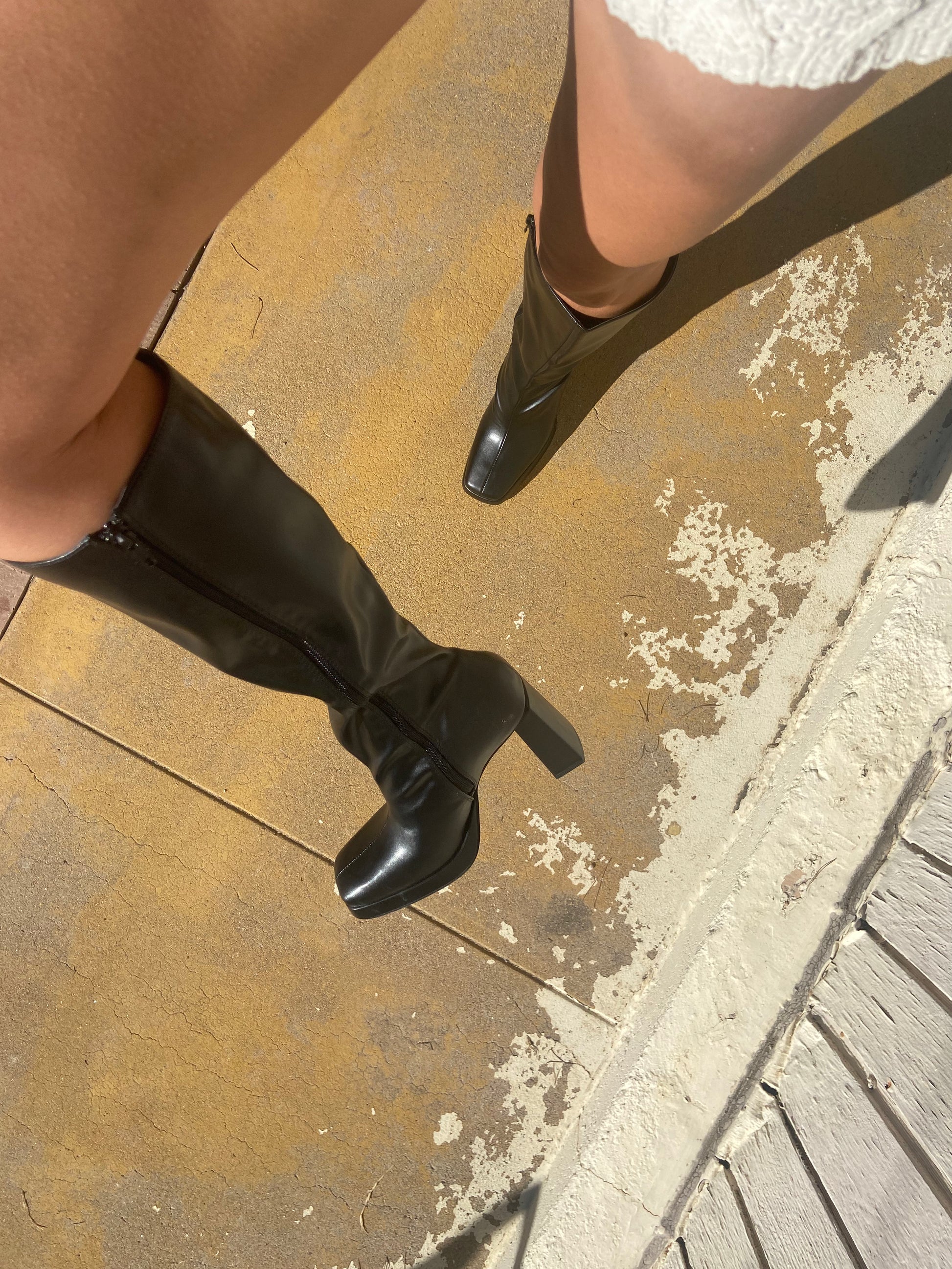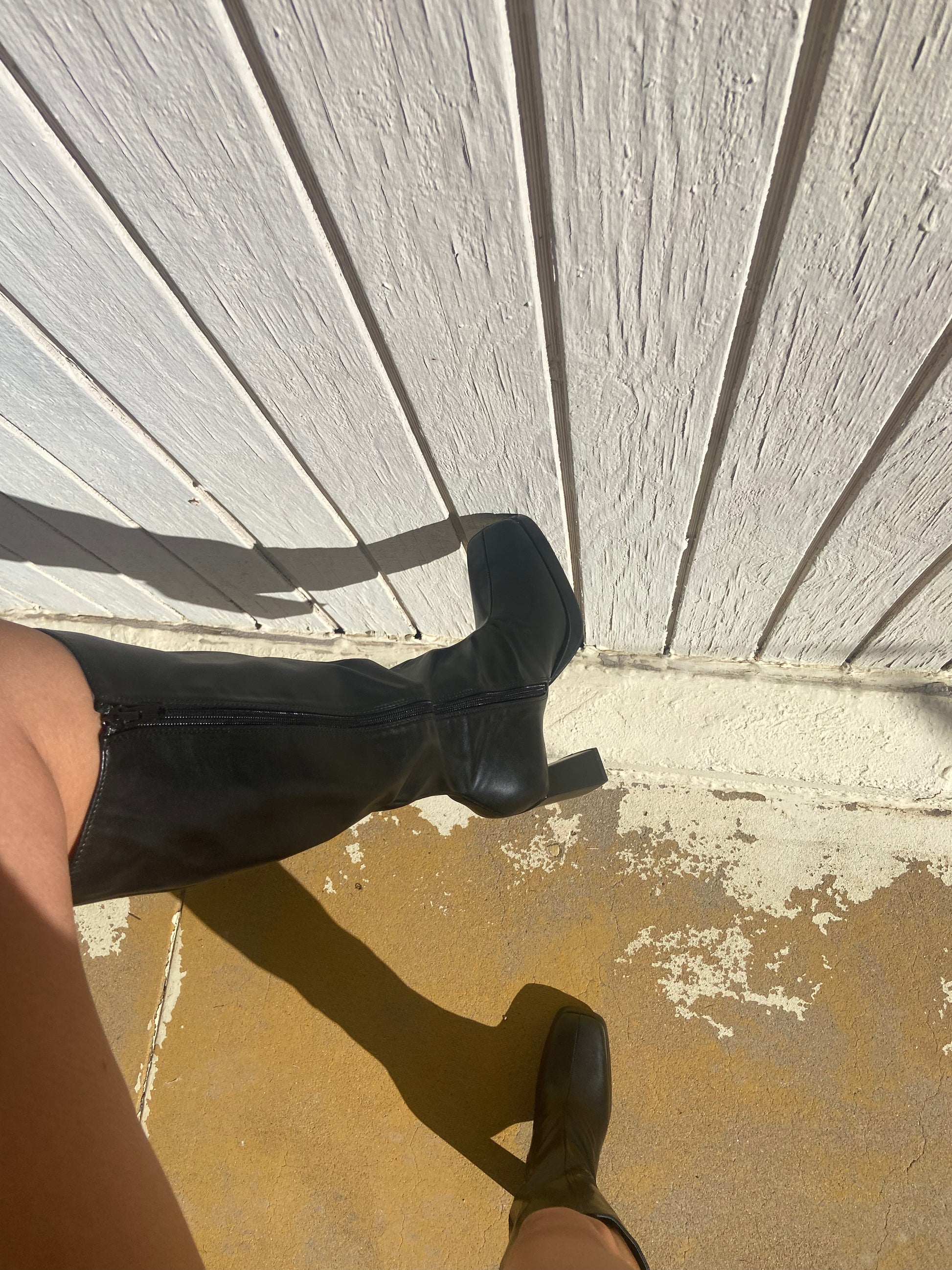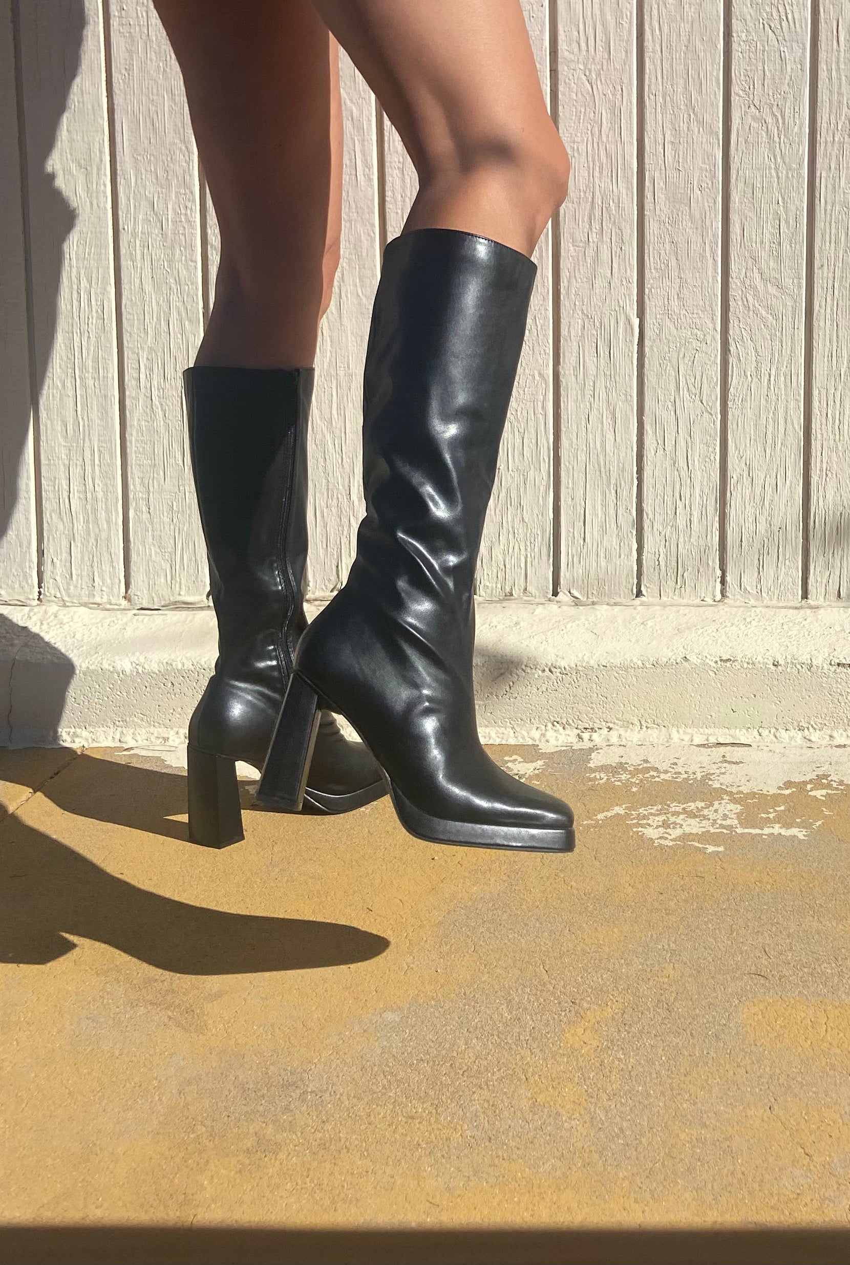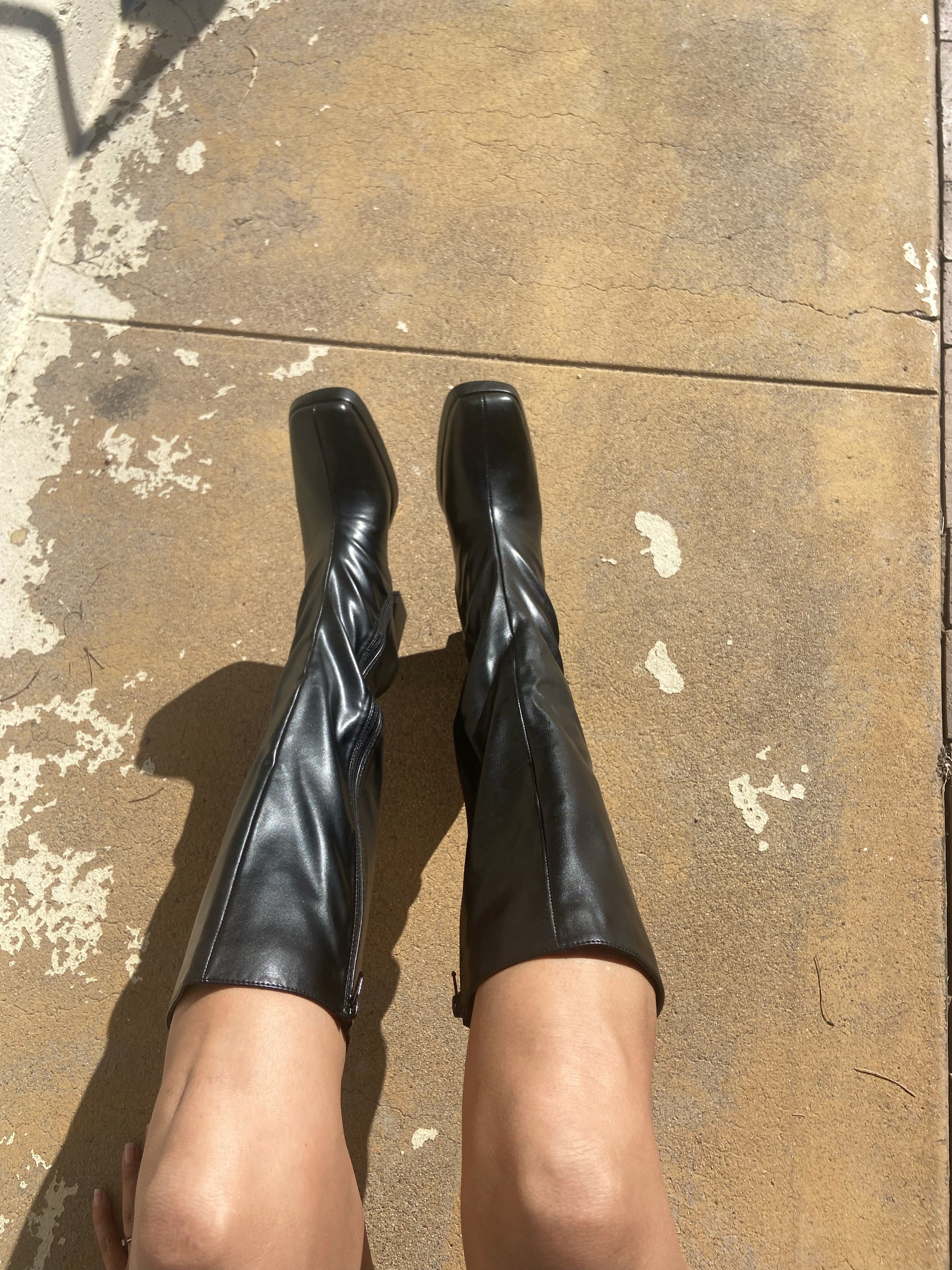 These knee-high faux leather sleek heeled black boots are 100% necessary. With a sleek squared toe and classic cut, these boots will take any outfit to the next level.