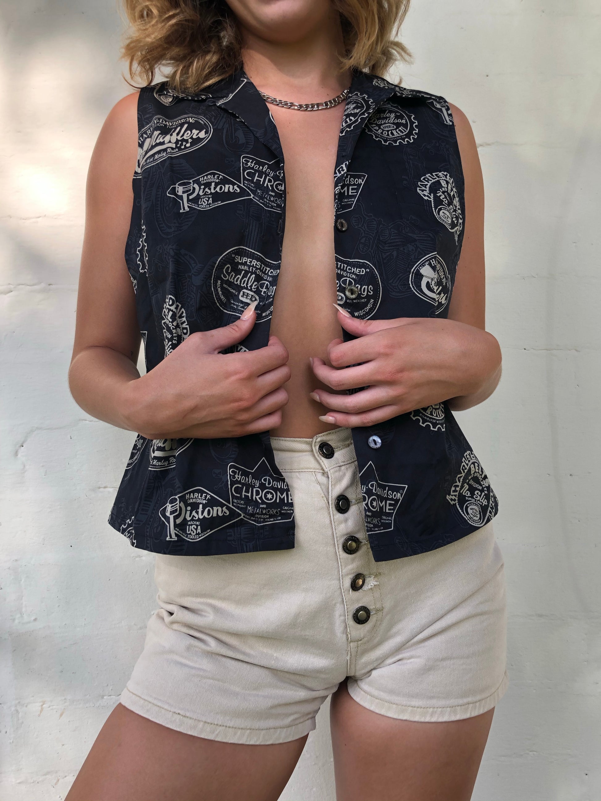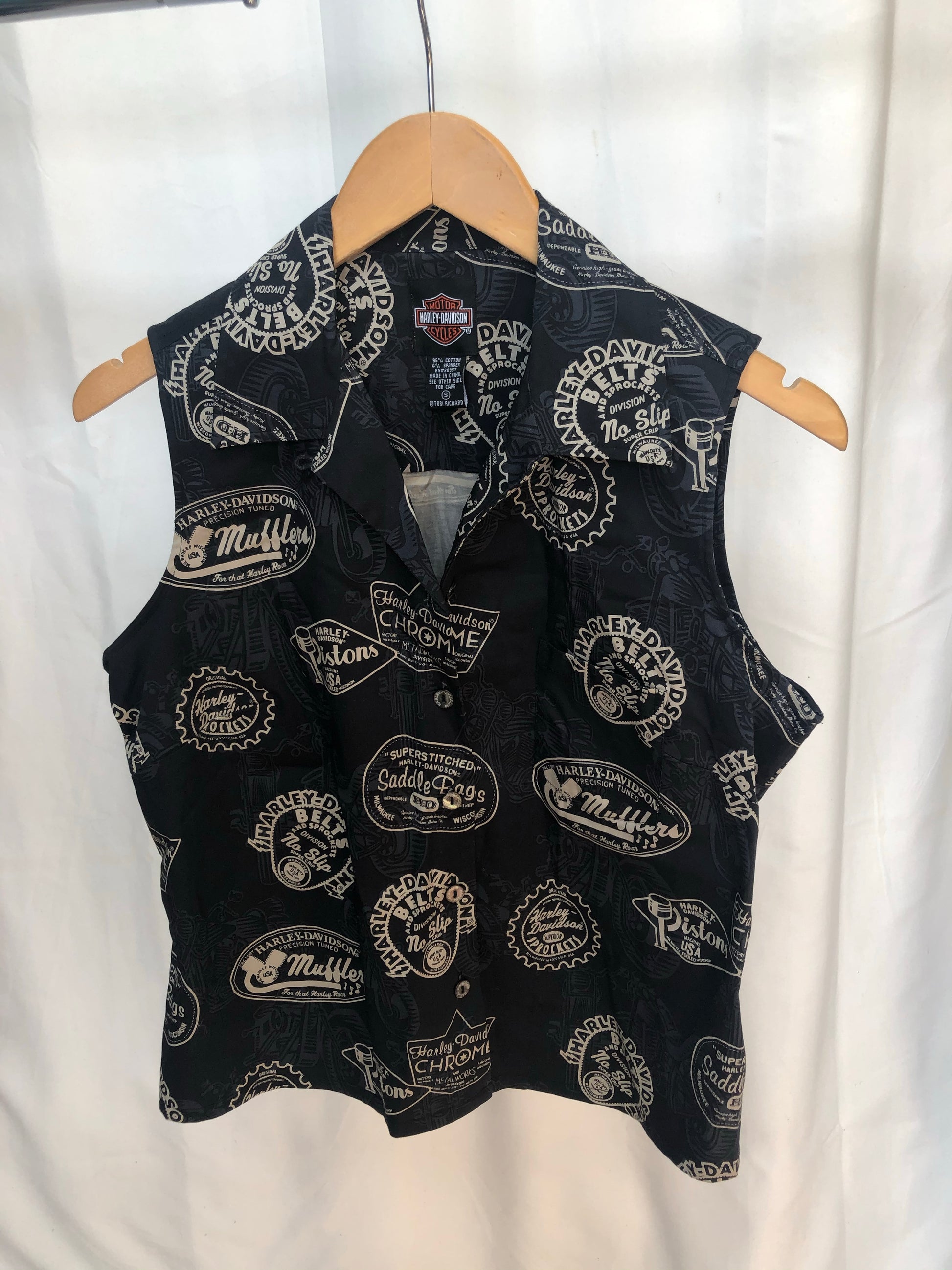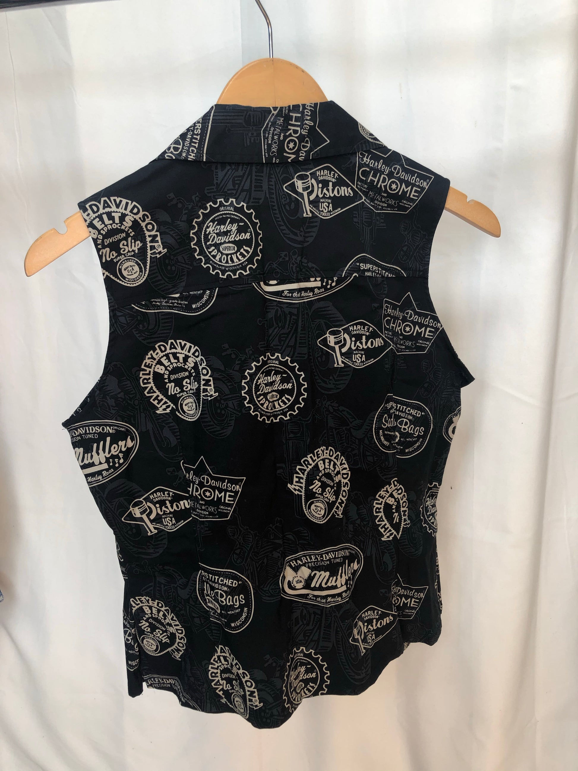 Black button down Harley Davidson sleeveless shirt with front pocket and Harley Davidson logo pattern.
