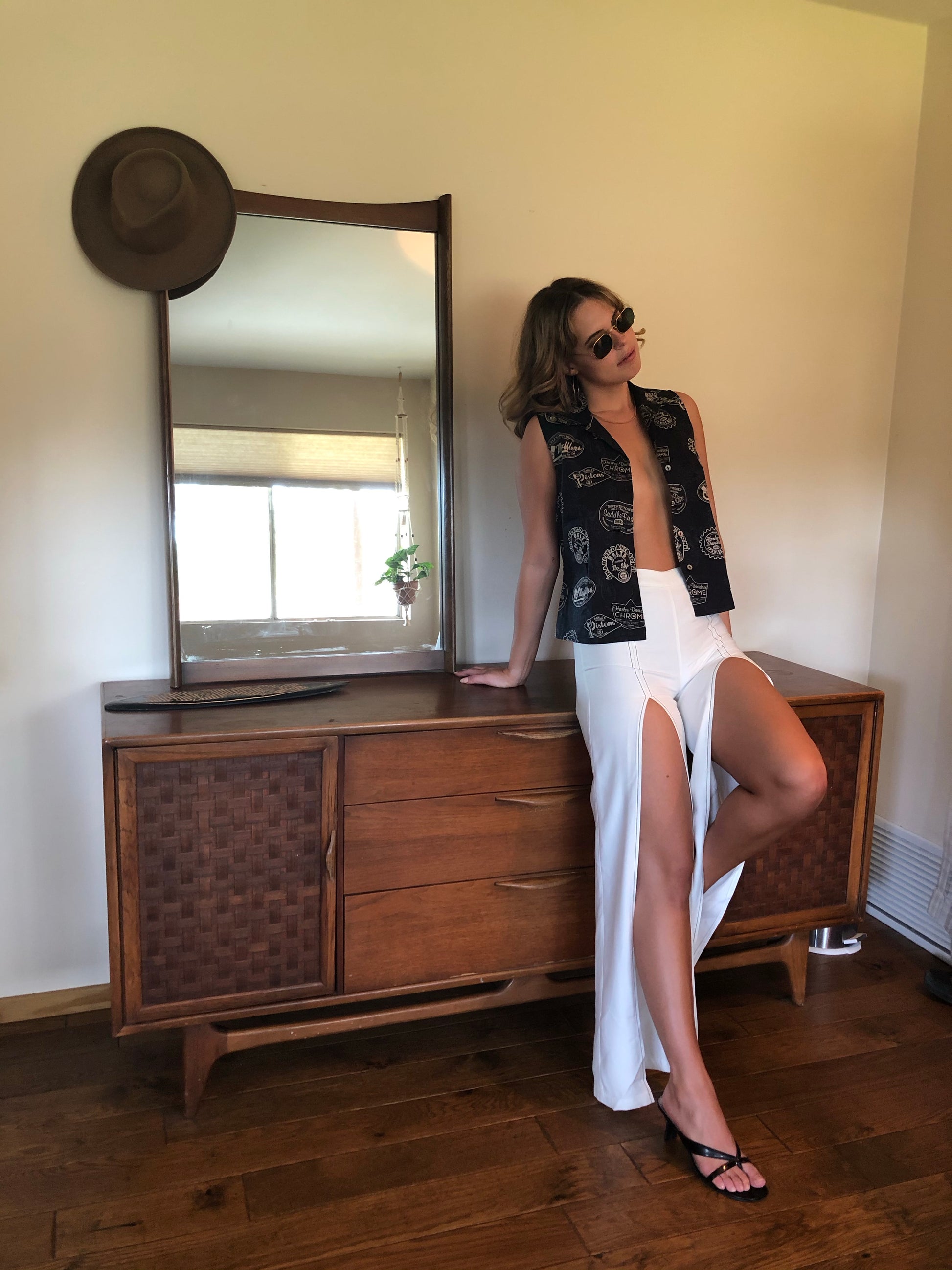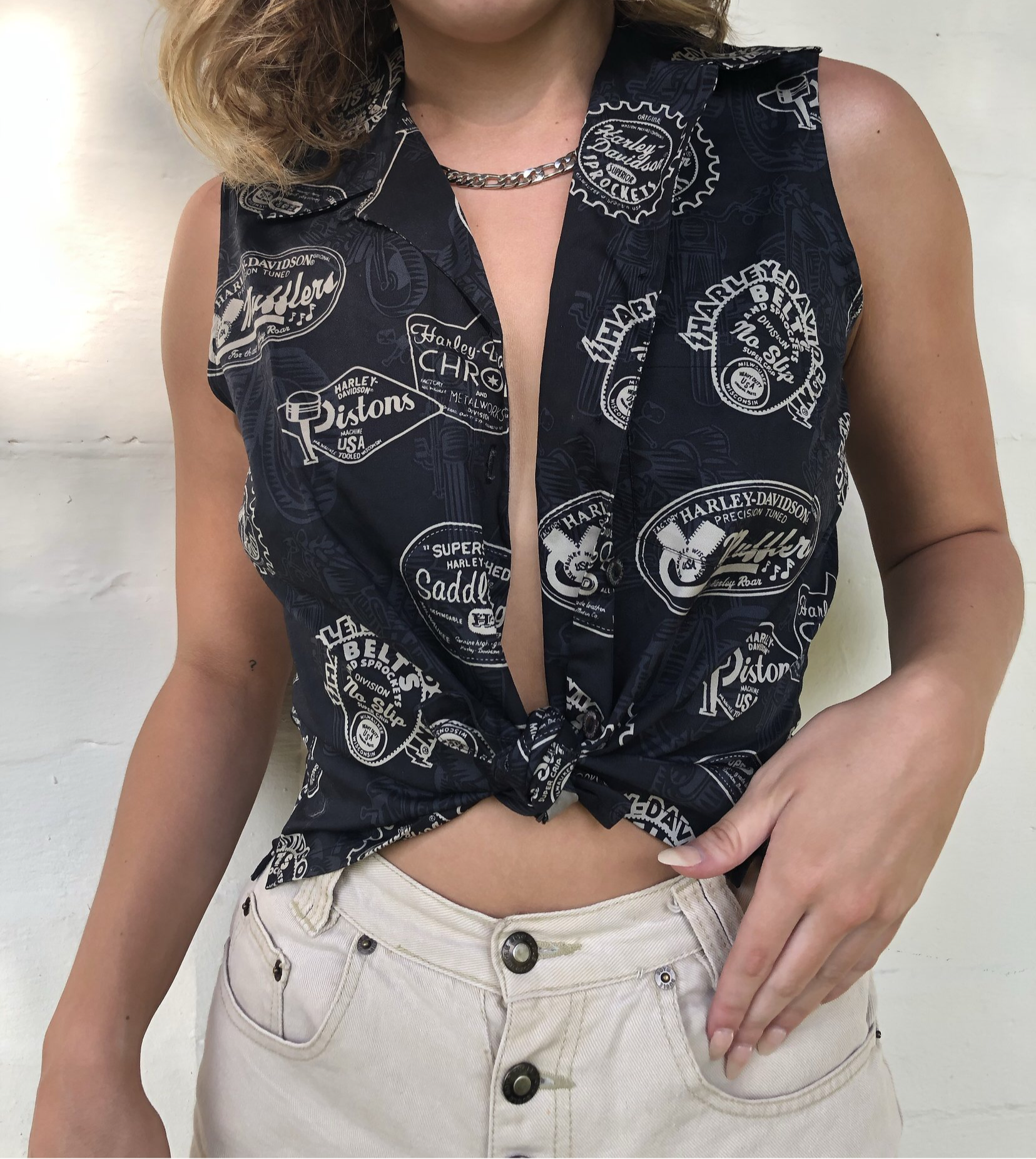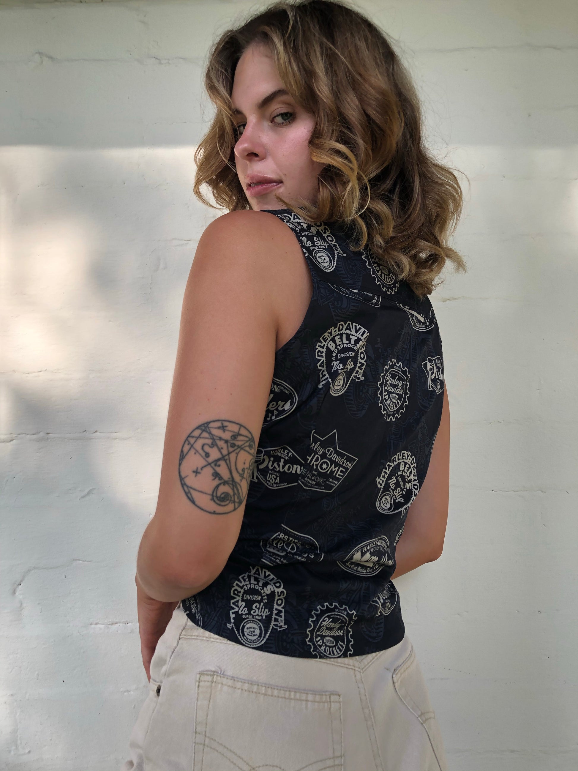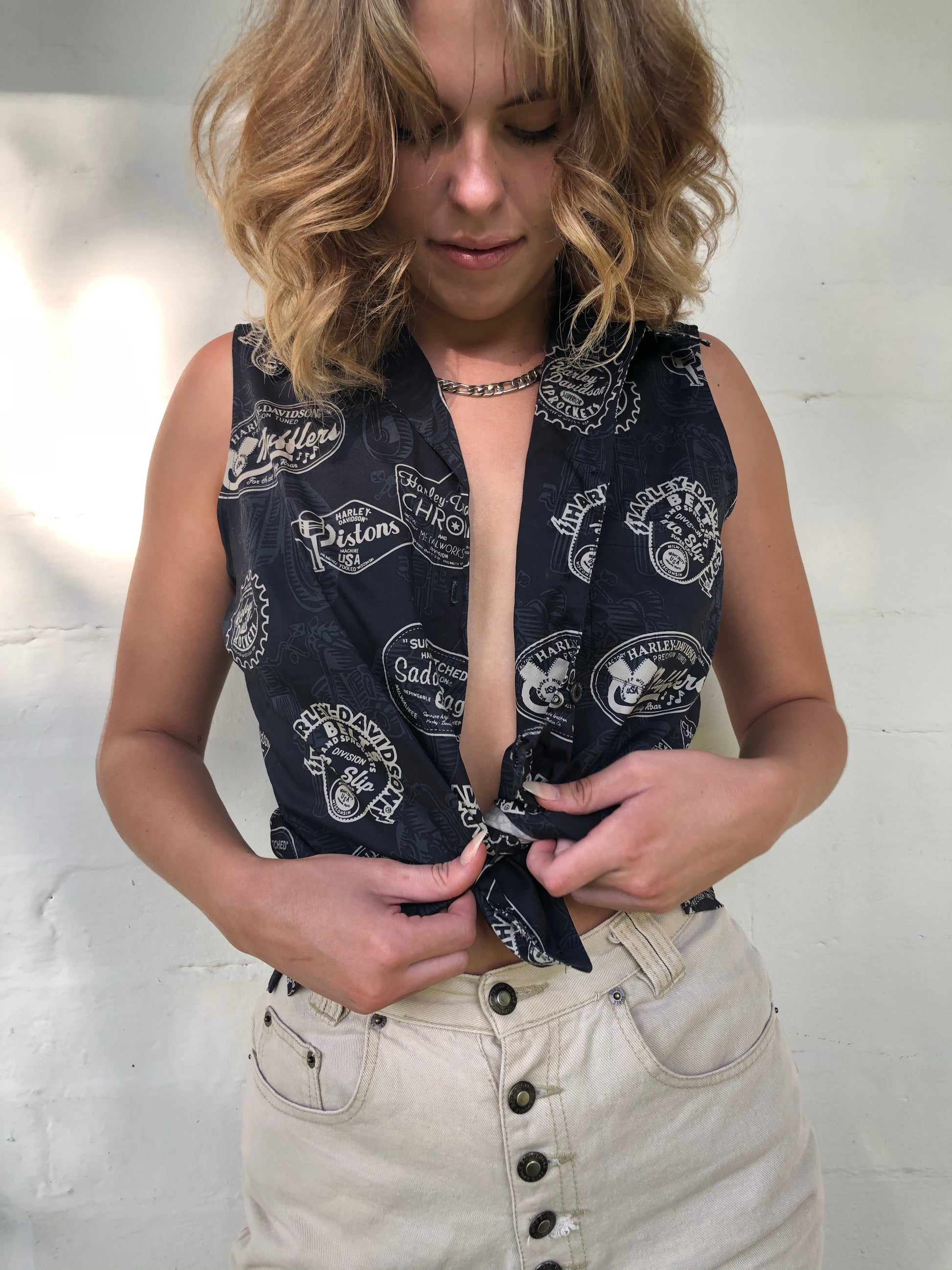 Black button down Harley Davidson sleeveless shirt with front pocket and Harley Davidson logo pattern.