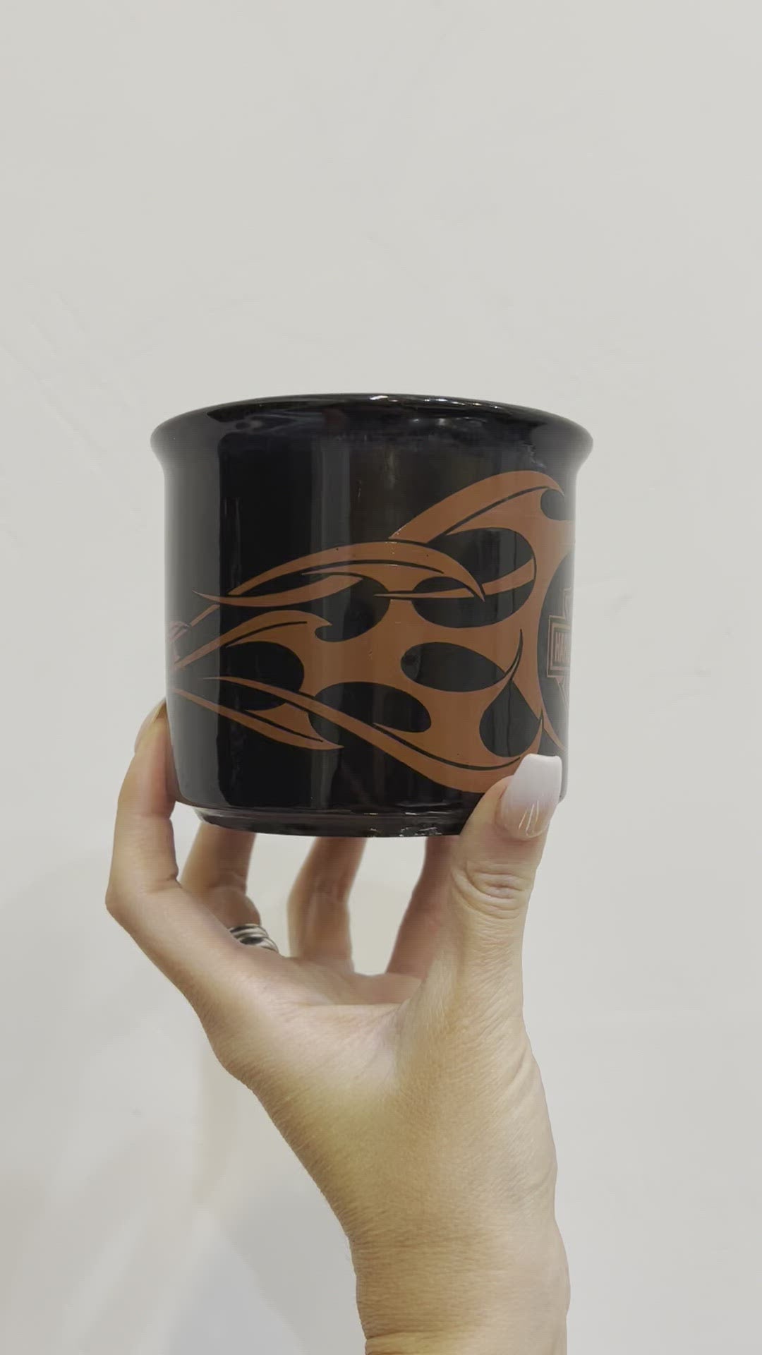 For when you take your coffee with a side of biker chick. Chunky rare black ceramic glass mug with burnt orange Harley Davidson logo