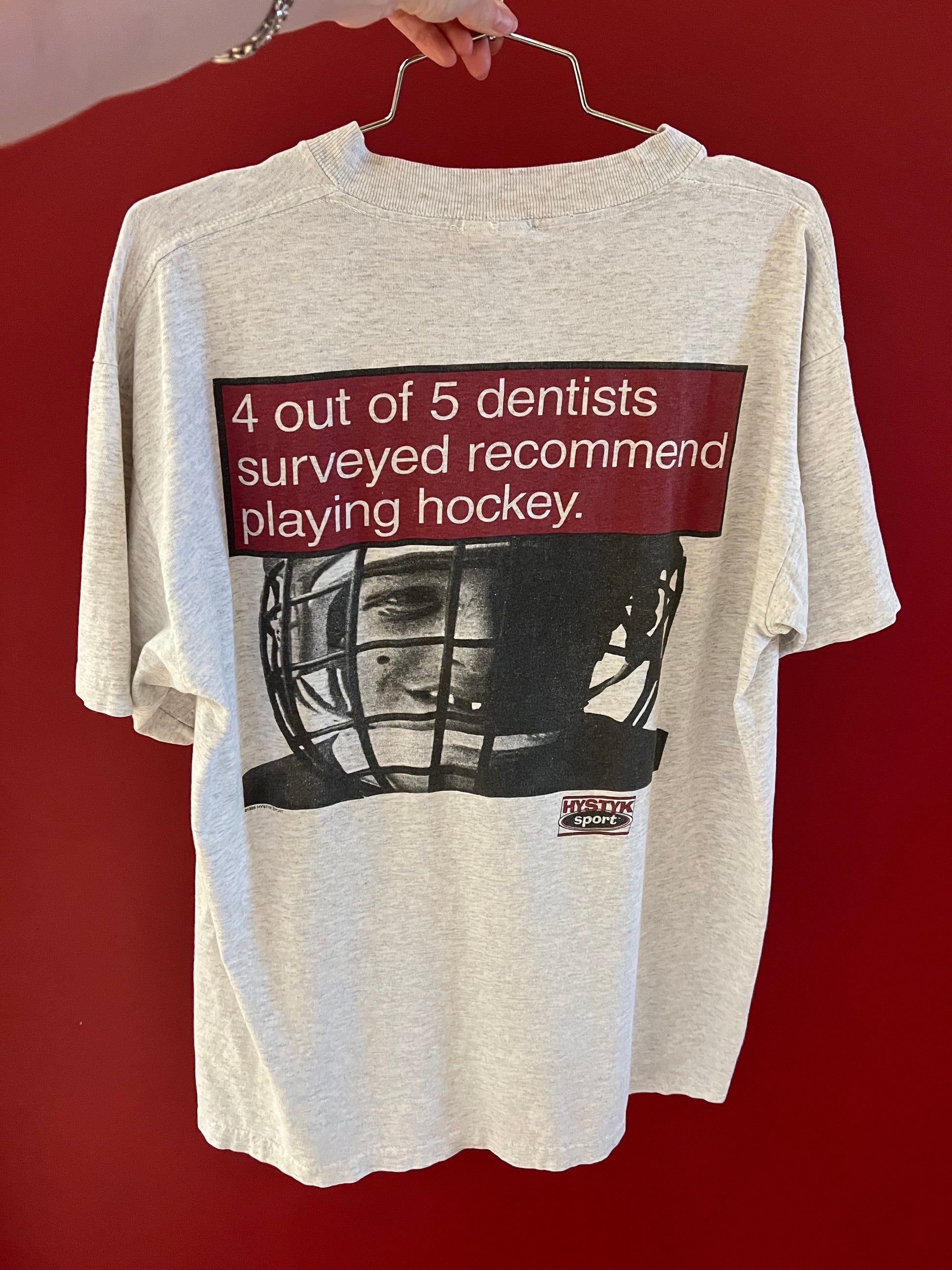 Light grey graphic tee by HYSTYK Sport. Back print “4 out of 5 dentists surveyed recommend playing hockey.”
