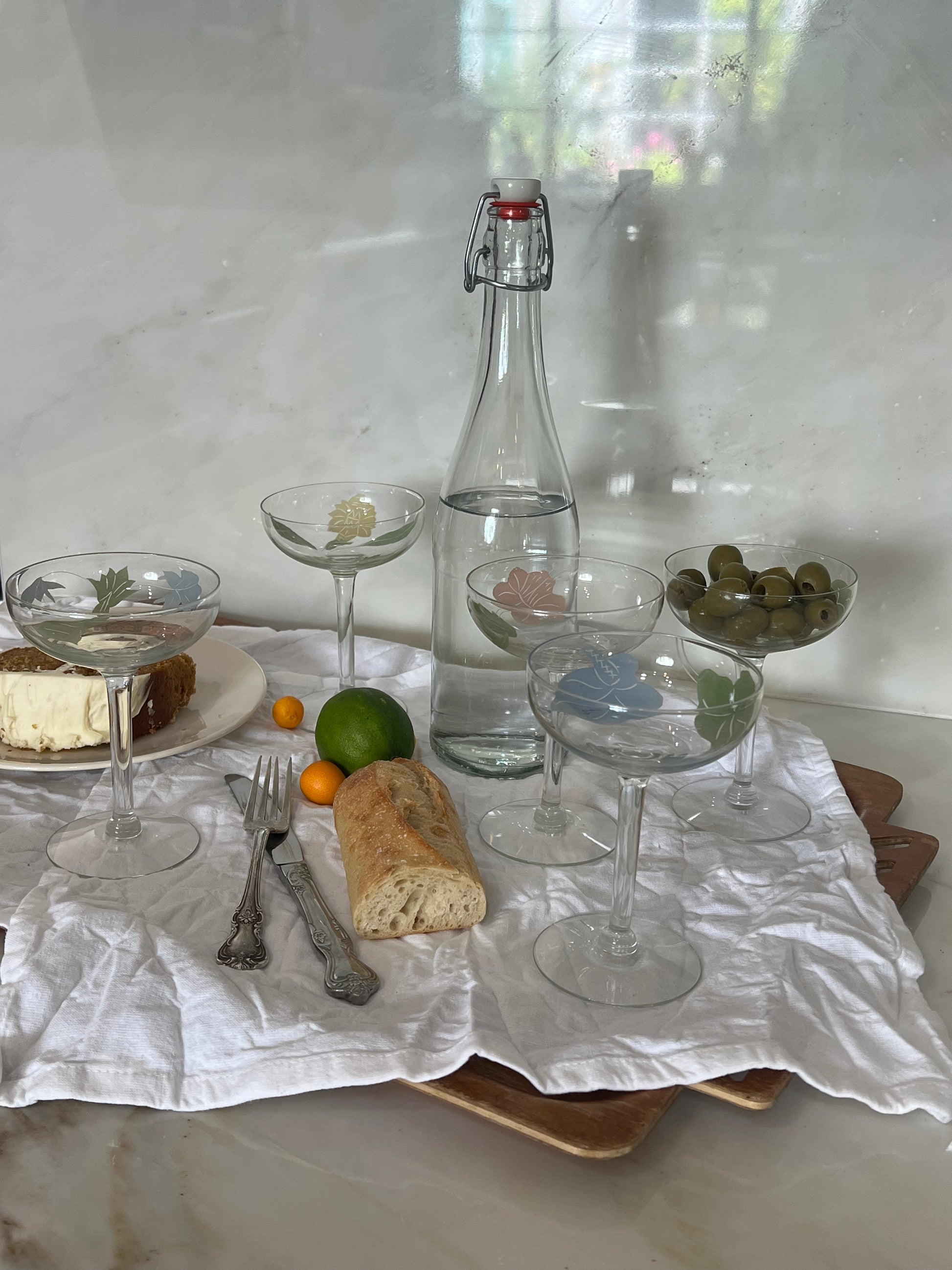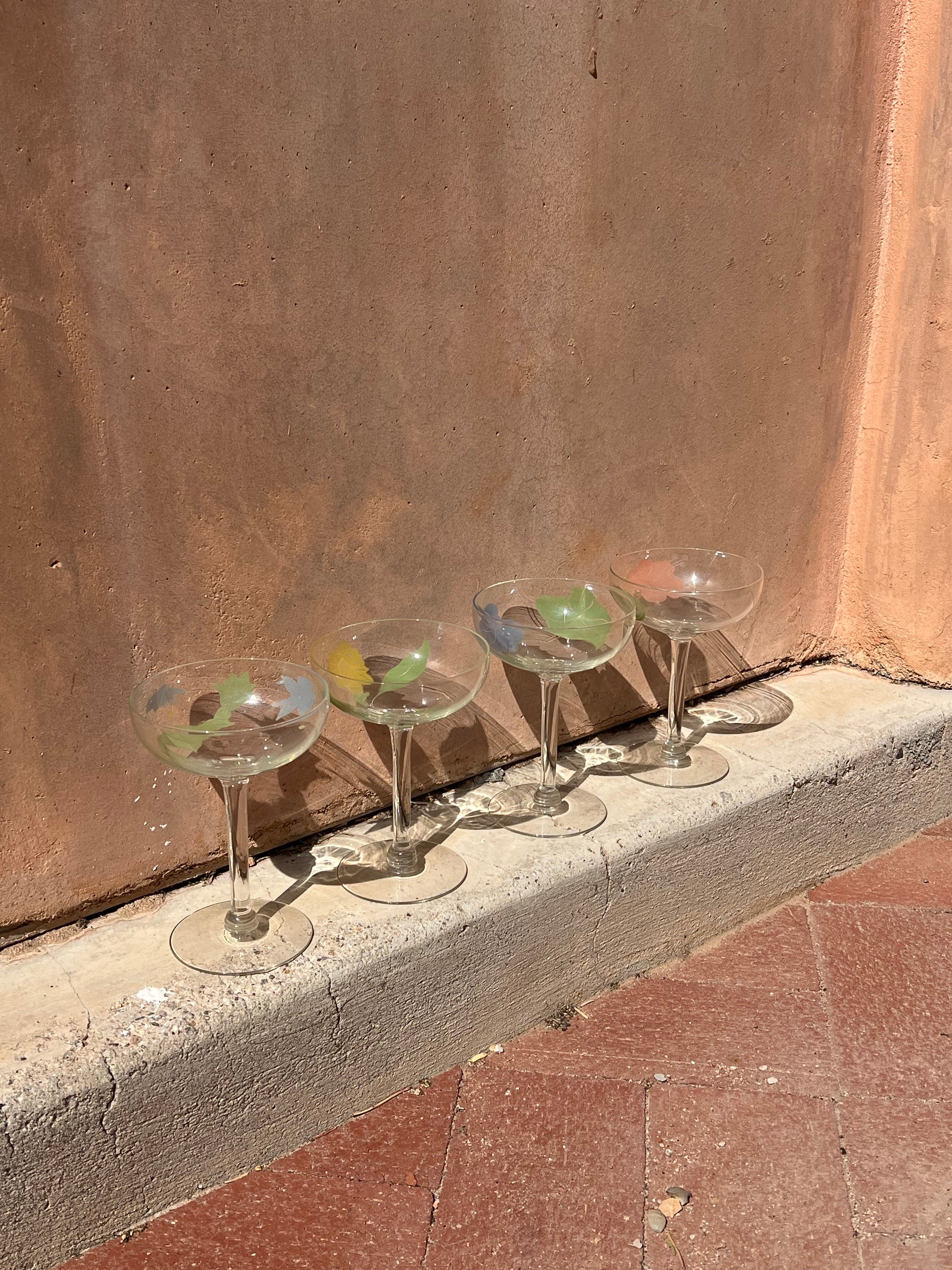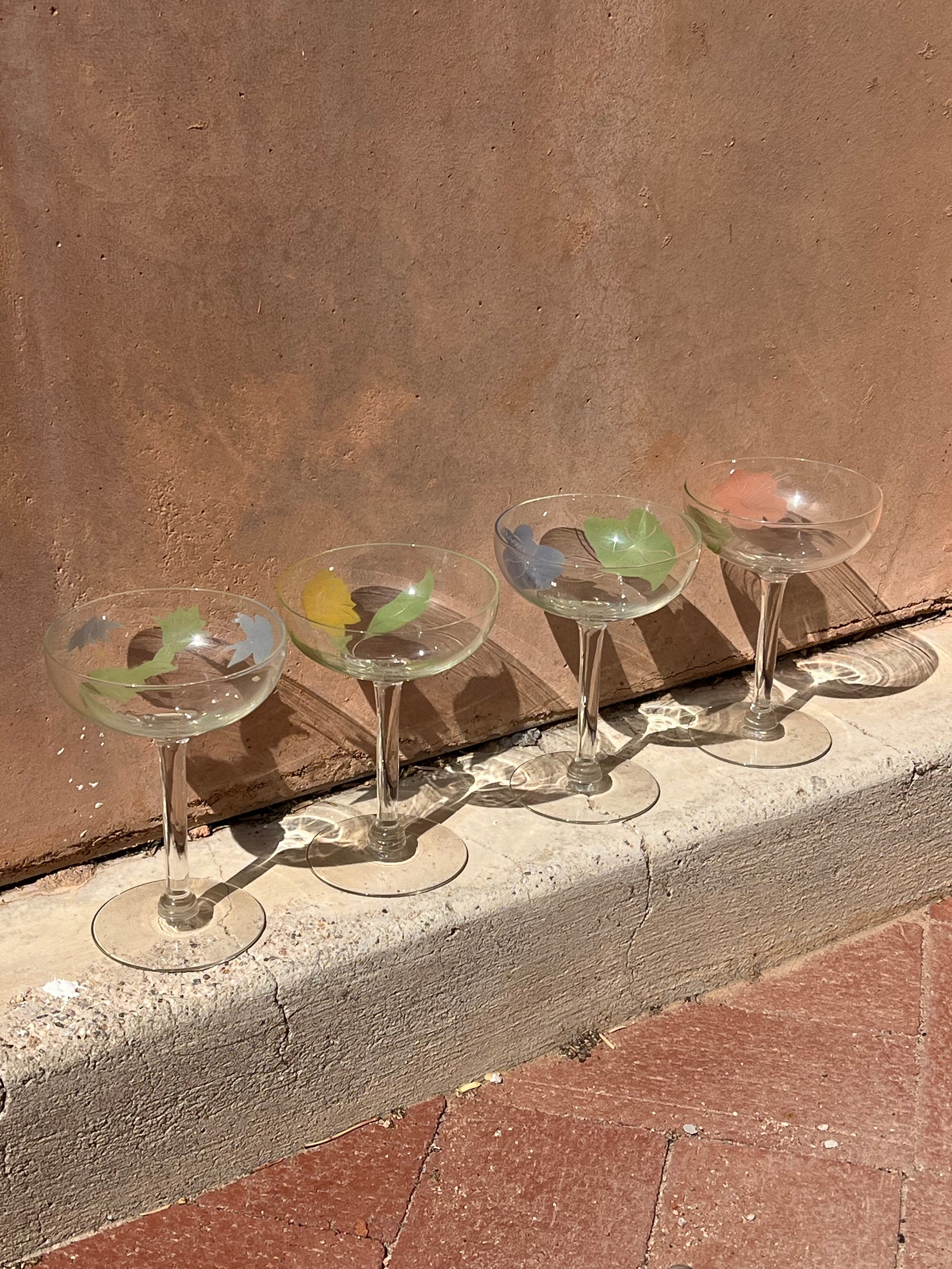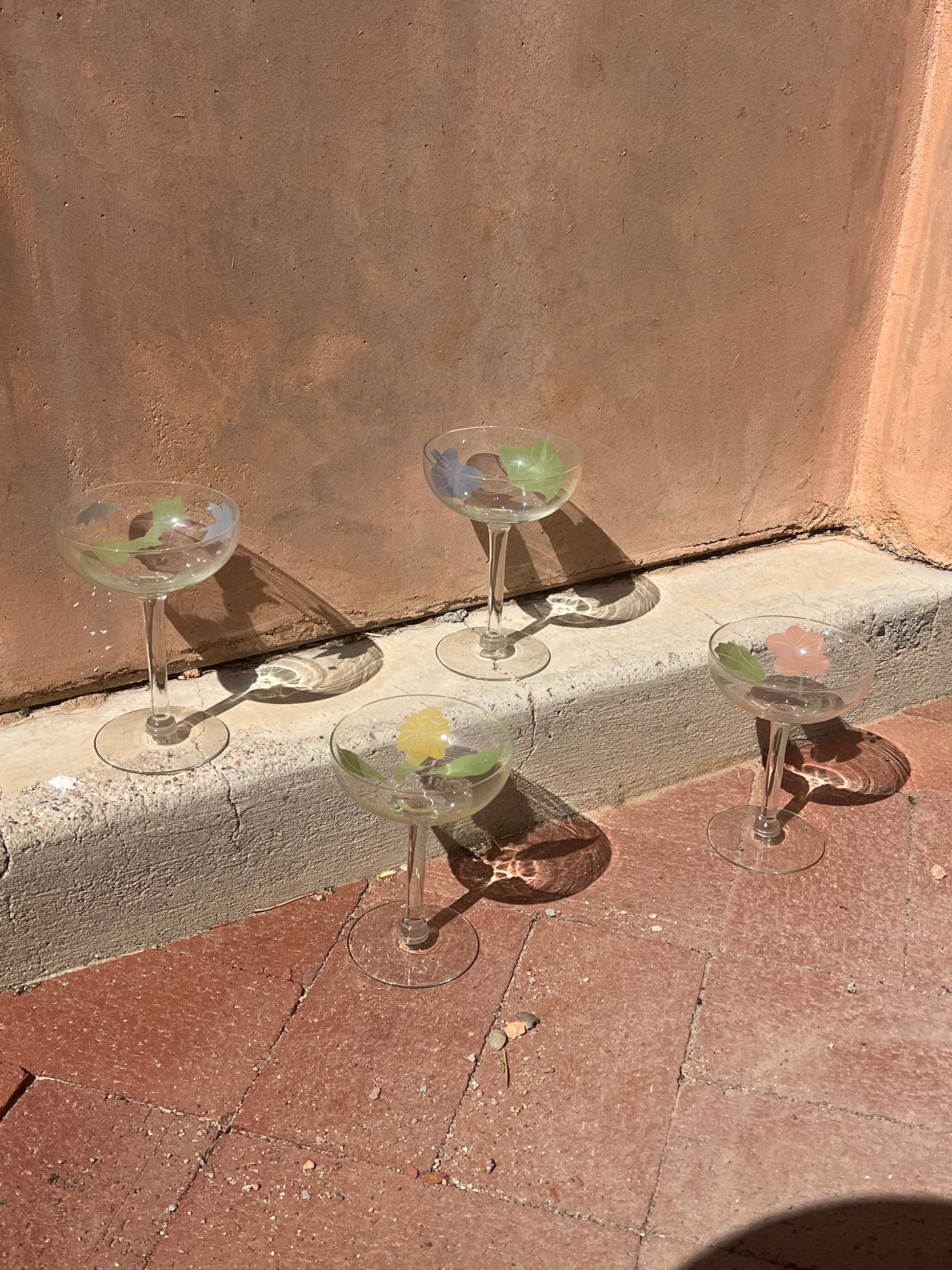 Set of 5 vintage floral pattern gimlet glasses. Delicate and feminine, these glasses are perfect for spring occasions. A unique blue, yellow or pink and green flower on each glass.