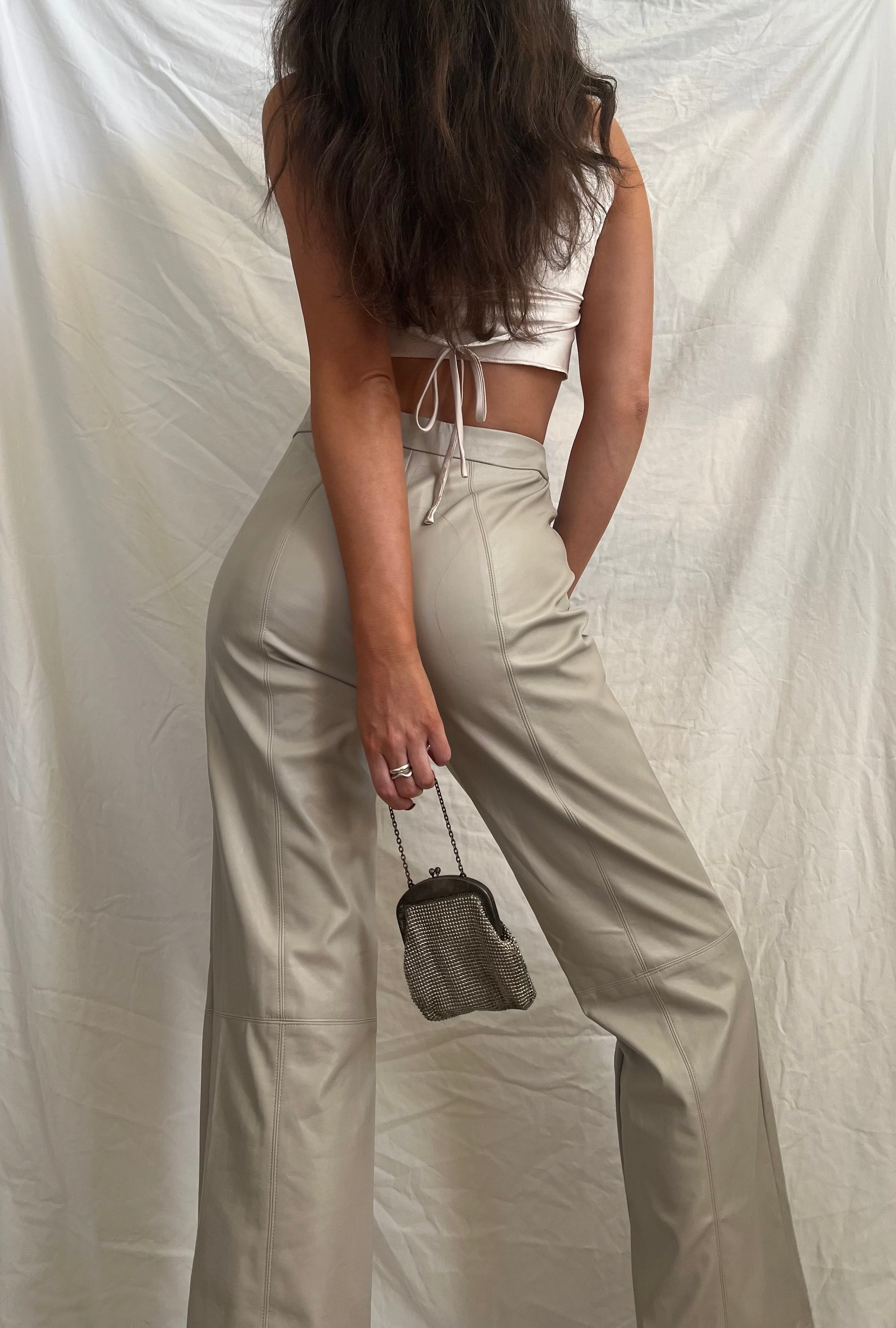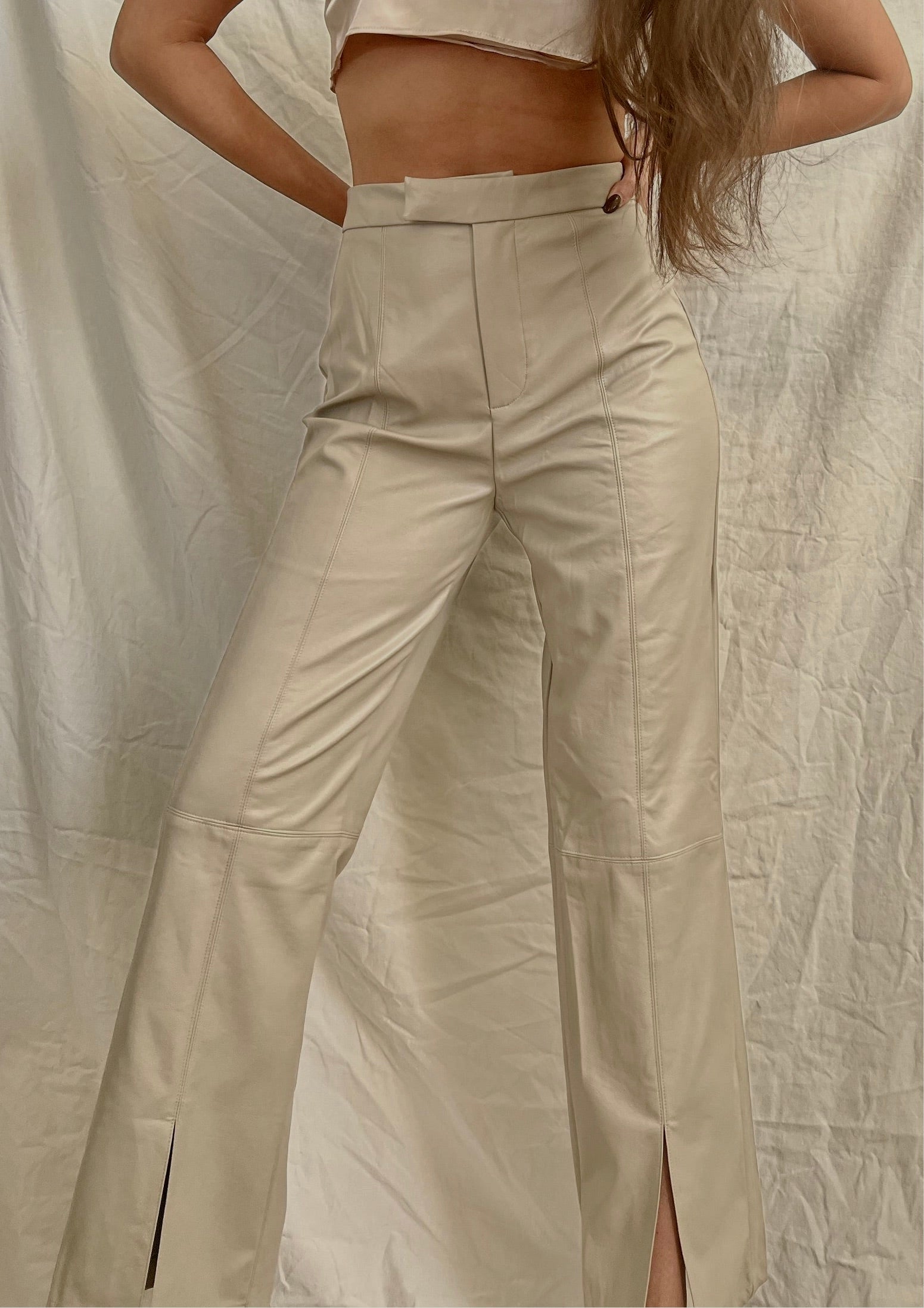 Y2k inspired beige faux leather pants with straight leg and slight flare bottom. Featuring small slits at the bottom of the leg and a super flattering high waist! Pair with anything black for an edgy cold weather look