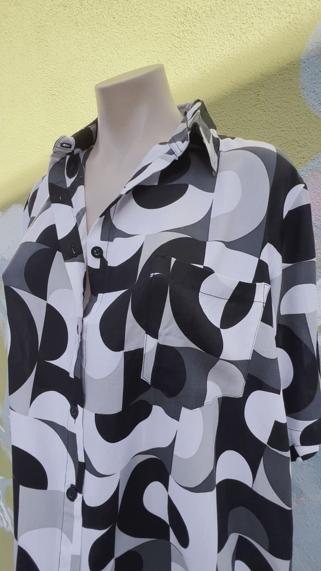 The Jones button down top in retro optic spot pattern by Motel Rocks. This short sleeve button down can be layered over a bikini, or paired with black baggy jeans and a beanie!